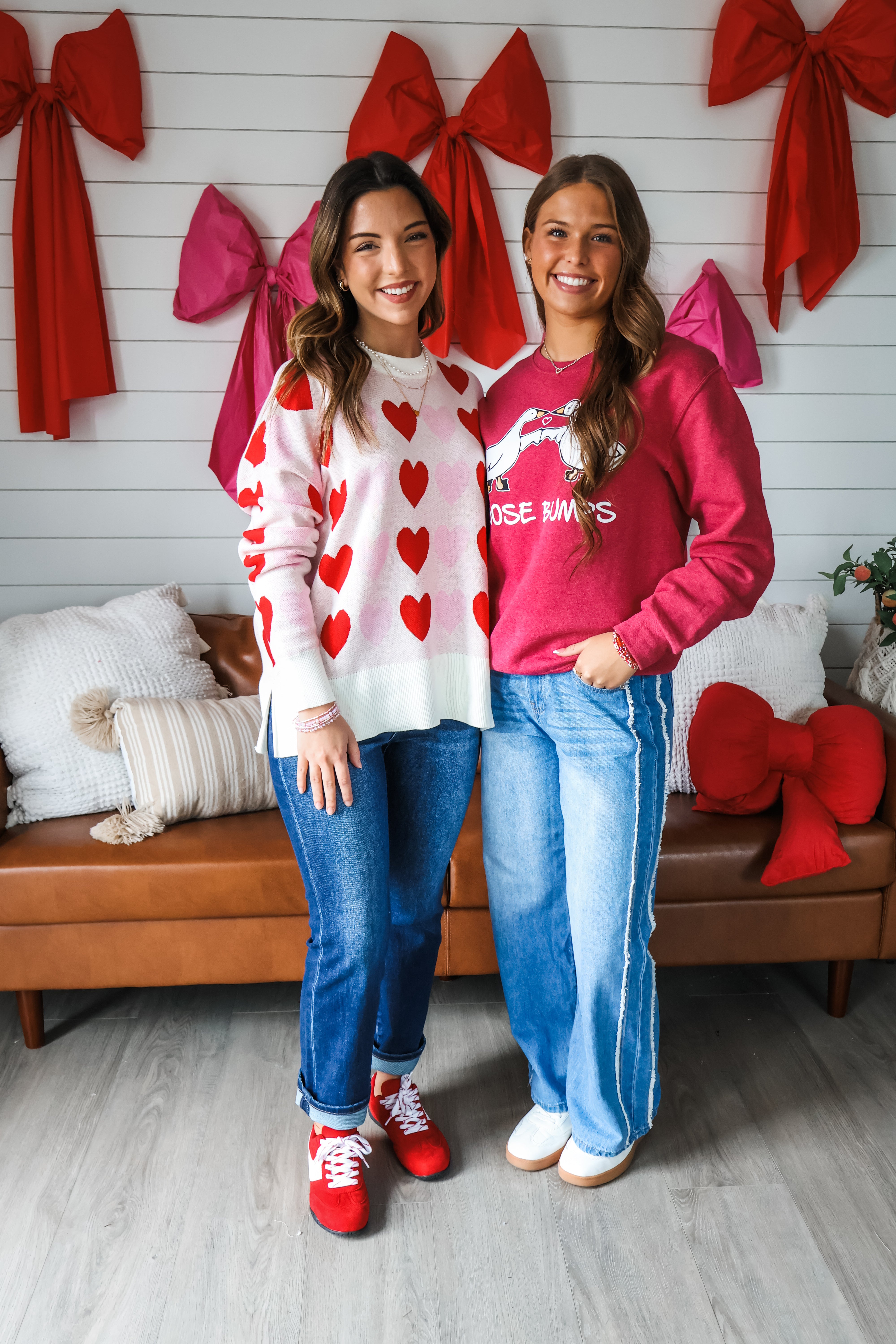 Love is in the air and our latest collection feature eye-catching looks to let you celebrate in style! Crafted from a soft knit with a charming pink and red hearts design, this sweater is an effortless look you can dress up or down season after season. Featuring a classic crewneck with drop shoulder sleeves, contrast rib finishing, side slit hem and a relaxed silhouette.