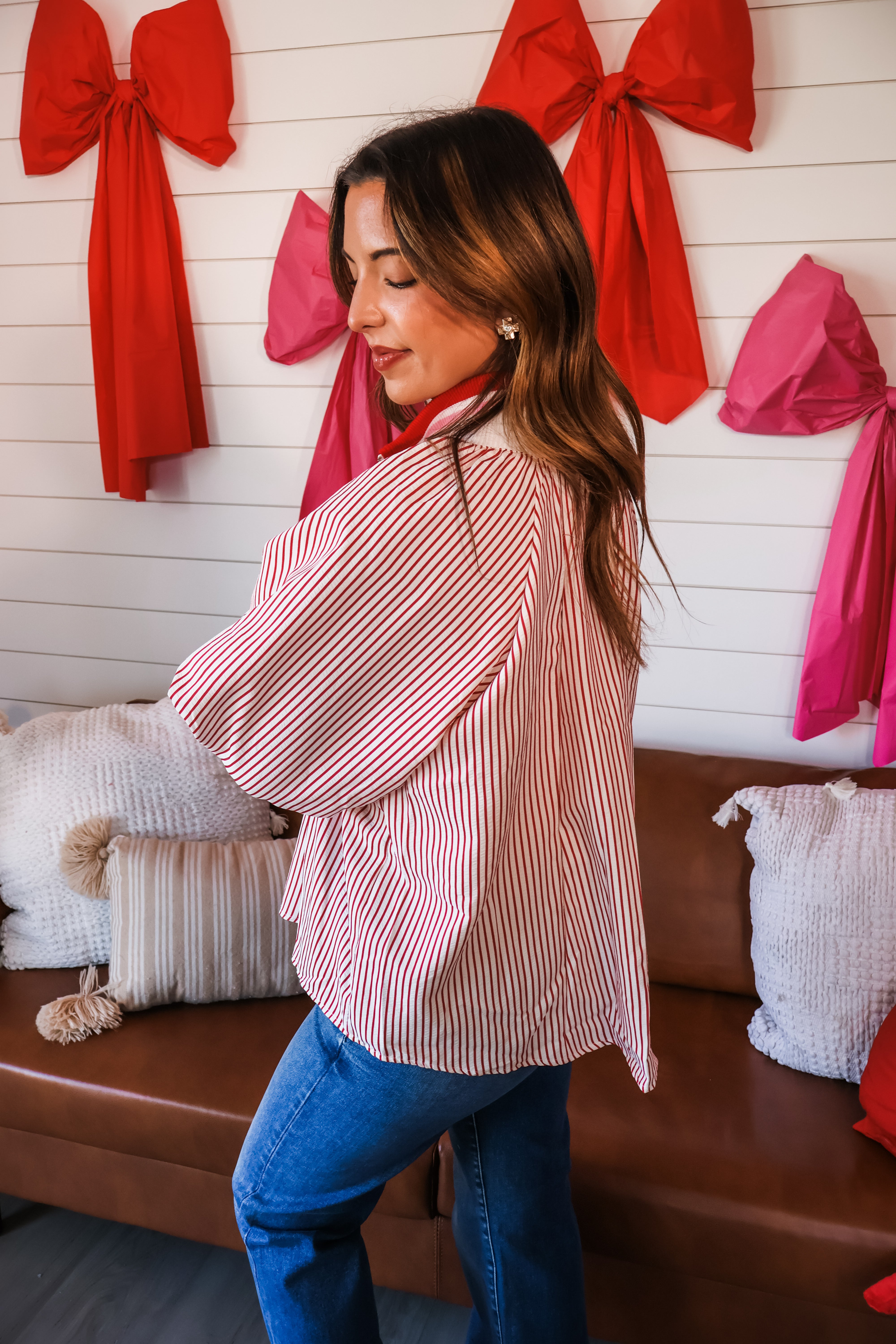 So chic and on-trend, this striped top is a standout look for work or play! The stretch rib collar and cuffs gives it a current flair, while the flowy silhouette provides a flattering fit. Crafted from a textured woven with a half zip neckline, 3/4 length balloon sleeves and a curved hem.