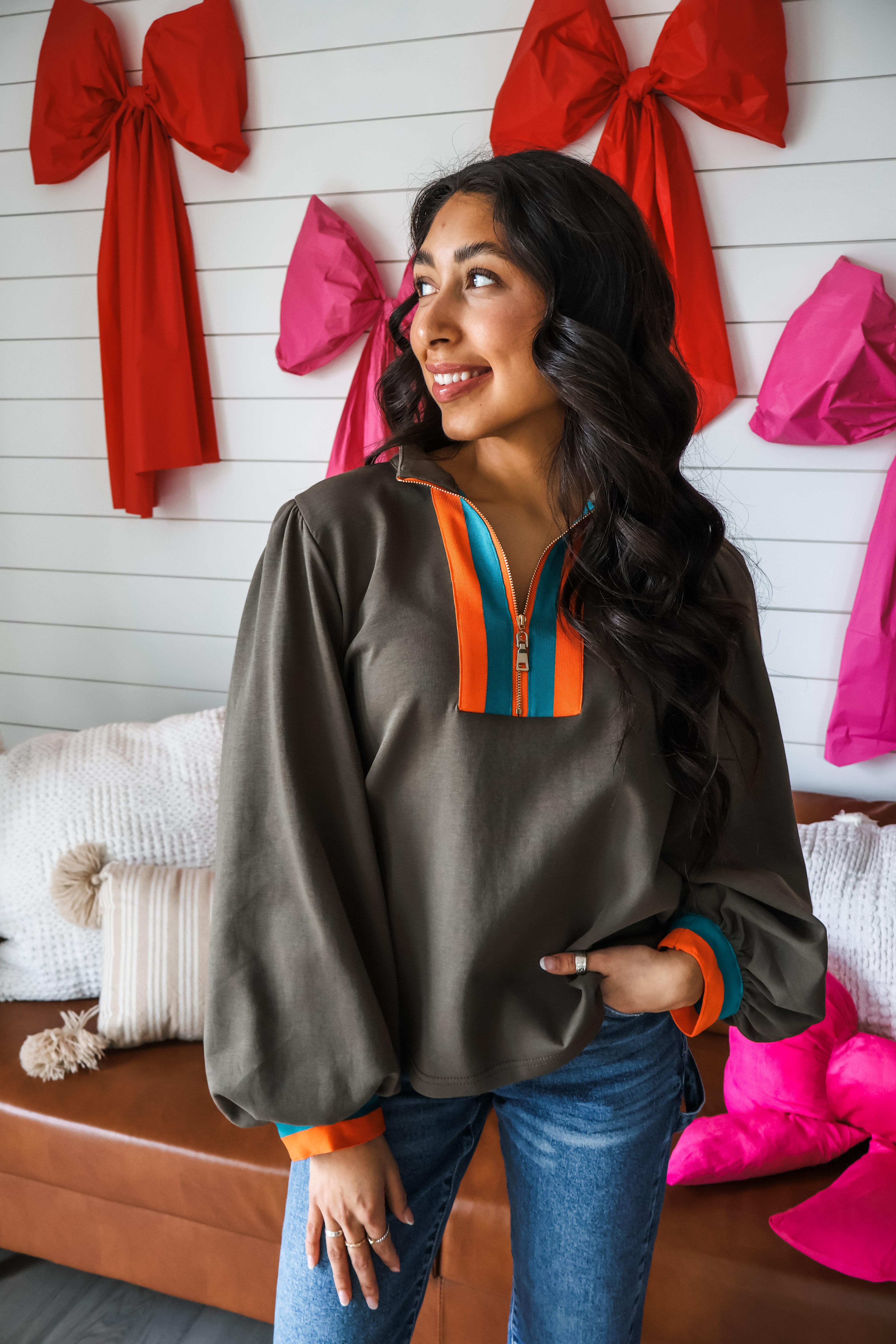 Effortlessly sophisticated styles that make you stand out. Fabricated in a smooth scuba knit, this top combines a striped contrast design with a zip neckline for a look that’s trendy and chic. Featuring a standing collar, lantern sleeves and a flowy silhouette that flatters all, this eye-catching top can be dressed up or down for any day of the week.