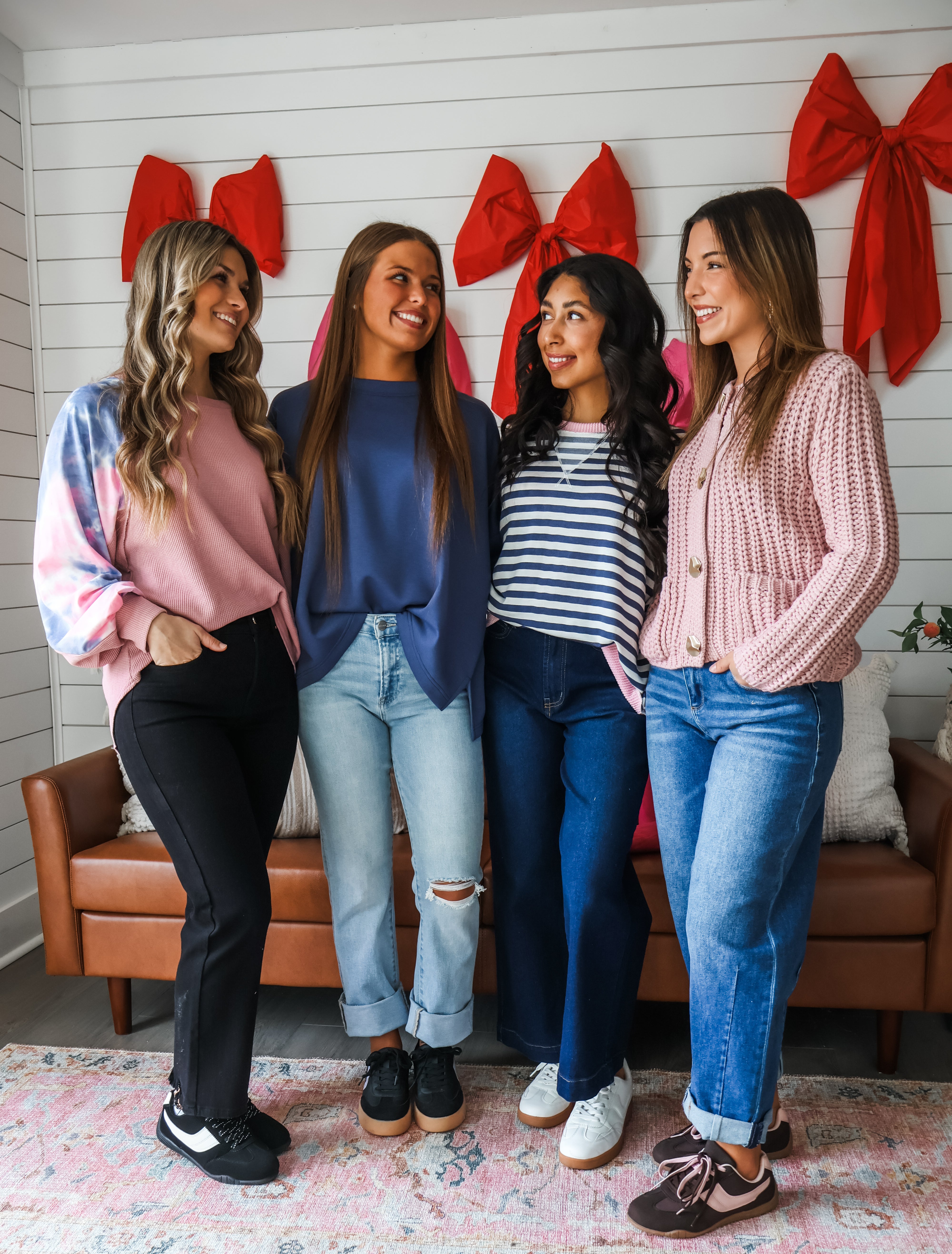 Size + fit: Runs slightly loose. S 0-6, M 6-10, L 10-12. 100% Acrylic. Model is 5’5” and wears a Small.