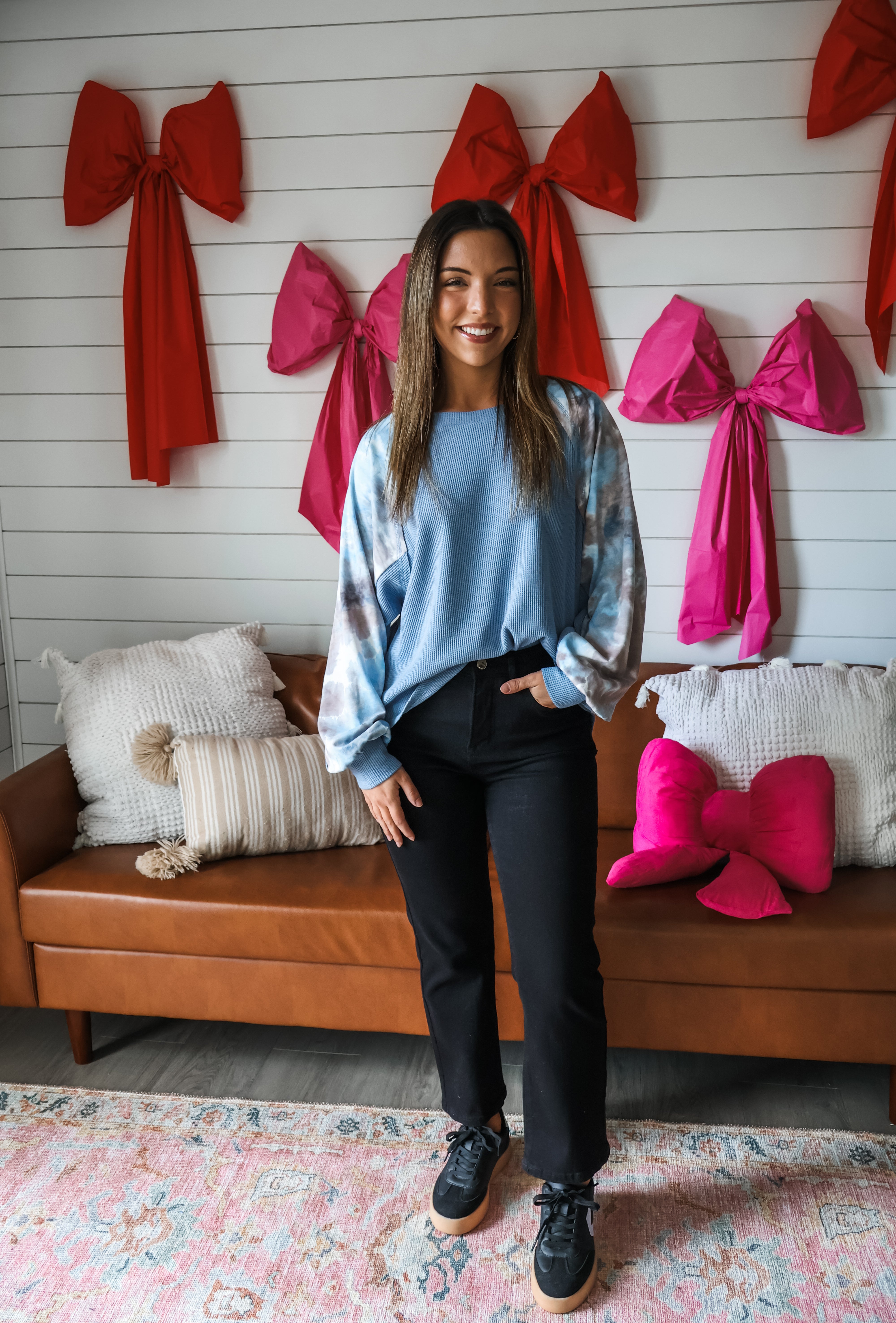 Step into spring with pops of color and print! We are obsessed with the tie dye sleeve design, it’s such a fun contrast against the soft waffle knit! Featured in an oversized dolman silhouette with a crewneck, raglan balloon sleeves, exposed seaming and a curved high low hem.