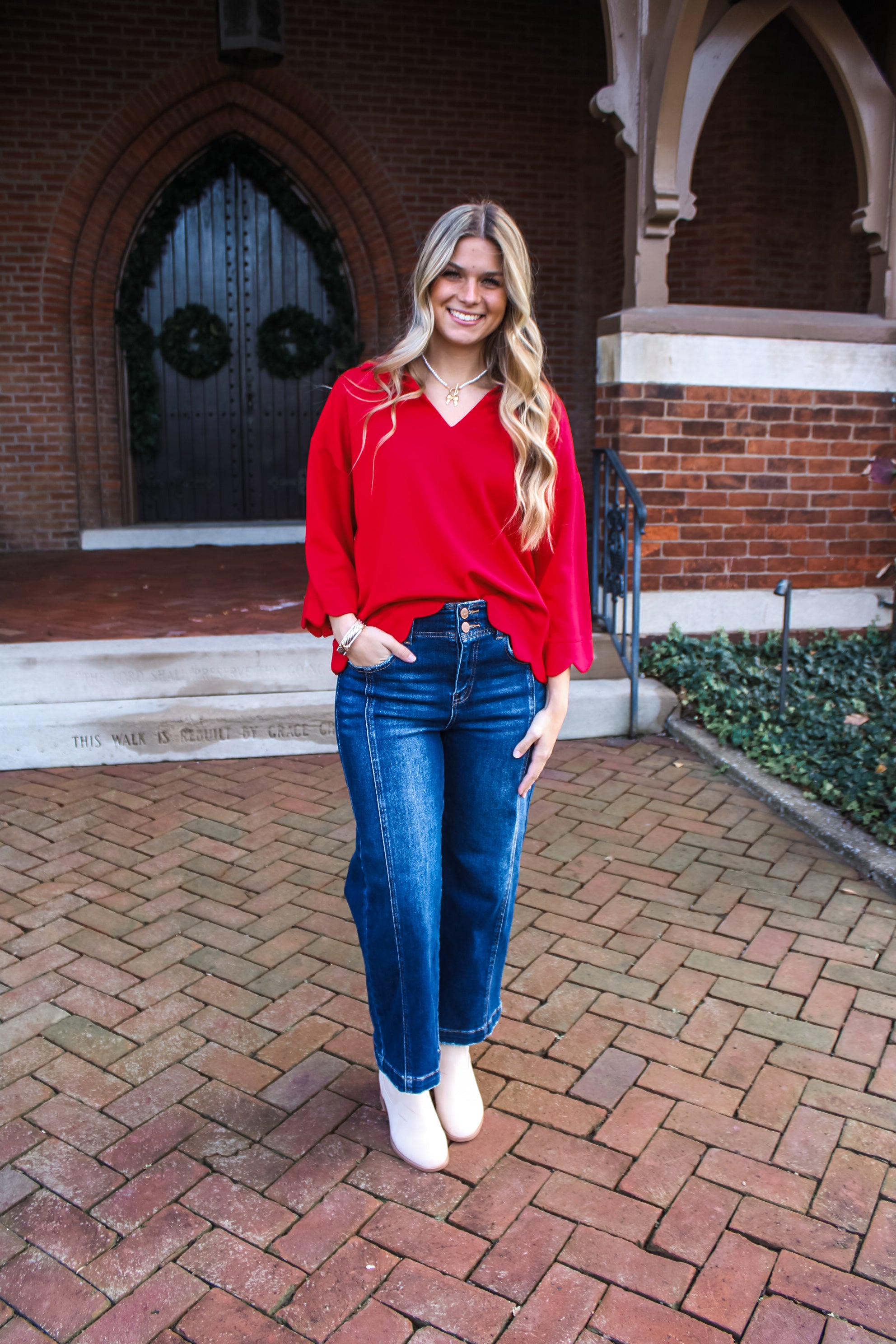 Simple and sophisticated, this blouse makes a polished statement whether it’s dressed up or down. The 3/4 length bell sleeves and scallop hem finishing create a look that’s feminine and flattering. Crafted from a smooth scuba knit with a collared neckline and flowy silhouette.