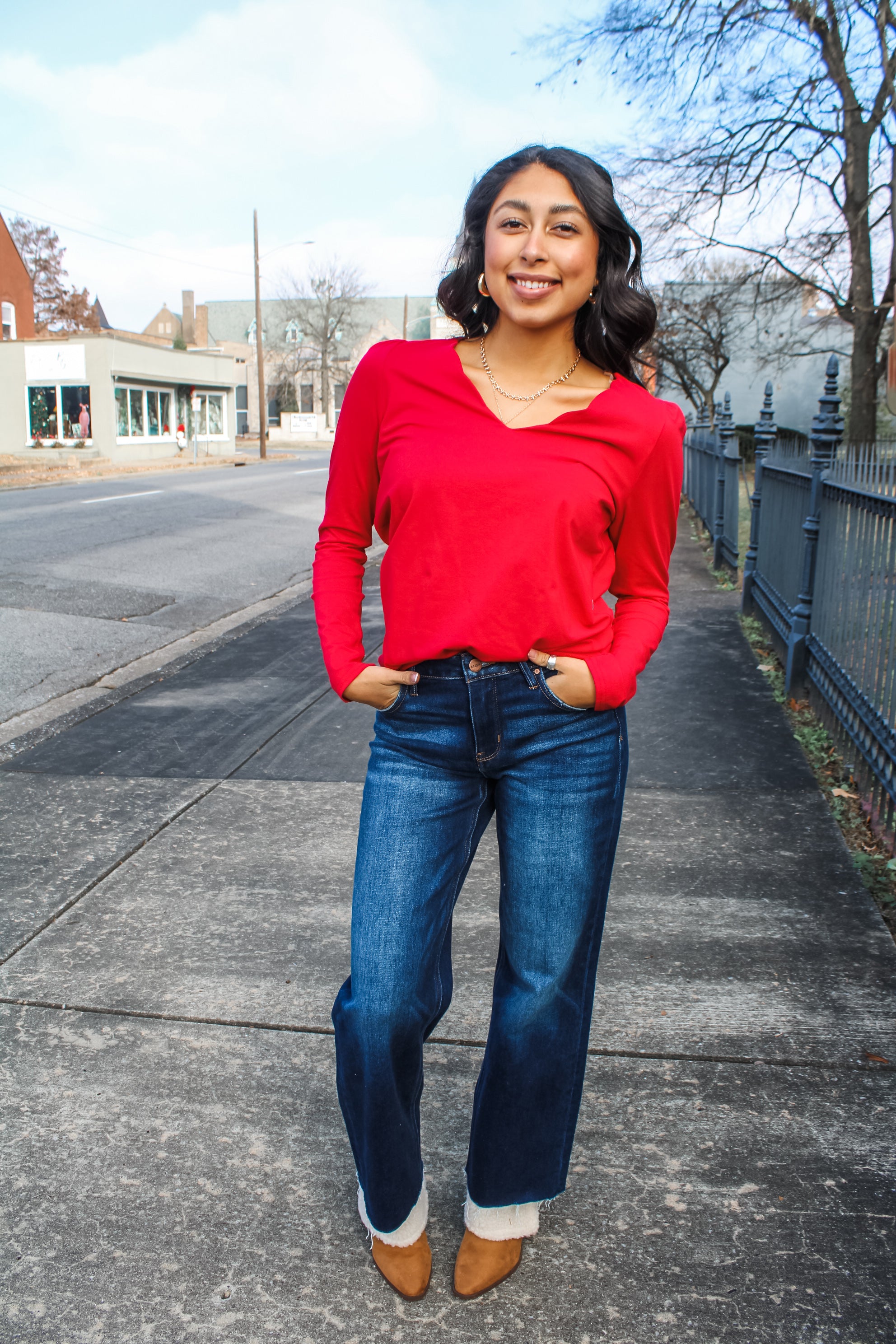 Sophisticated essentials for an elevated style. So soft and comfy in a stretch cotton knit, this wear-anywhere staple is a versatile look you can dress up or down for work or play. Featuring a scallop edge v-neckline and a simple silhouette that’s perfect for tucking into jeans or layering under flannels and vests.