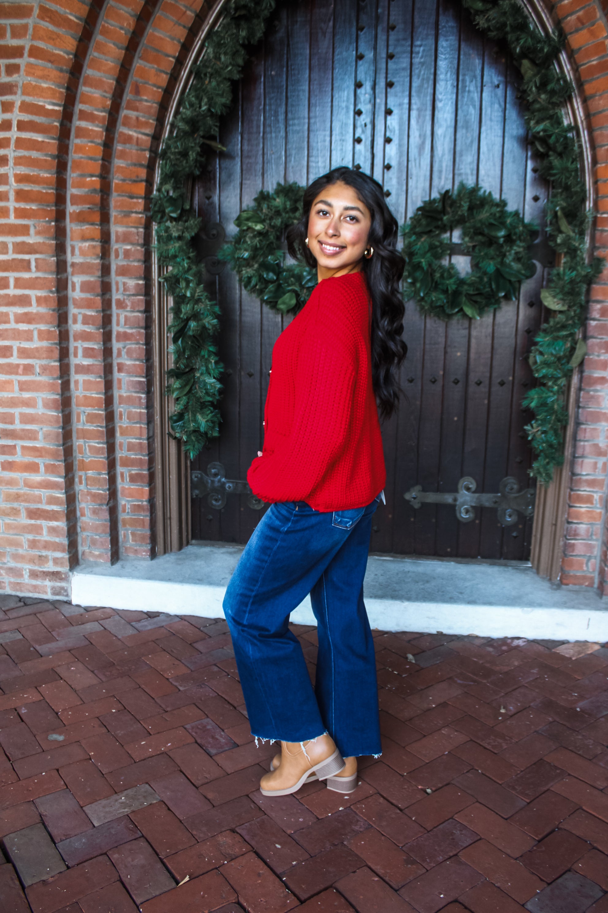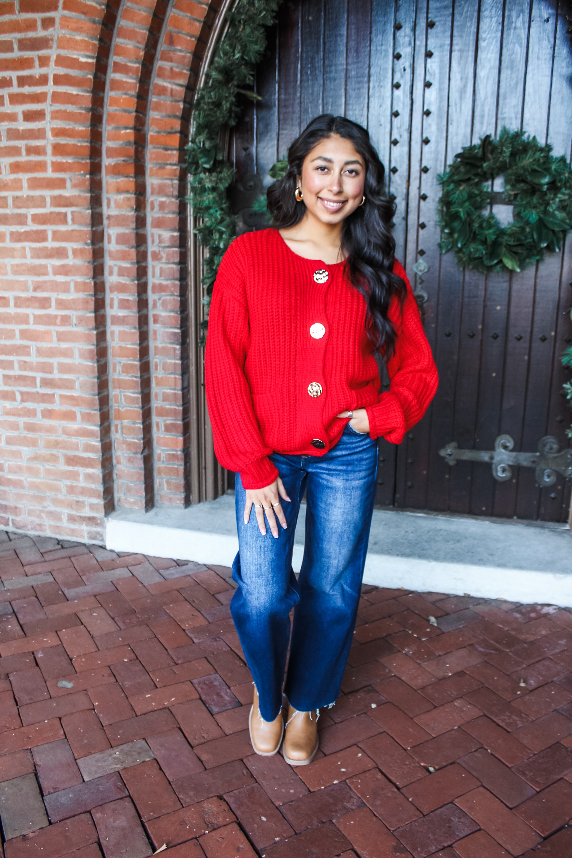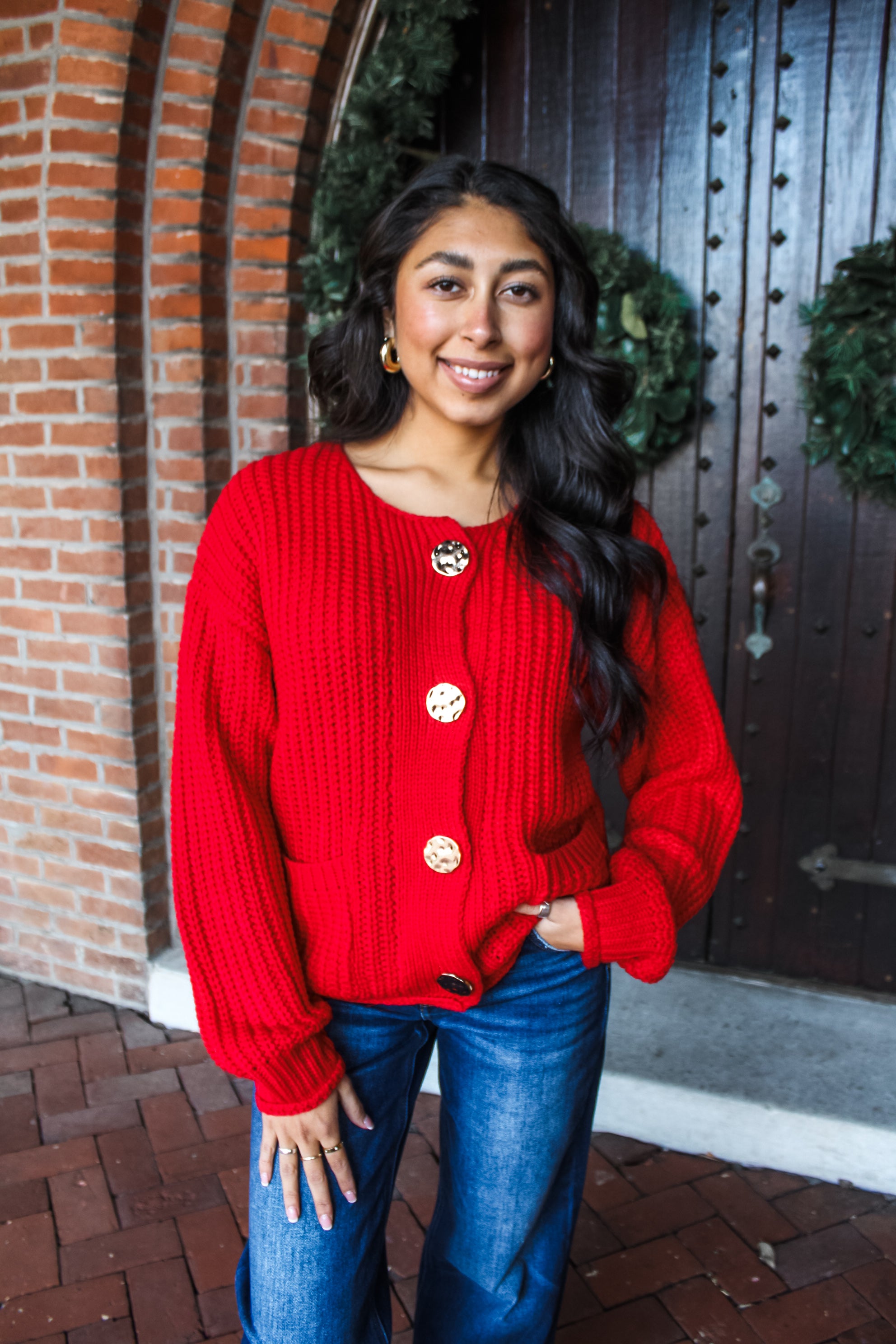 Cozy up in a chunky cardigan sweater! Fabricated in a ribbed braided knit, this winter must-have will add a layer of texture and warmth to any outfit! Featuring double pockets, hammered gold buttons, and a relaxed fit that’s made for layering.