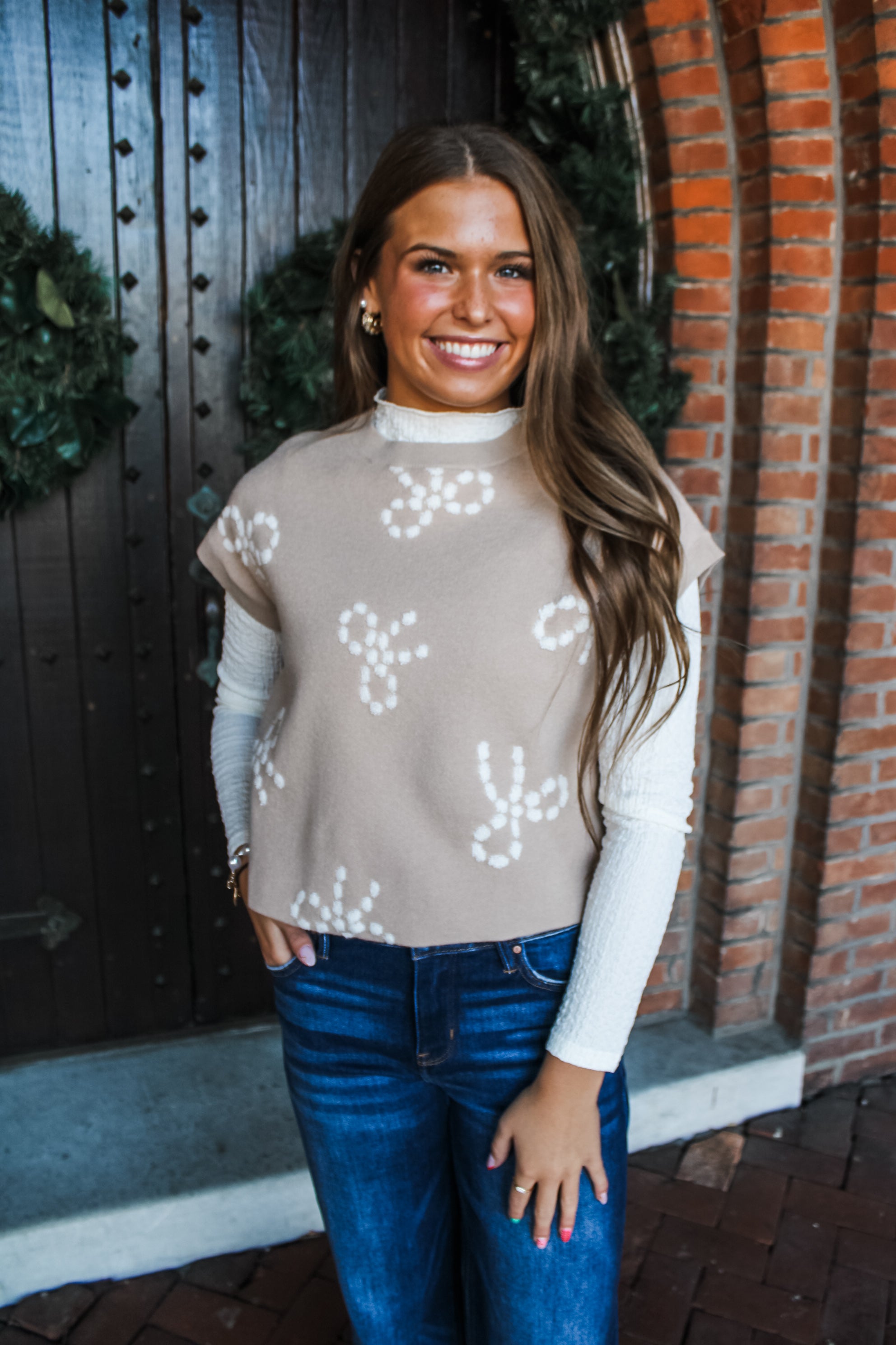 Add a chic and cozy feel to your winter wardrobe. This simple yet sophisticated sweater vest is fabricated in a soft knit for a beautifully textured bow design. Featured in a relaxed crewneck silhouette, it’s a versatile look you can wear on its own or tossed over button ups, basic bodysuits and printed mesh knits.