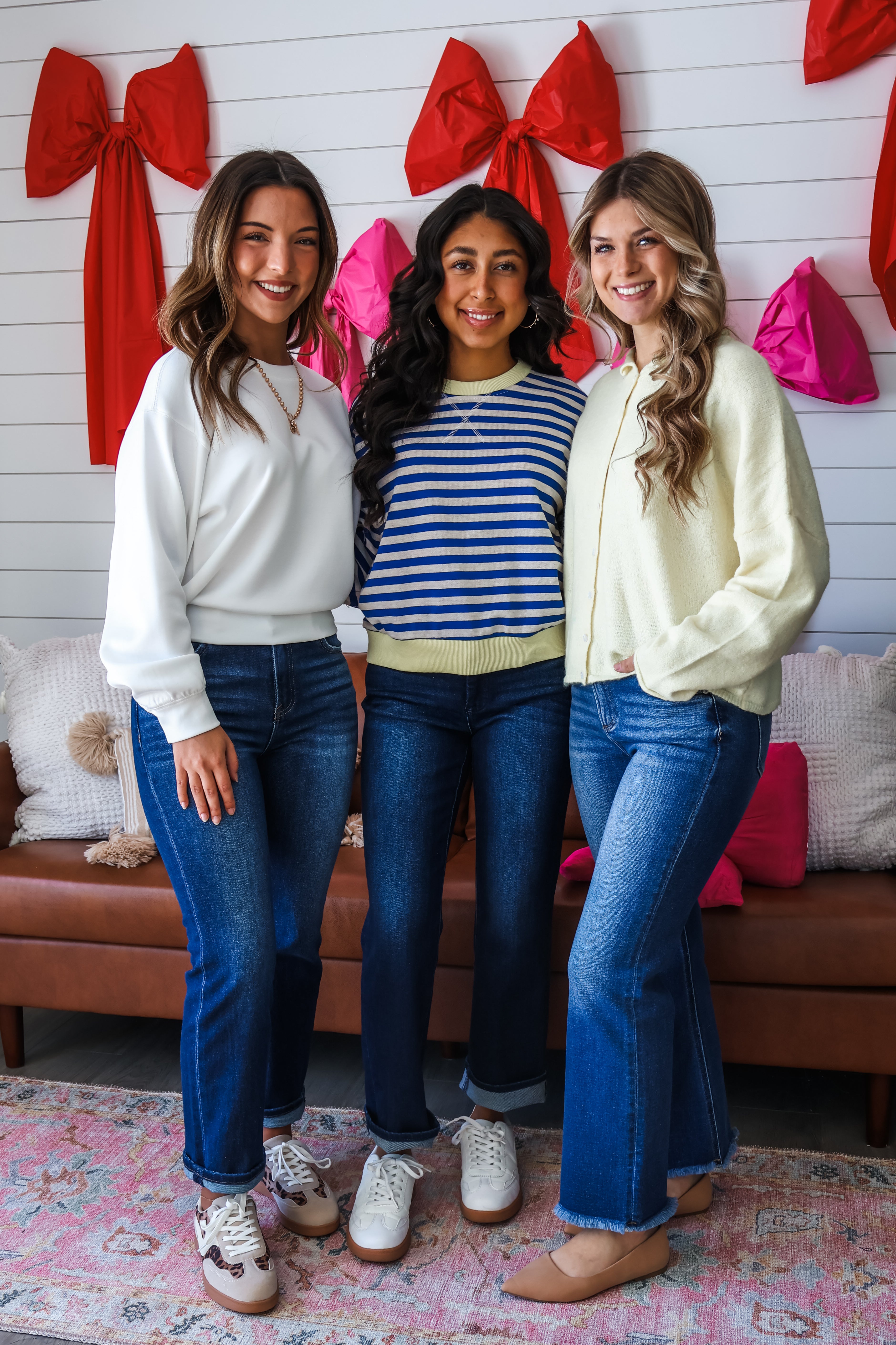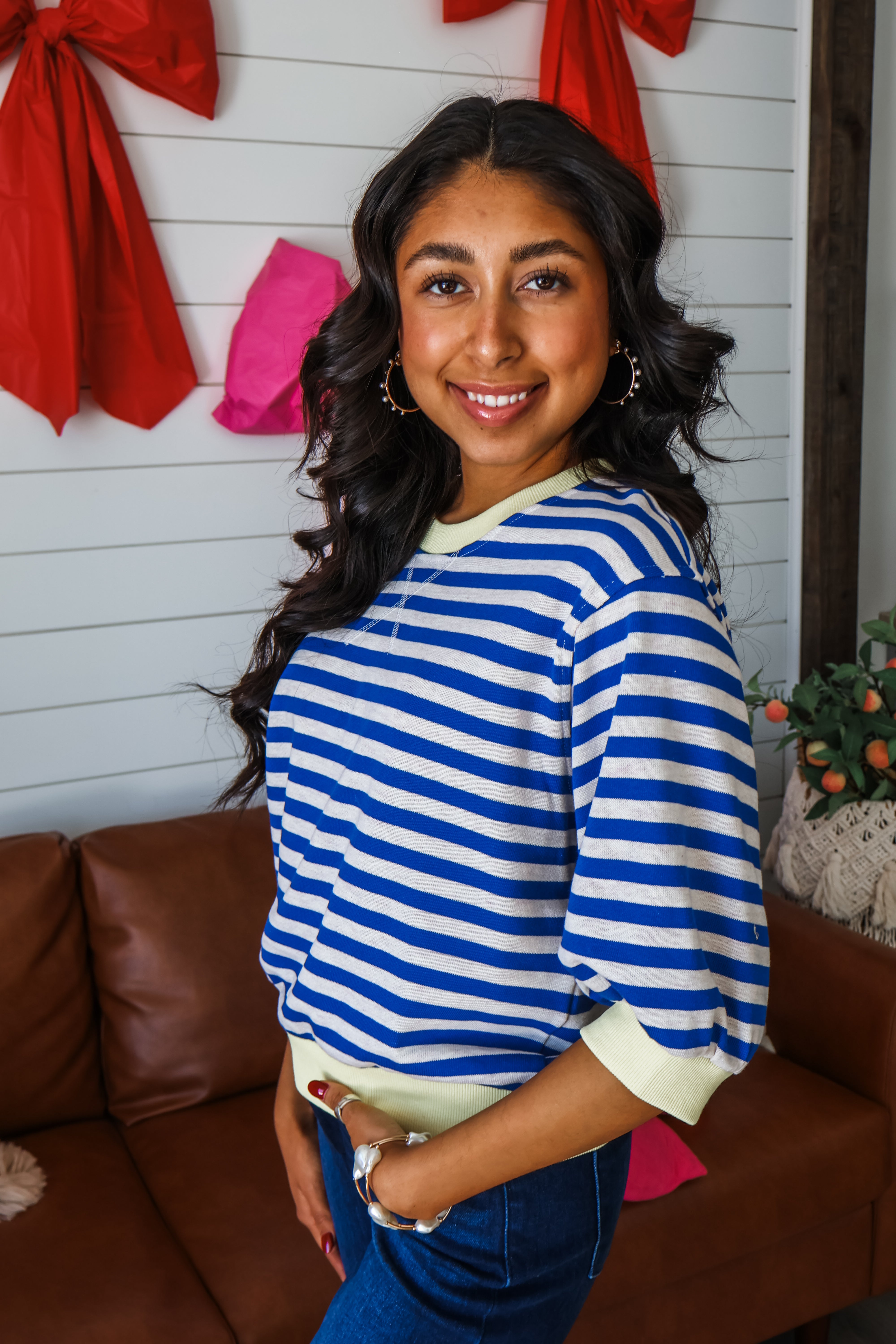 Refresh your style with fun stripes! This playful top features a ringer contrast design and fresh colorways that are perfect for spring! Fabricated in a cotton-blend knit with a classic crewneck, elbow length sleeves and a loose silhouette that hangs over the body for an easy and comfy fit.