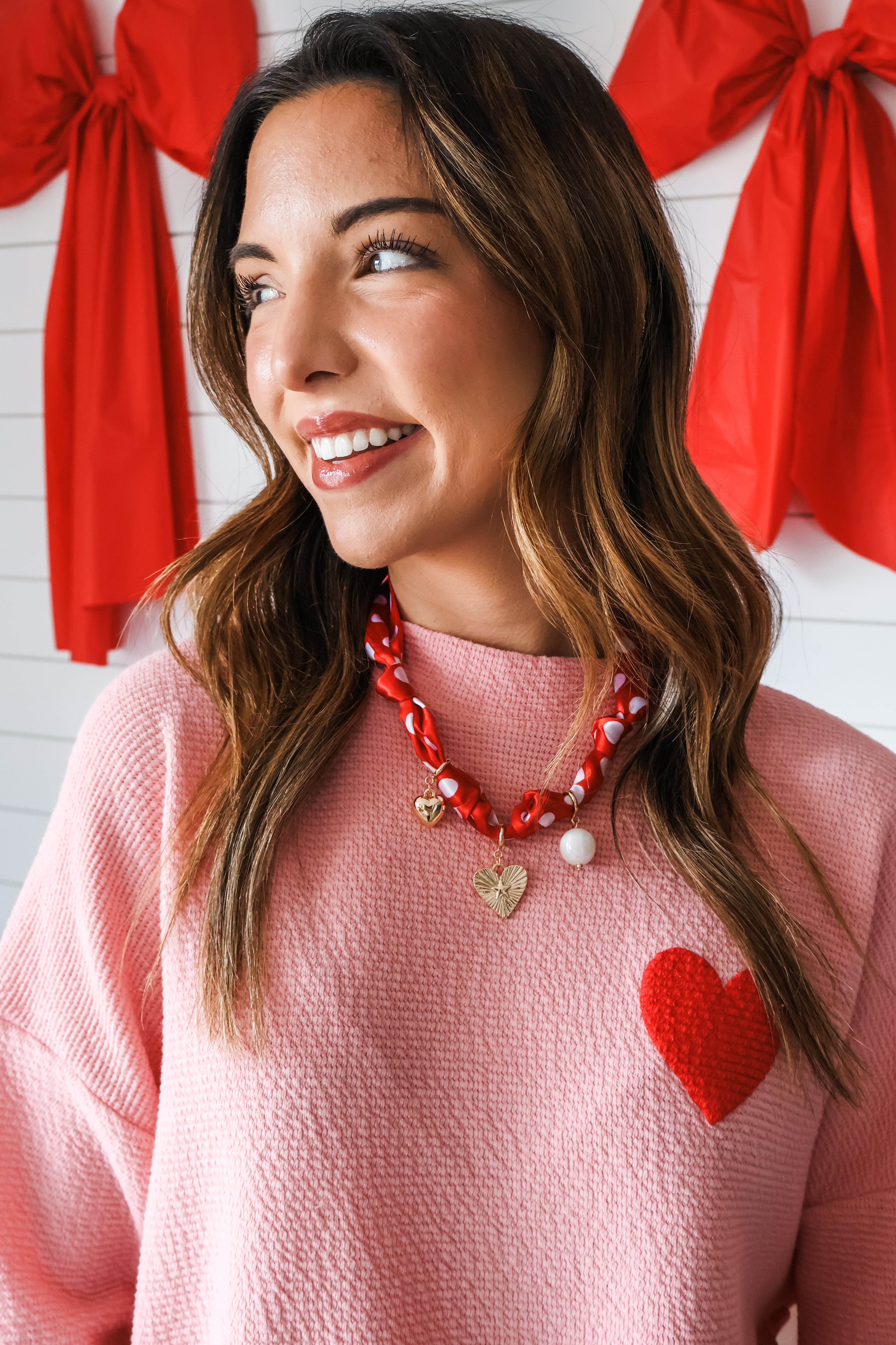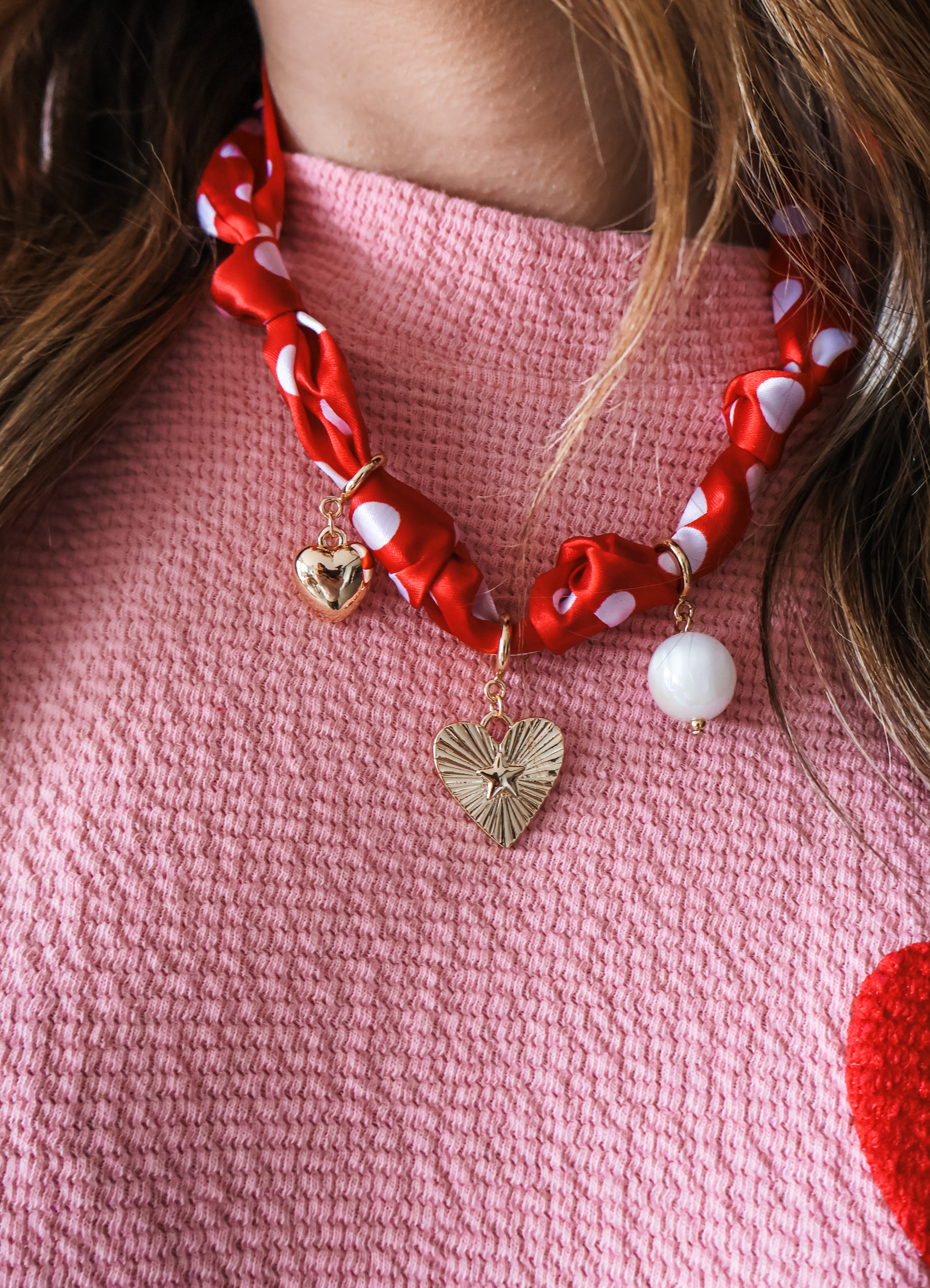Love is in the air and this scarf necklace with add a playful touch to your everyday looks! This trendy style combines the softness of fabric with the elegance of a charm pendant, creating a unique piece that effortlessly enhances any outfit. Manual tie for closure and a custom fit. It’s a truly eye-catching look that’ll take any outfit to the next level.