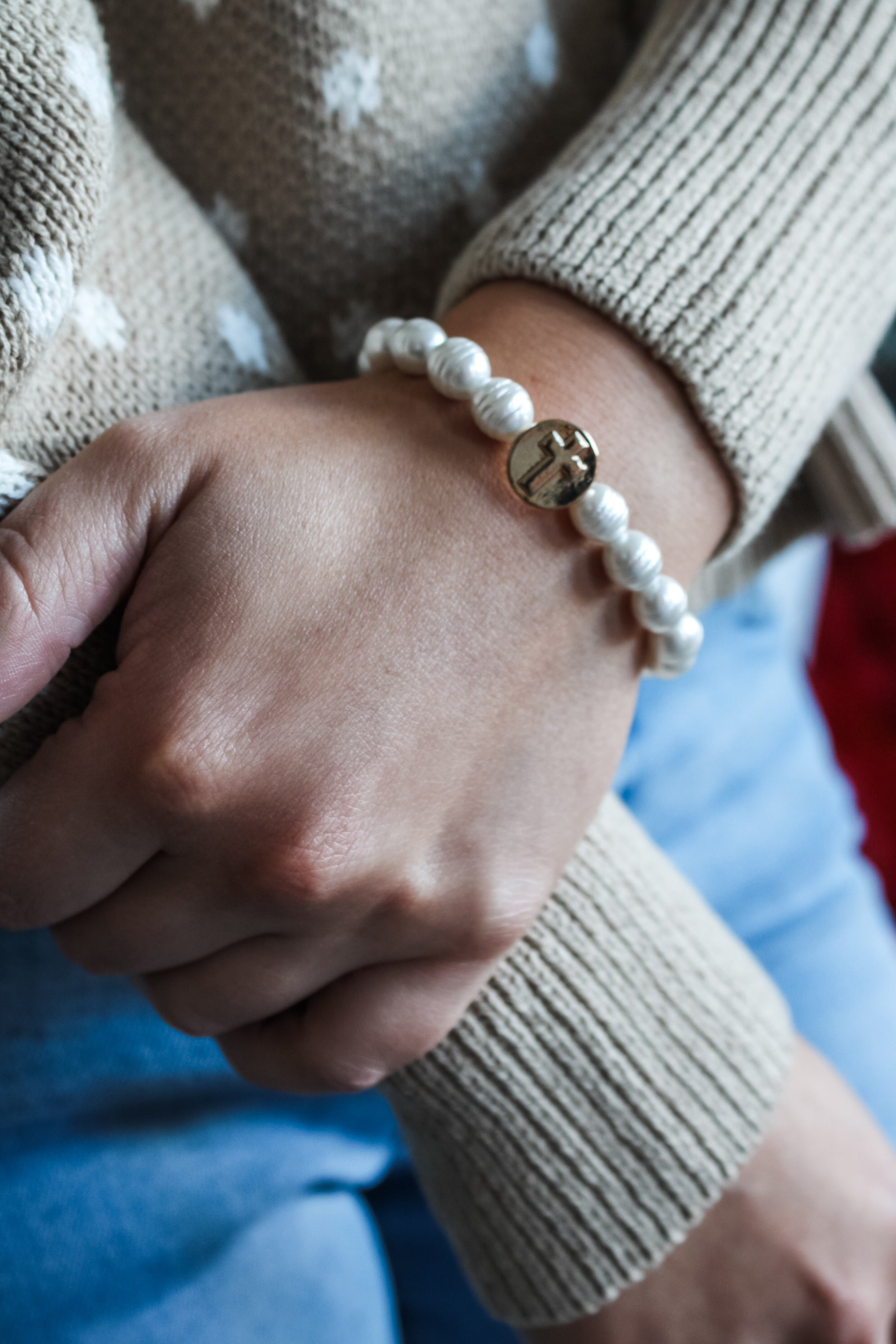Add a dose of faith and shine to your holiday style. Materials may have natural variations. Colors may vary from different viewing devices and lighting. Final sale item.