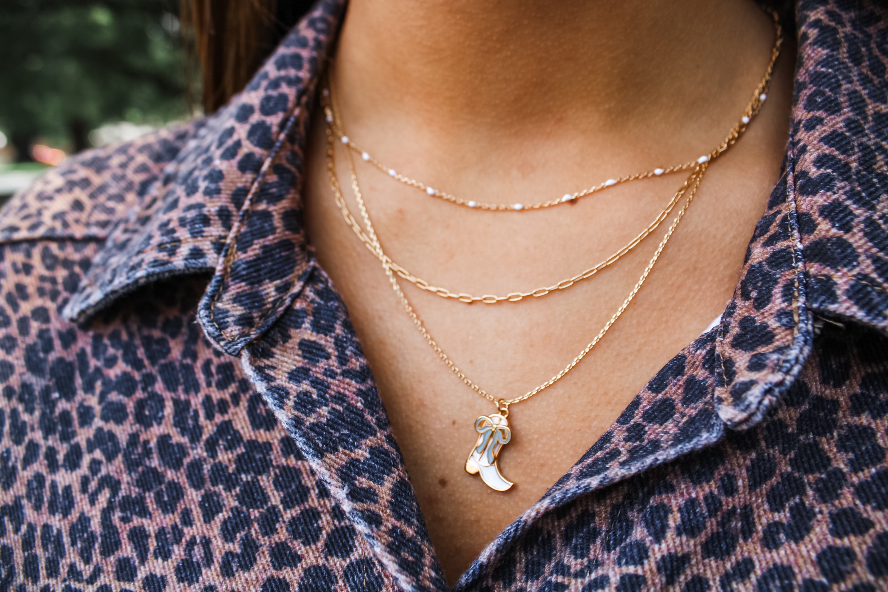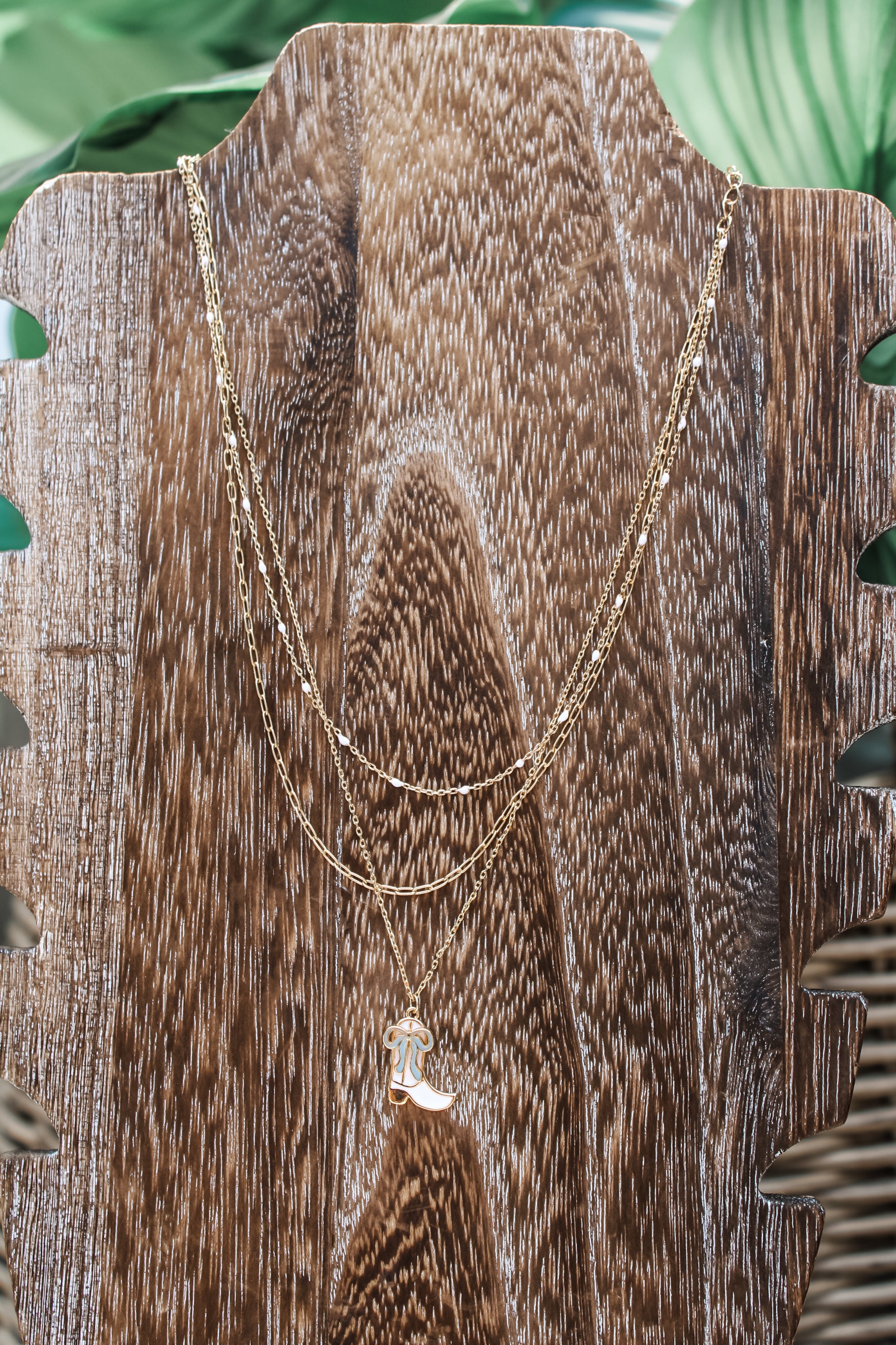 So cute and charming, this gold necklace will add a cowgirl chic touch to any outfit! Featuring a 3-layer chain with a pretty enamel boot pendant and lobster clasp closure.