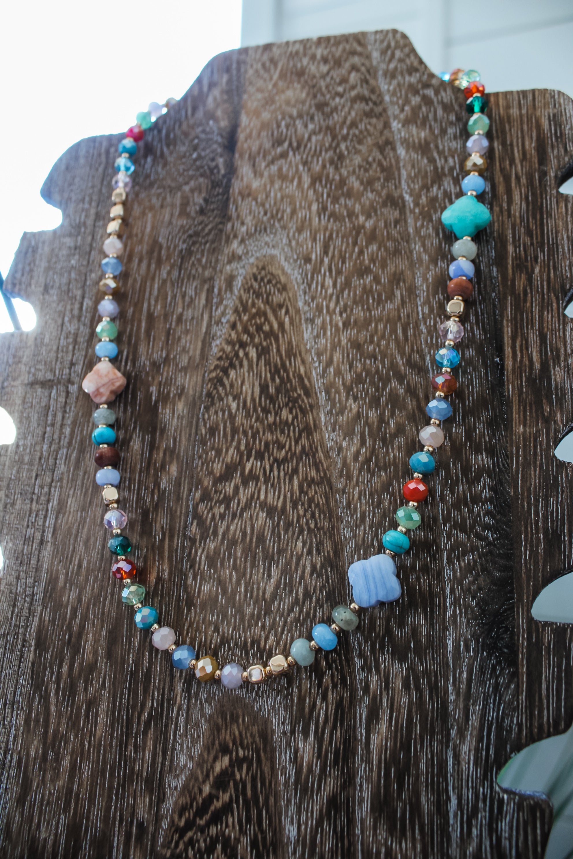 So cute and charming, this necklace will add a sophisticated sparkle to any look. Featuring multicolor faceted beads, polished stone beads and clover charm accents with a lobster clasp closure.
