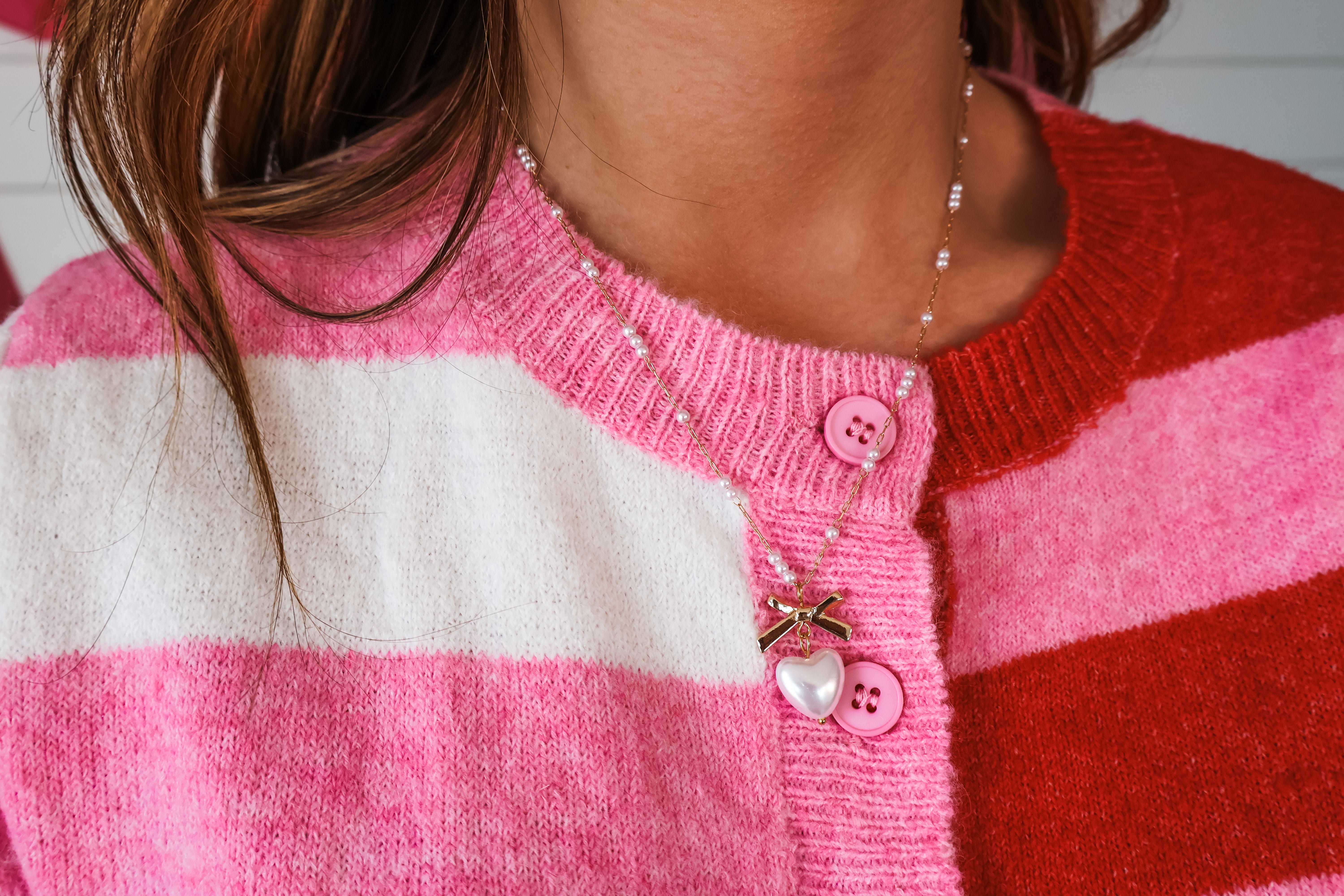 Love is in the air and our latest jewelry collection is the perfect finishing touch for your Valentine’s Day looks! This beautiful necklace features a pearl bead chain with a bubble heart pendant and lobster clasp closure.