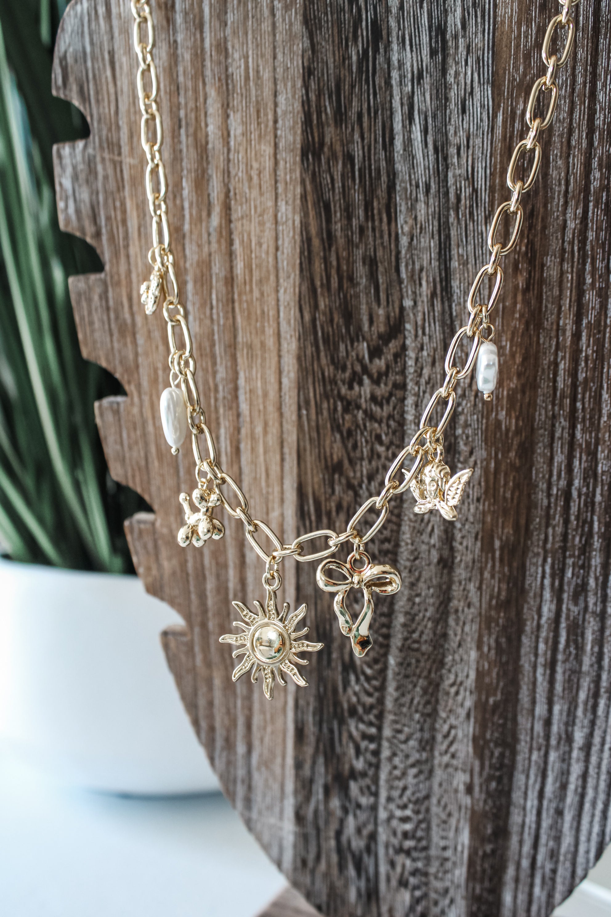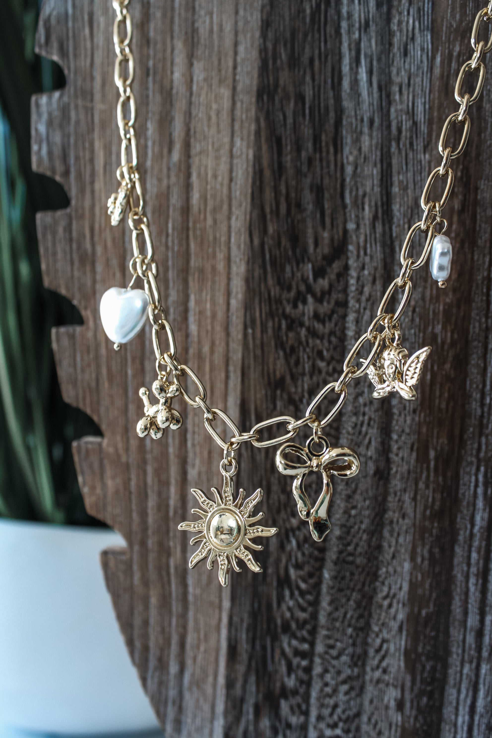 Add more style and personality to any outfit with a cute charm necklace! Featuring pearl and gold charms with a lobster clasp closure. Materials may have natural variations. Colors may vary from different viewing devices and lighting. Final sale item.