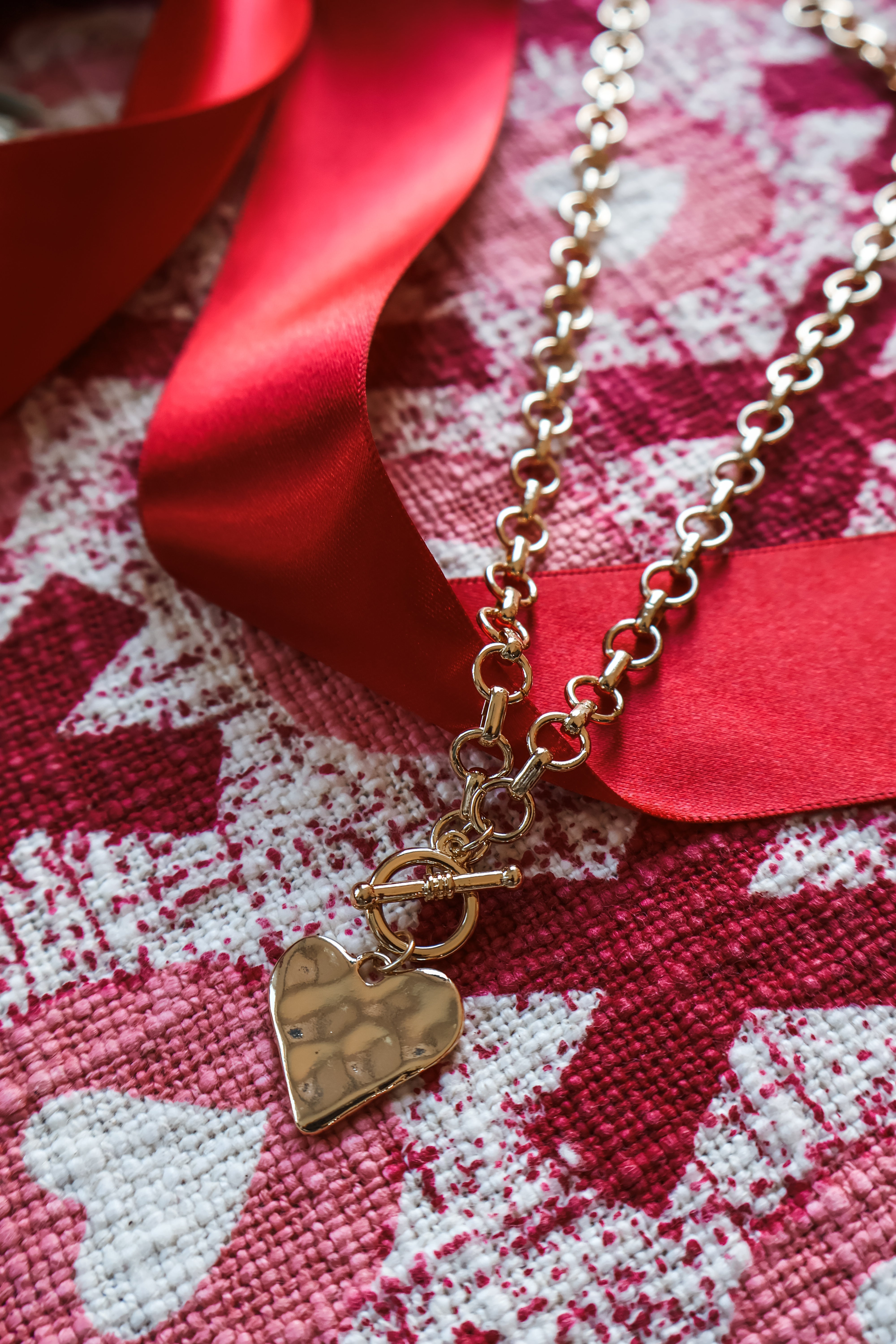 Love is in the air and our latest jewelry collection is the perfect finishing touch for your Valentine’s Day looks! This beautiful necklace features a circle link chain with a hammered heart pendant and toggle closure.