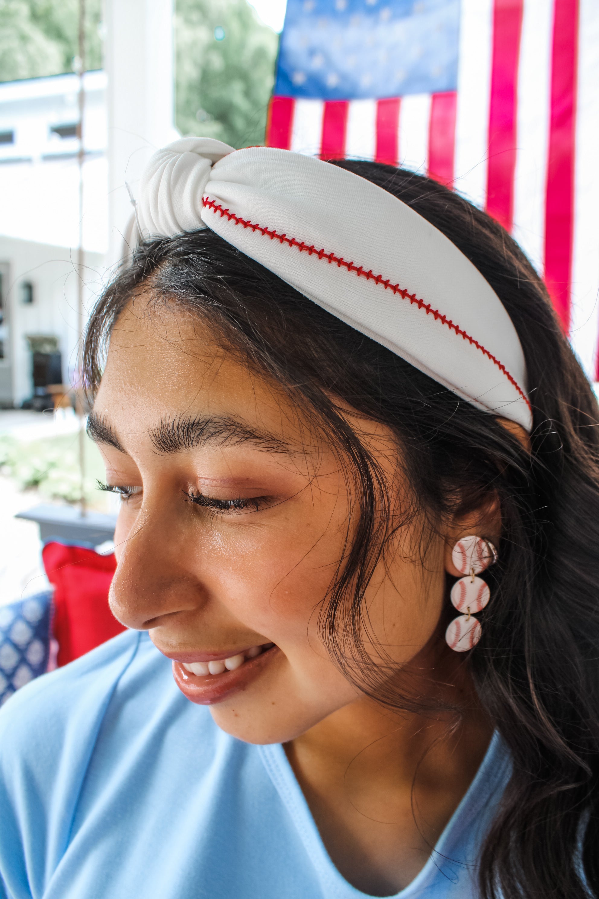 This super cute knit headband will complement your gameday outfits! Featuring a red stitching design with a top knot detail. Materials may have natural variations. Colors may vary from different viewing devices and lighting. Final sale item.