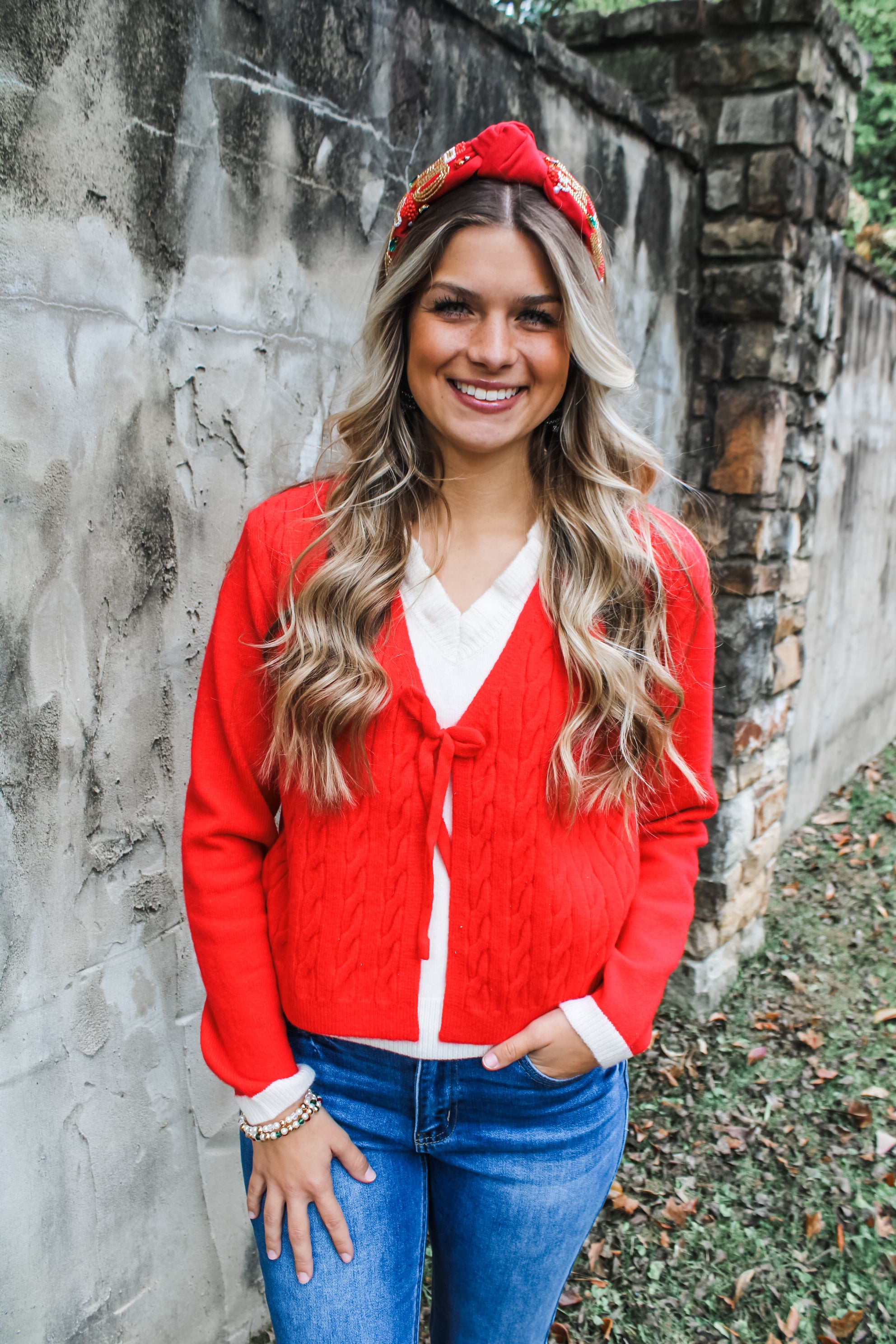 Top off your holiday looks with a fun and festive headband! Crafted from a corded knit fabrication, this bejeweled accessory features a top knot detail, crystal rhinestones and a beaded design.