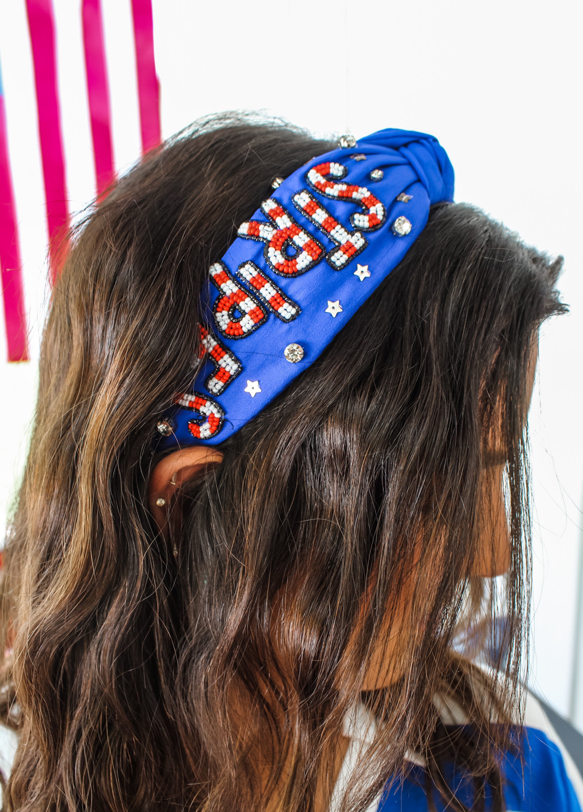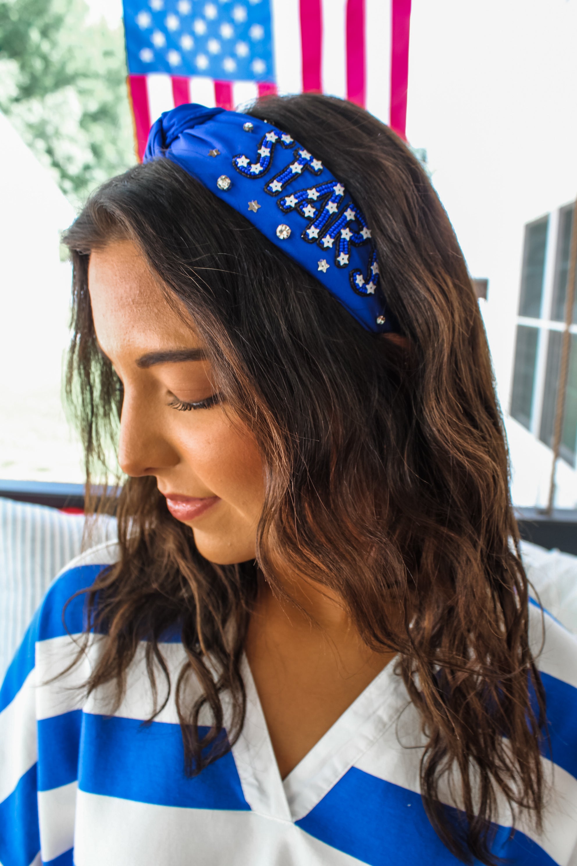 This super cute headband will complement your red, white and blue outfits! Featuring a beaded design with silver star sequins and rhinestone studs, with a top knot detail. Materials may have natural variations. Colors may vary from different viewing devices and lighting. Final sale item.