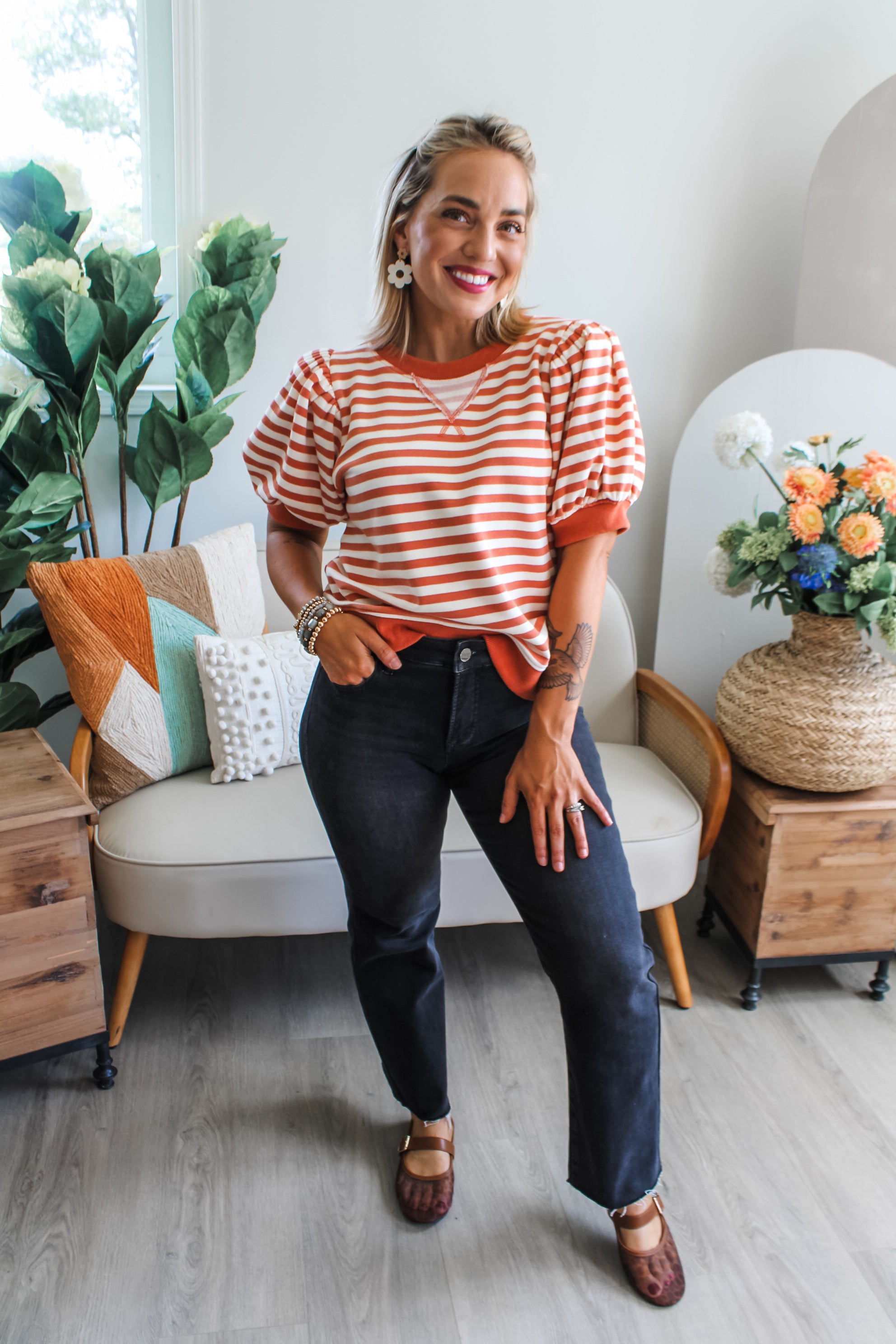 Think elevated essentials and colorful stripes for a stylish wardrobe. This terry knit top is an eye-catching look whether you’re going to brunch, taking a casual stroll or going on a weekend getaway. Featured in a relaxed crewneck silhouette with trendy bubble sleeves and a rib band finishing for added contrast.