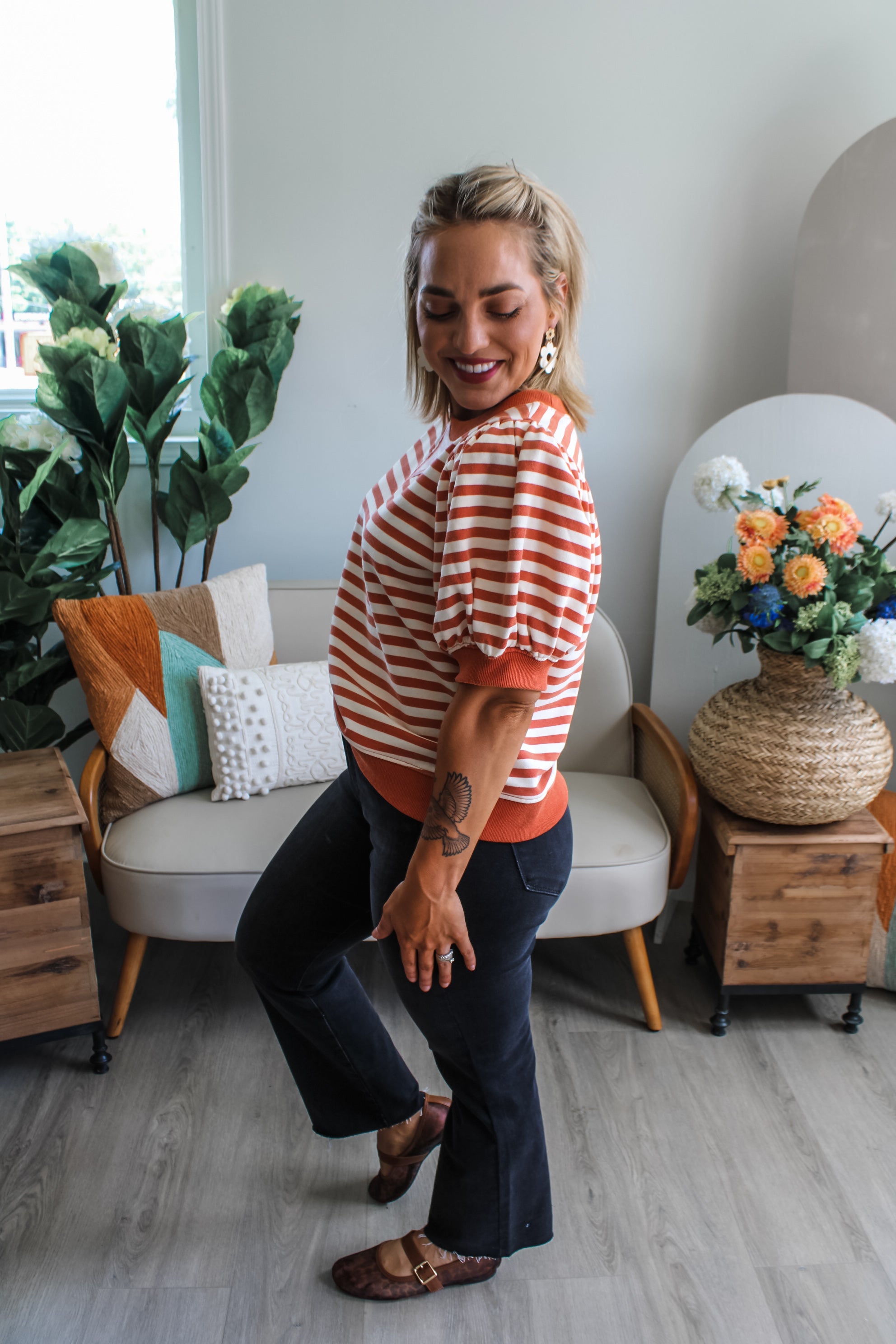 Size + fit: Runs slightly loose. S 0-6, M 6-10, L 10-12. 60% Cotton, 40% Polyester. Model is 5’1” and wears a Small.
