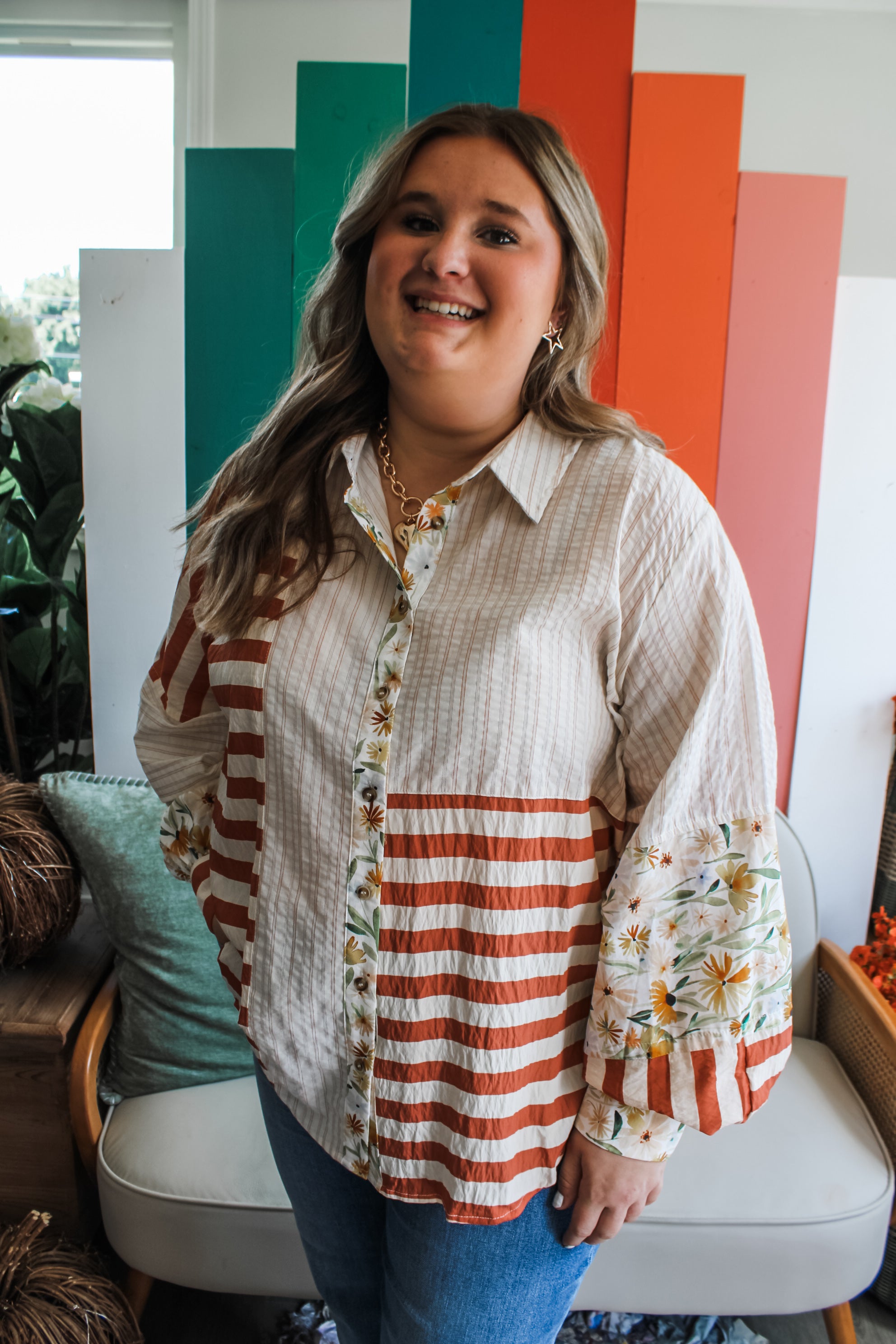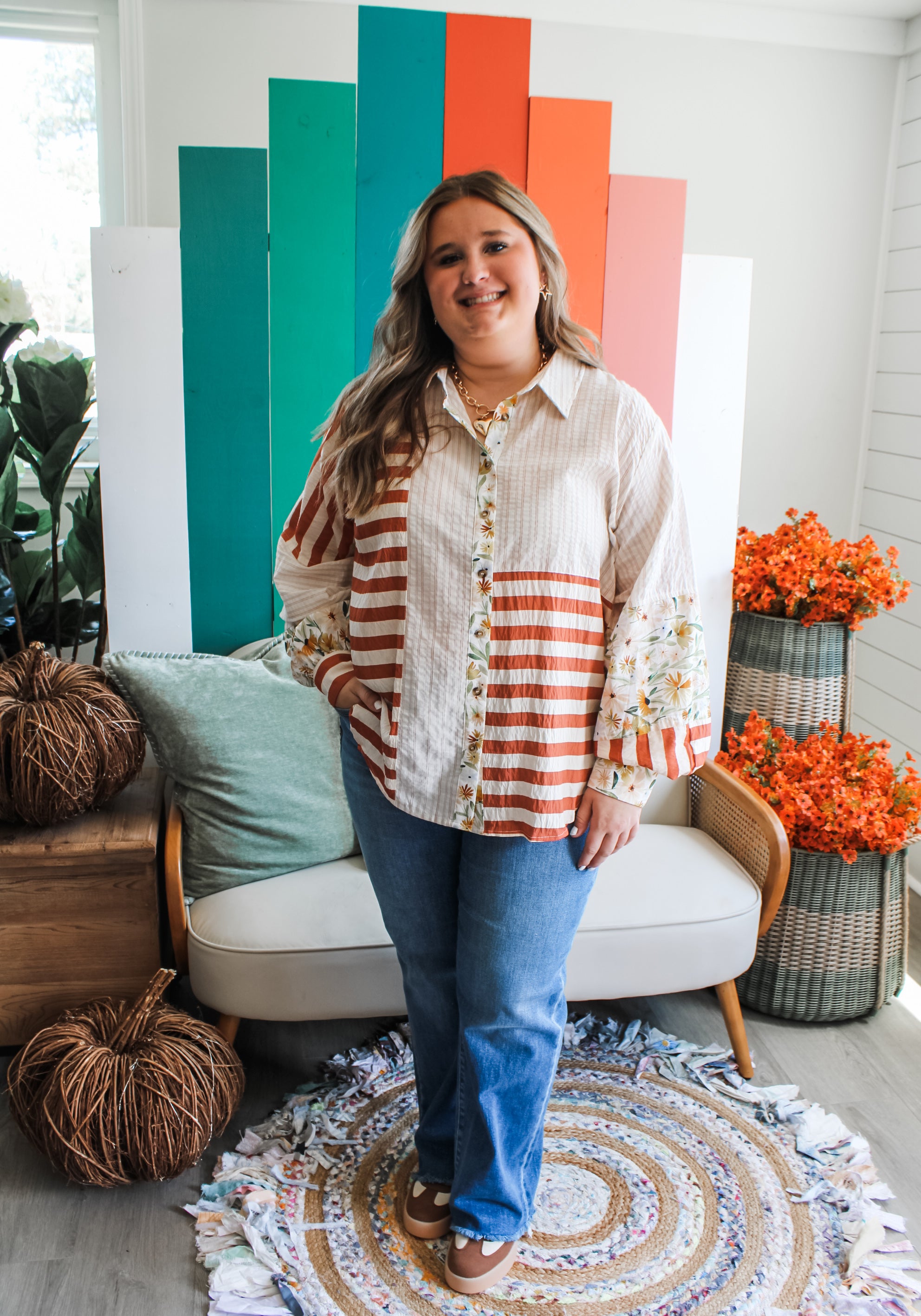 So pretty in print, this striking blouse will elevate your fall wardrobe! Fabricated in a textured woven, with a multi-stripe and floral design for a sophisticated and eye-catching look. Featuring a collared neckline, balloon sleeves with double button cuffs and a curved hem.