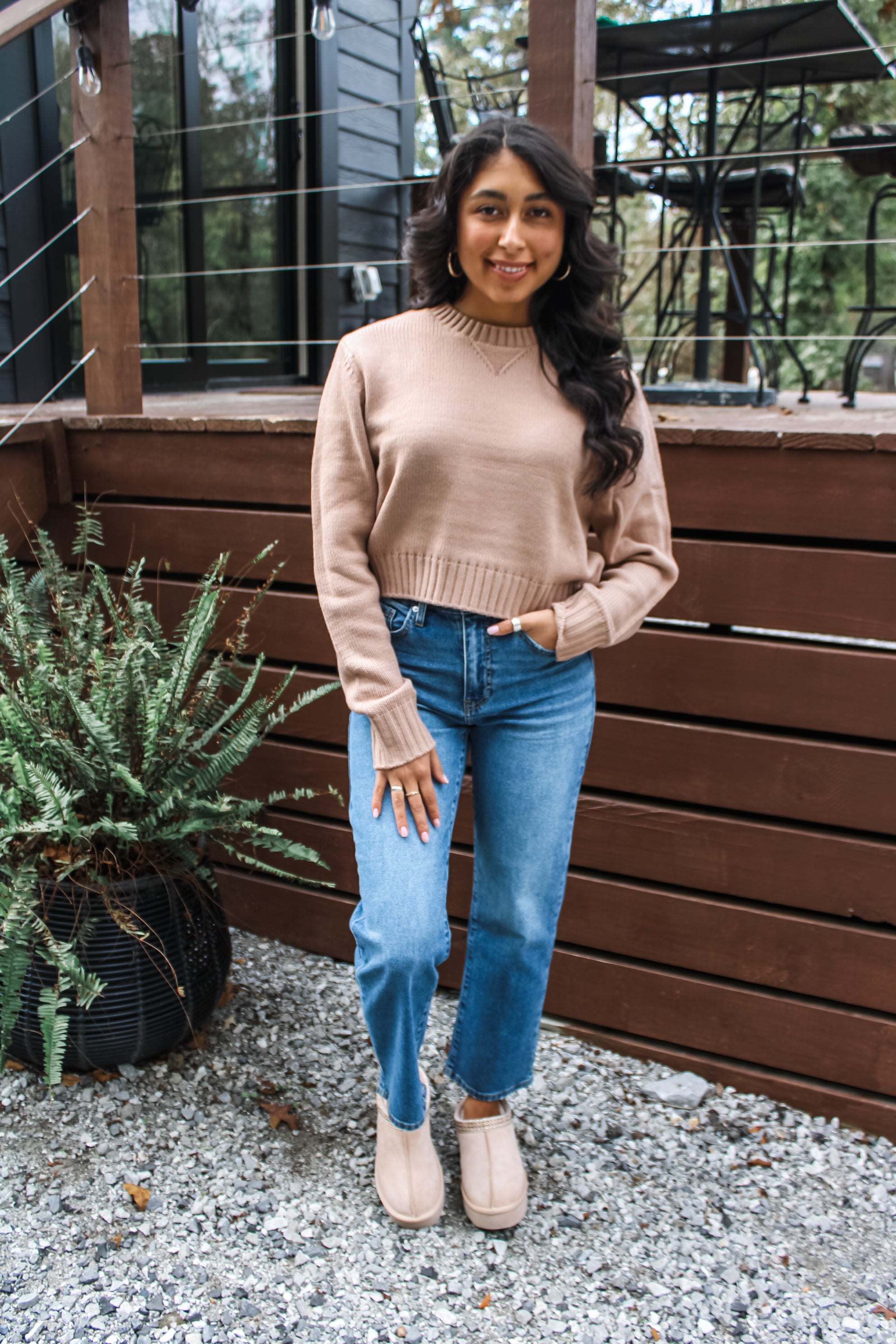 It’s sweater weather and this crewneck classic is a cozy staple you'll keep reaching for season after season! Crafted from a soft braided knit, it’s a versatile look you can dress up or down for any occasion. Featured in a relaxed silhouette with a hem length that hits around the waistline, perfect for pairing with high rise pants and button front jeans. With v-notch detail, drop shoulder sleeves and contrast rib finishing.