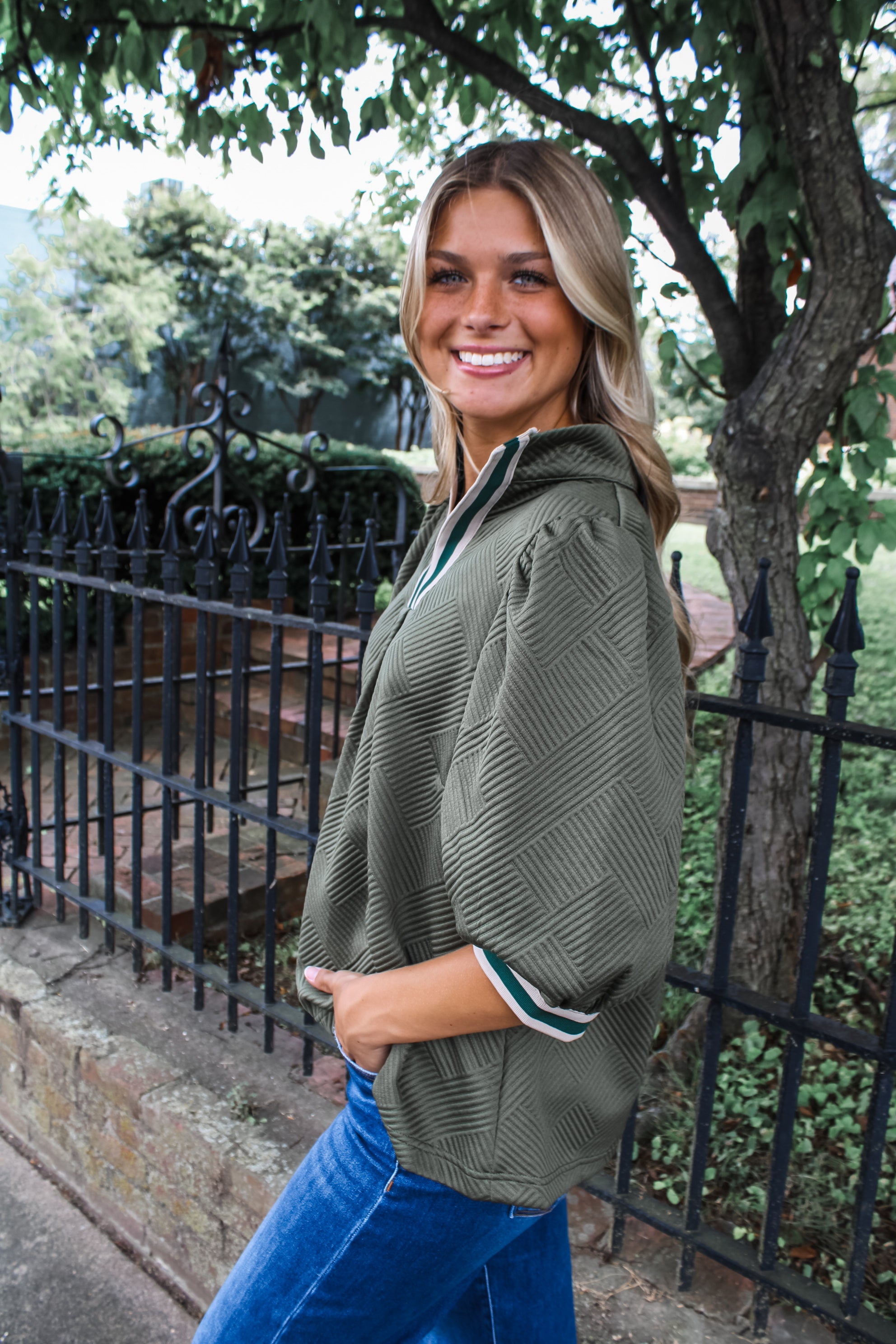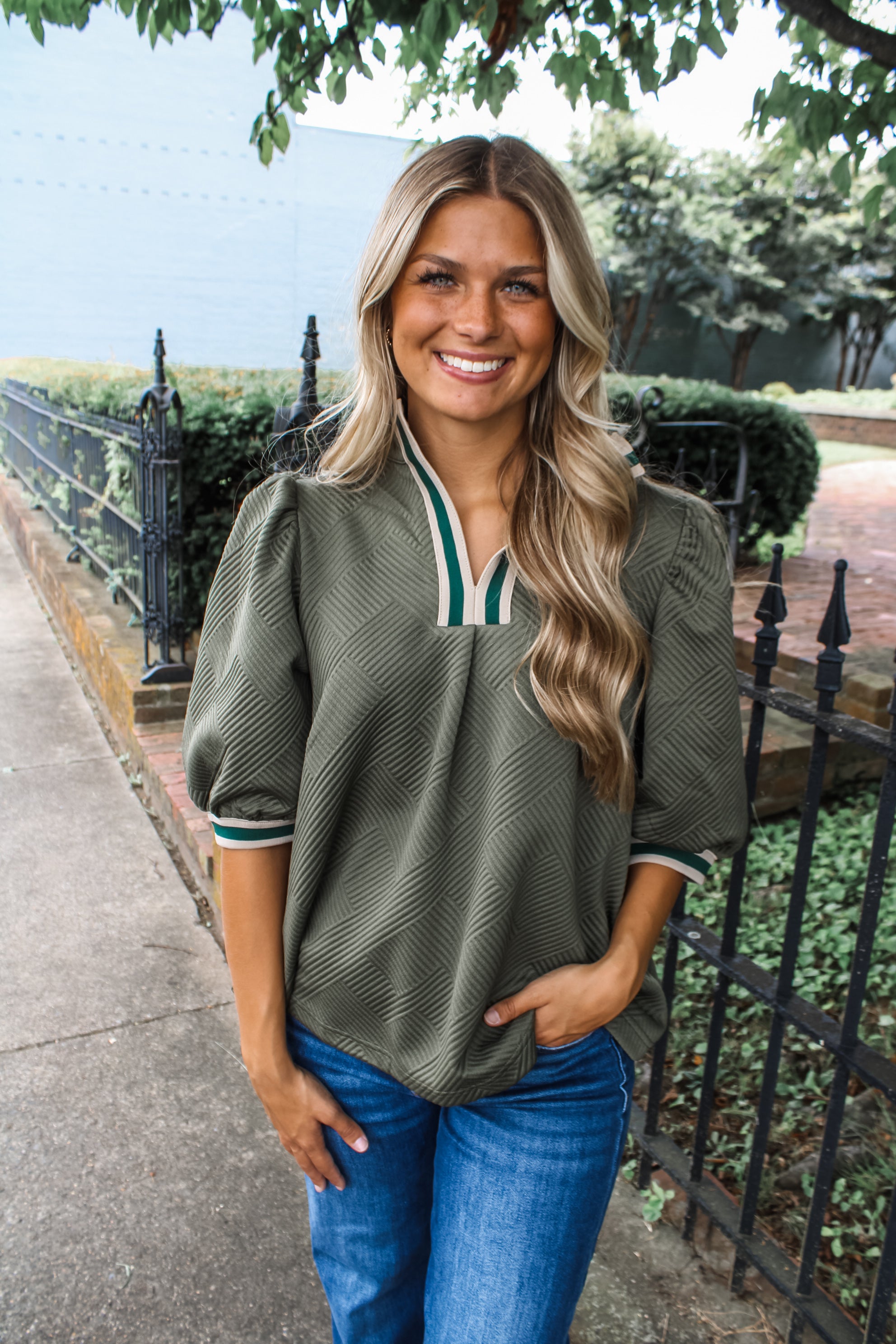 Elevate your fall essentials. This top features a trendy patterned fabrication and sophisticated contrast stripe detailing for a look that makes a chic statement. With a notched neckline, puff sleeves and a relaxed silhouette.