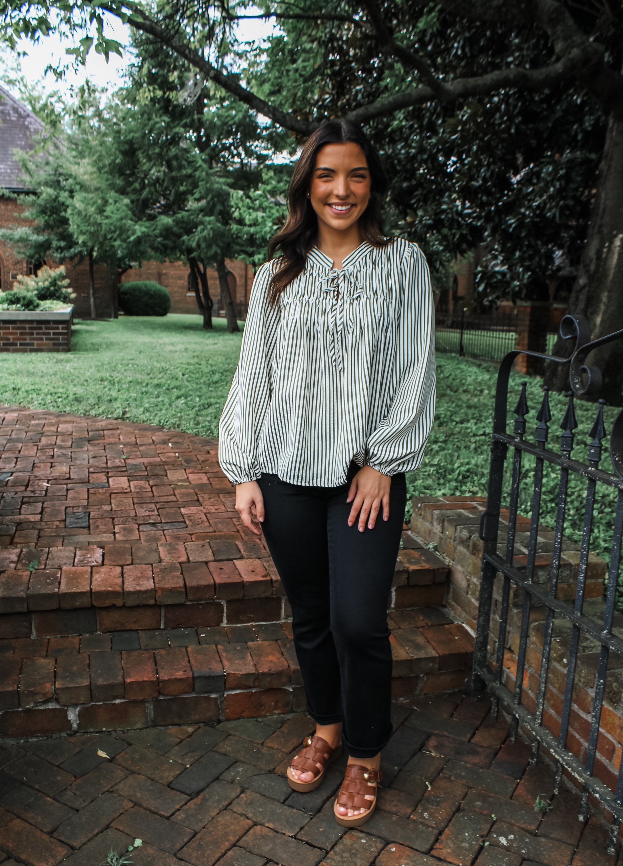 So pretty in pinstripes, this blouse is an effortless and chic look whether you dress it up or down. Fabricated in a textured woven with a keyhole neckline, balloon sleeves and a flowy silhouette. The pleated design and bow tie add detail and interest to this timeless style.