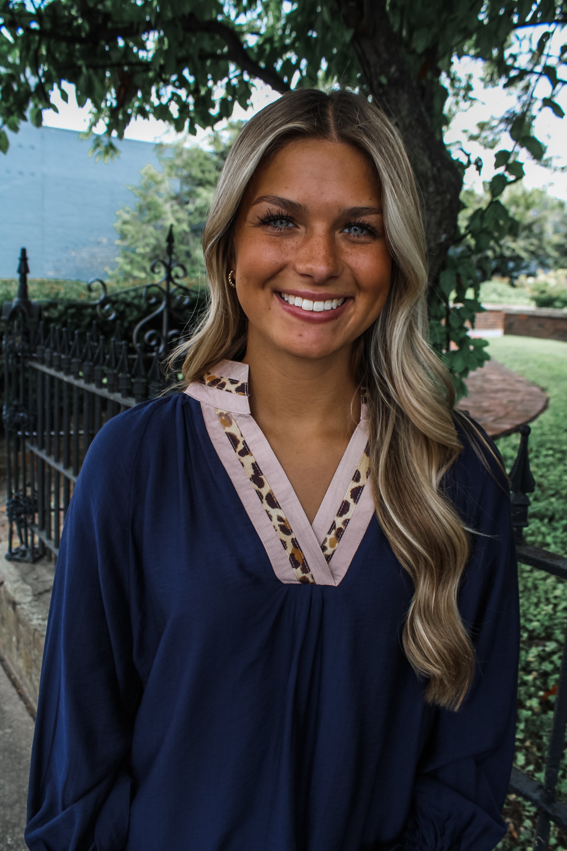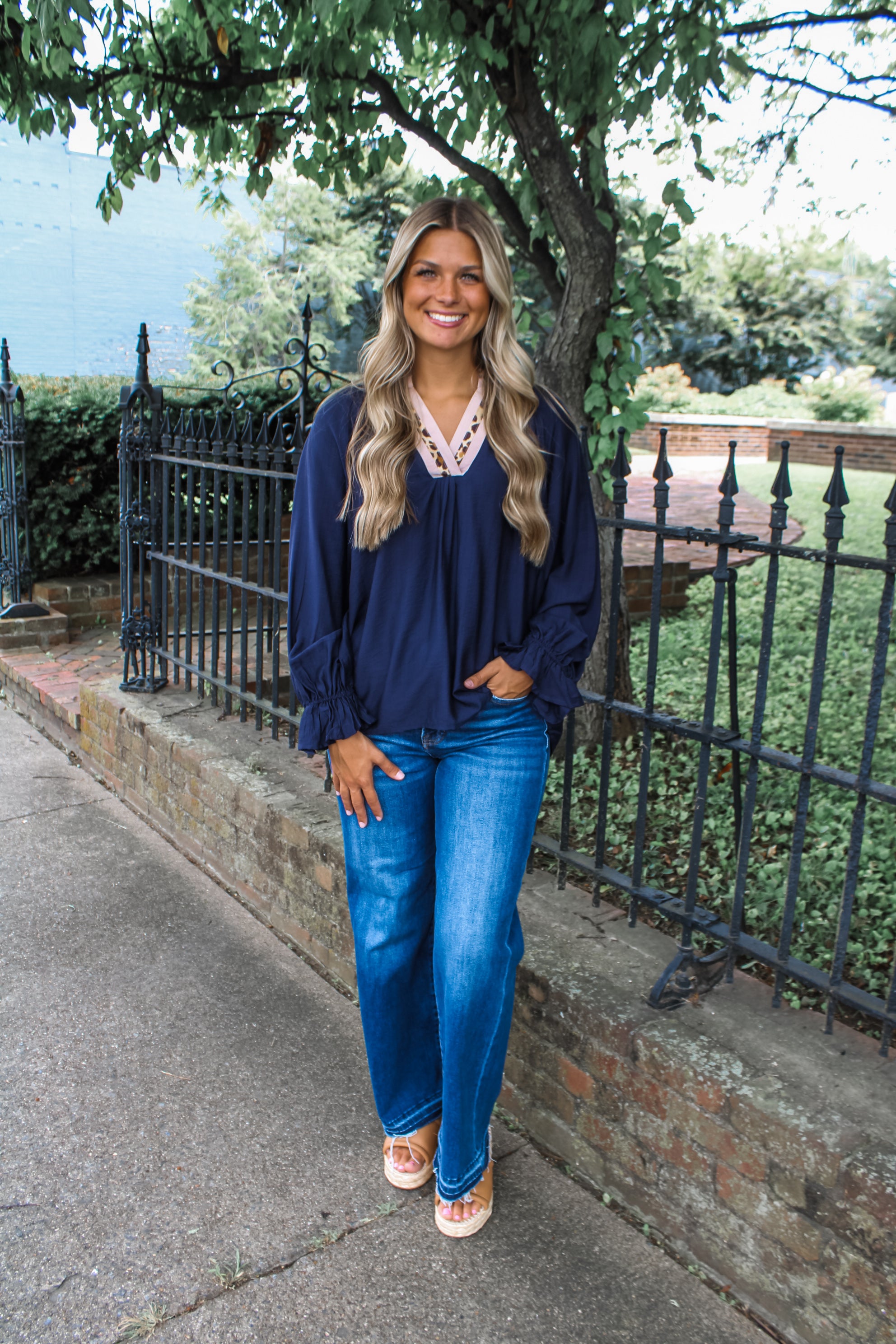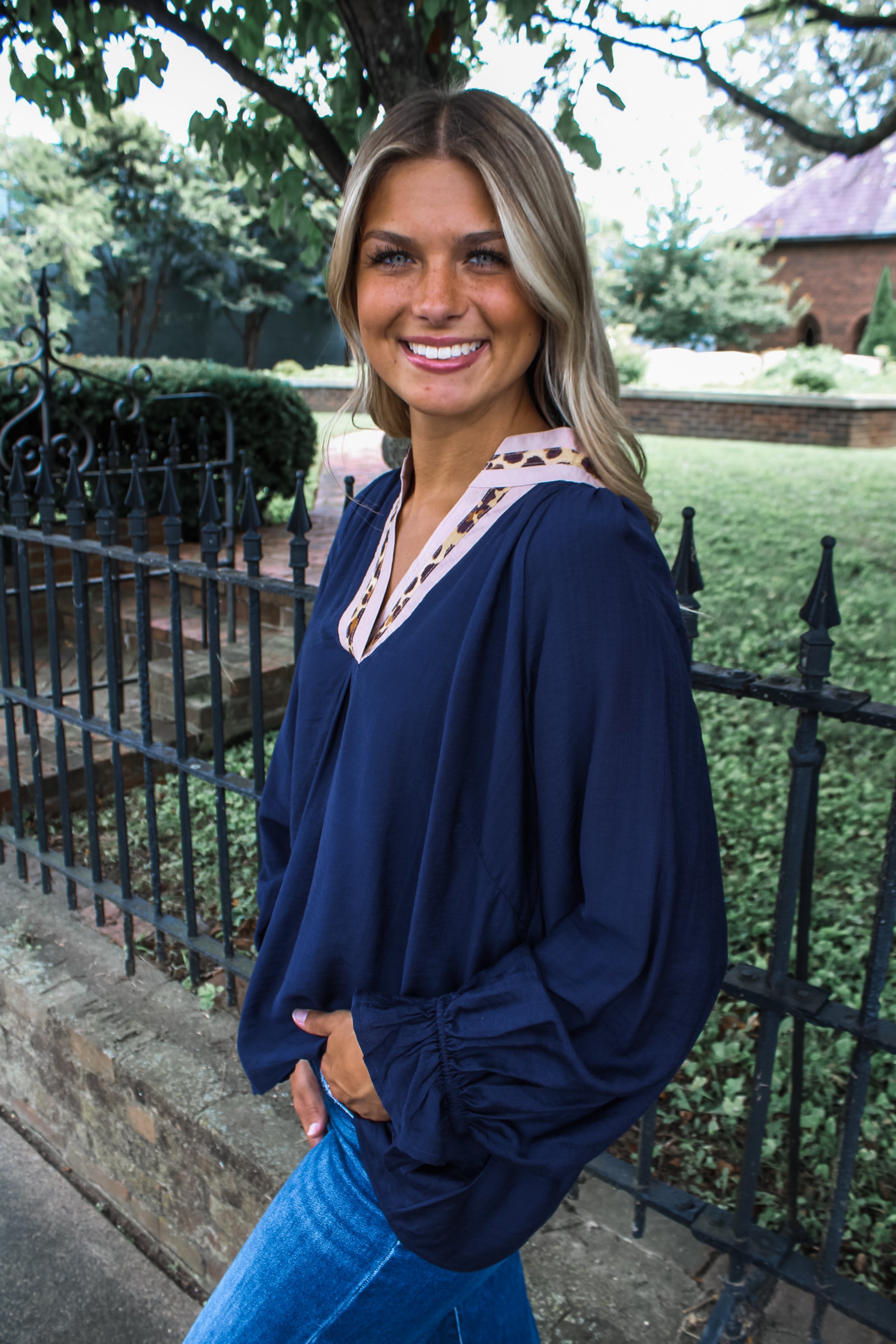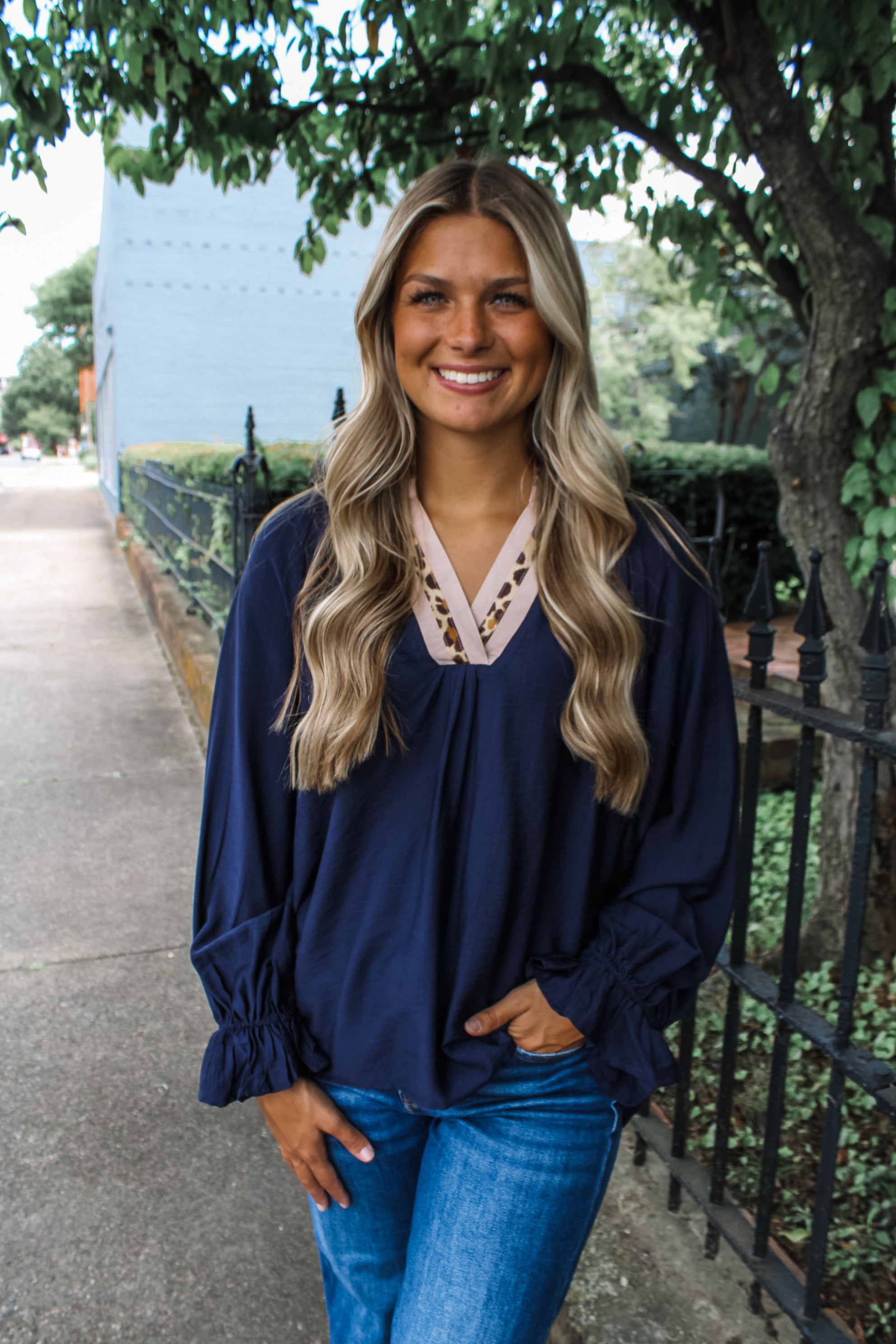 Add a pop of leopard to your fall style. This chic blouse features a printed neckline trim that contrasts beautifully against the classic navy woven. With a split neckline, ruffle cuff lantern sleves and a flowy silhouette that’s flattering for all.