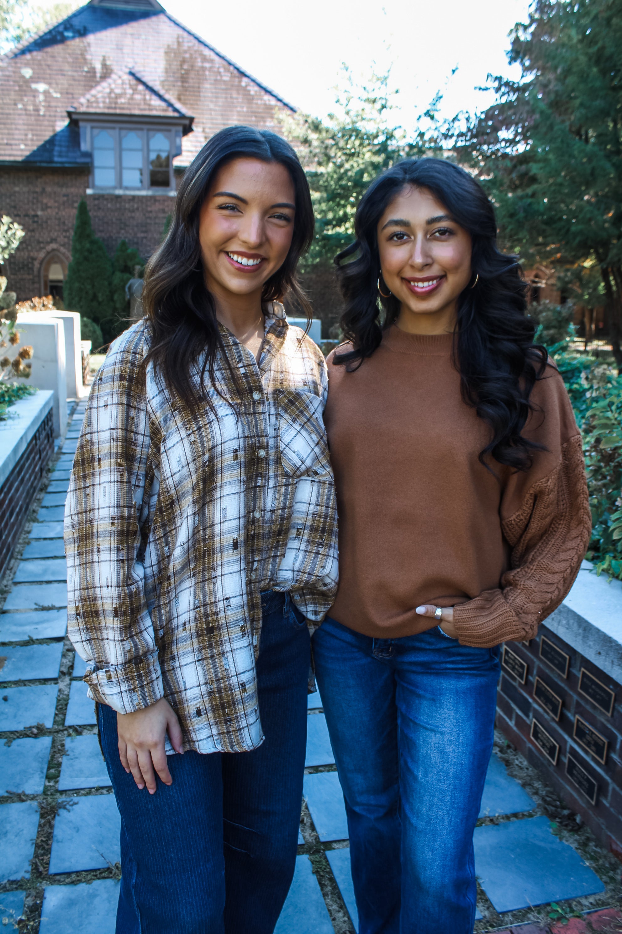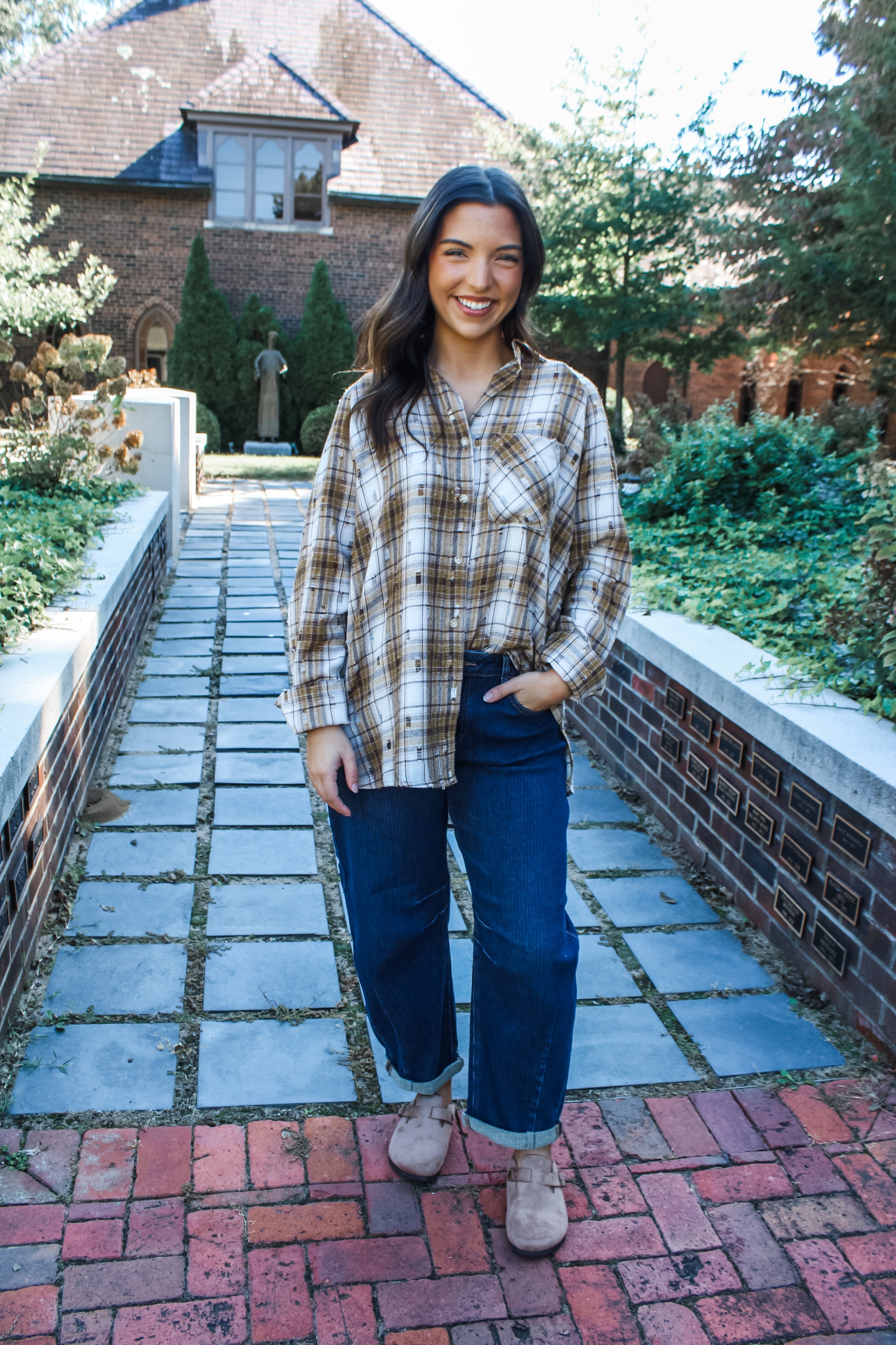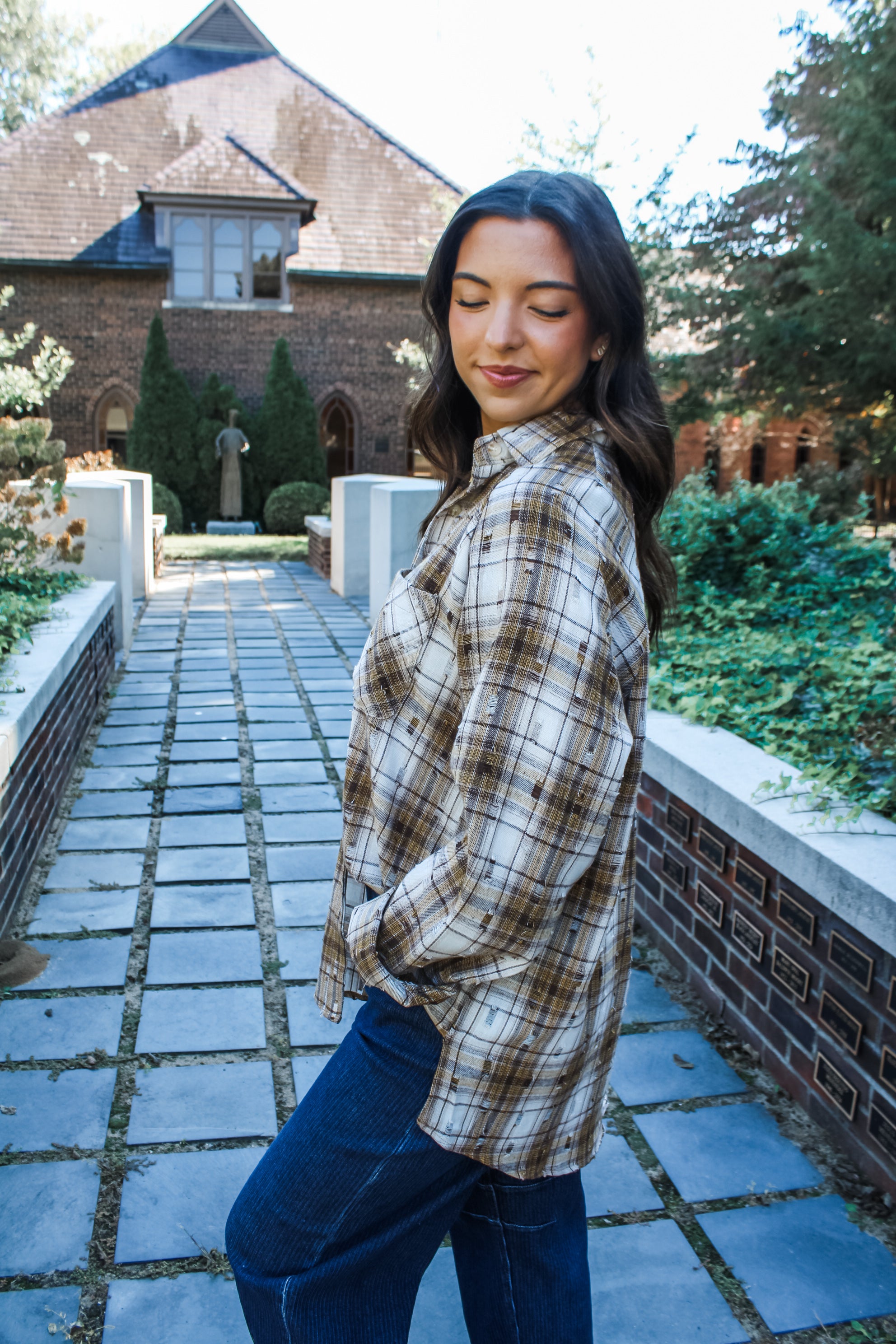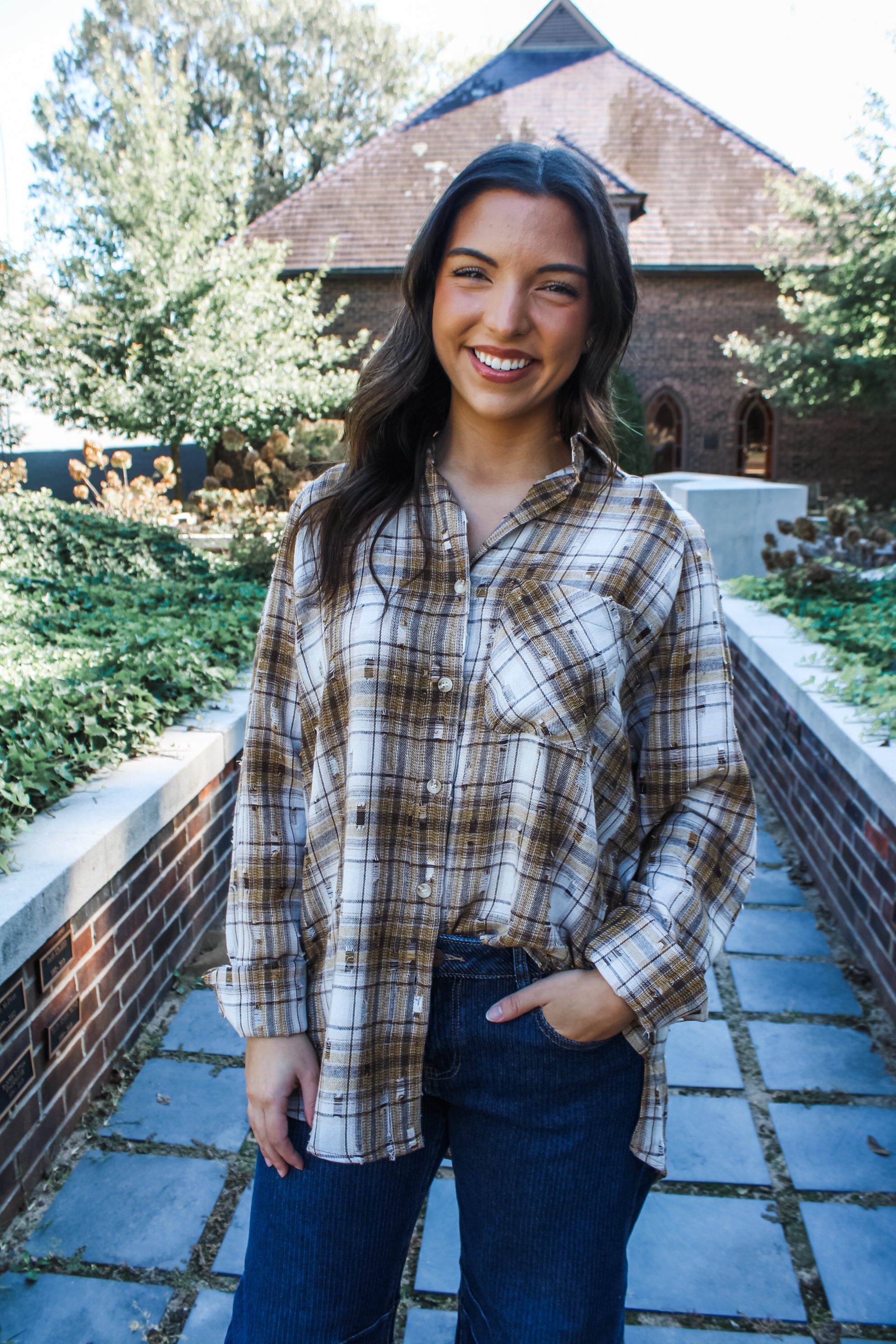 Classic plaid with a stylish edge. This woven shirt combines vintage vibes and a western flair with its artfully distressed fabrication. Featuring a collared neckline, chest pocket detail, raglan sleeves and a curved hem. The oversized fit gives off that cool relaxed feel and makes layering so easy. Wear on its own, or toss over basic knits, chunky sweaters and graphic tees.