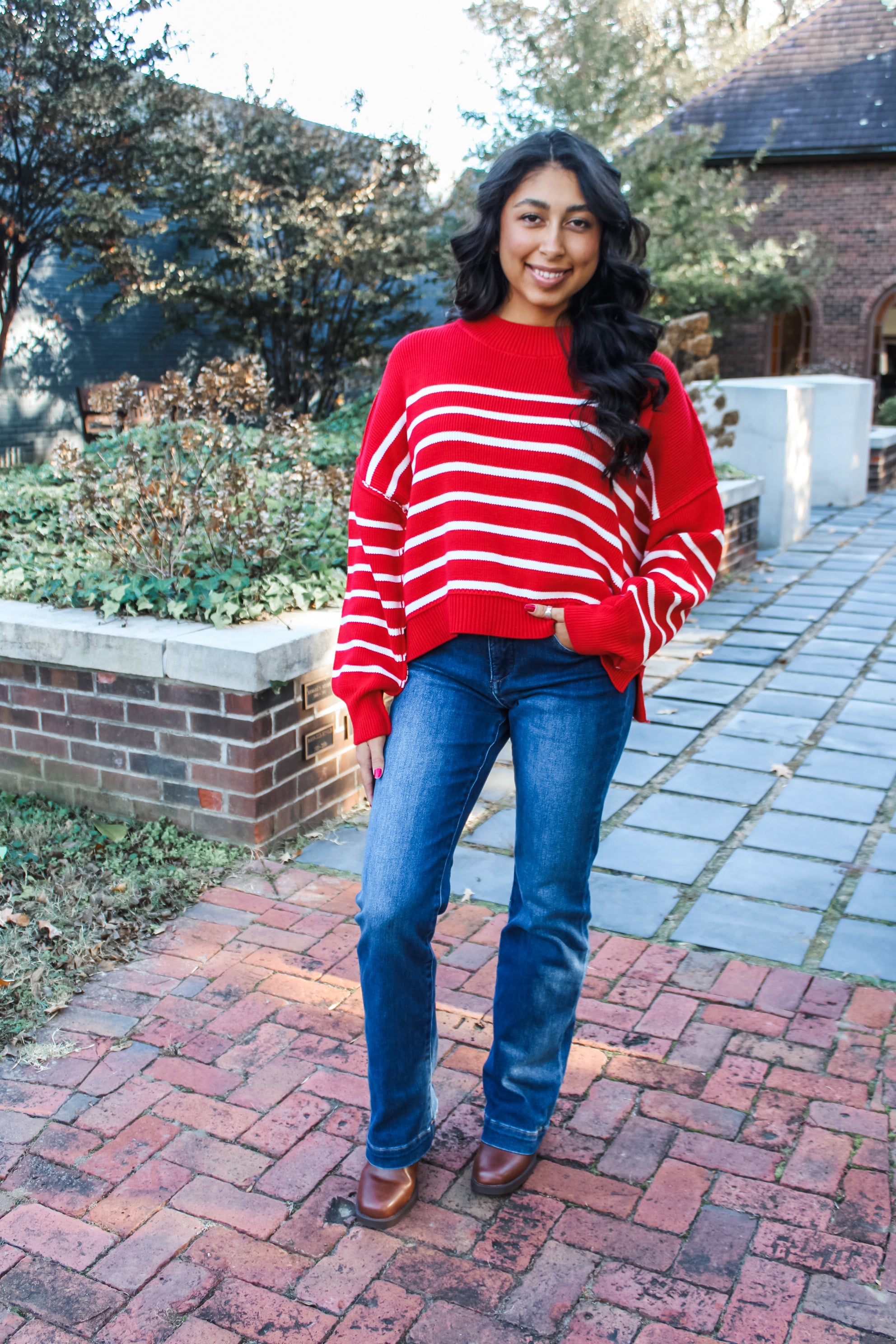 Refined essentials for a chic and cozy wardrobe. This striped sweater is fabricated in a braided rib knit with exposed seaming, balloon sleeves, rib contrast finishing and a high low hem. With a slouchy dolman silhouette for a relaxed and comfortable fit.