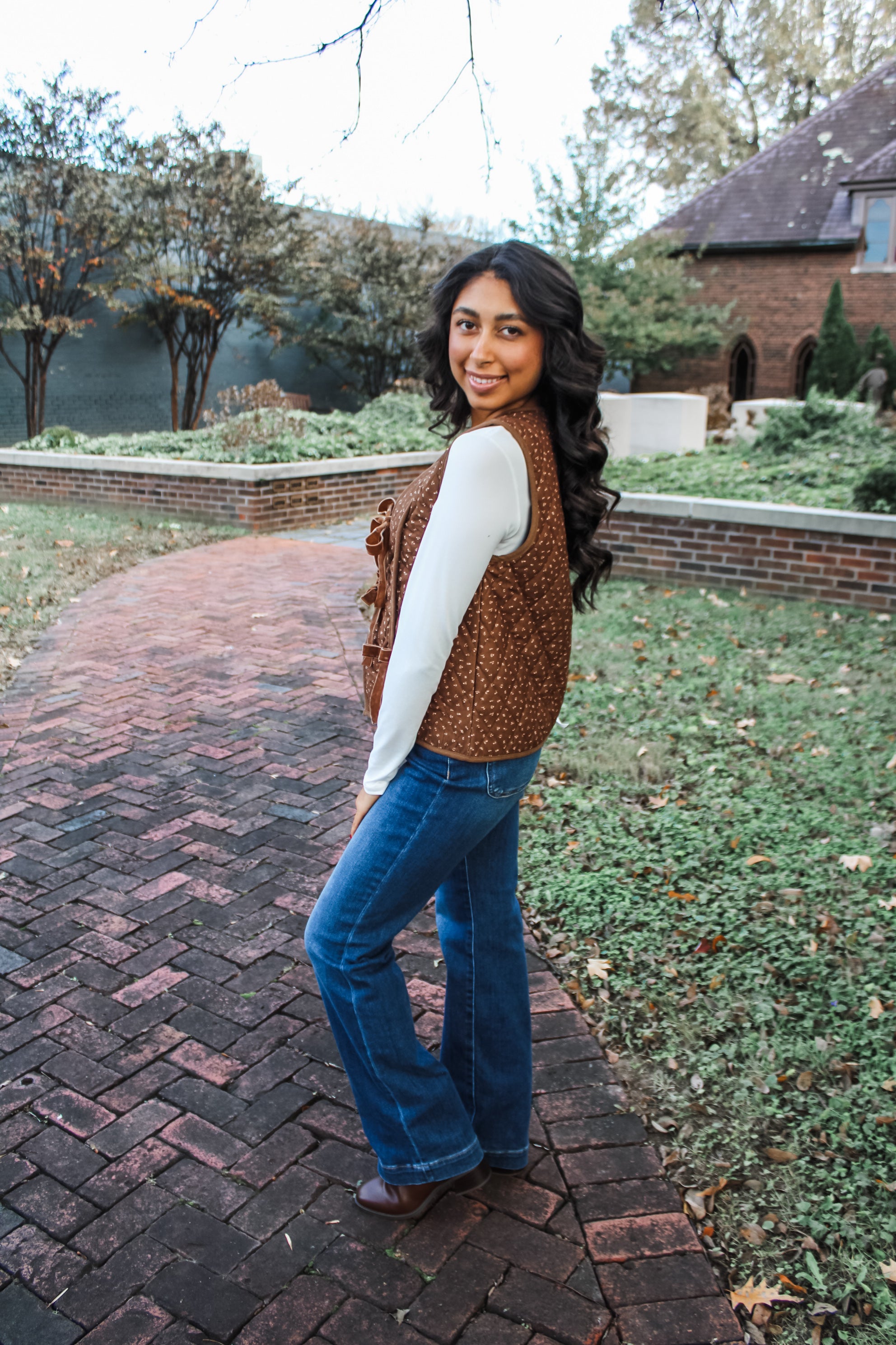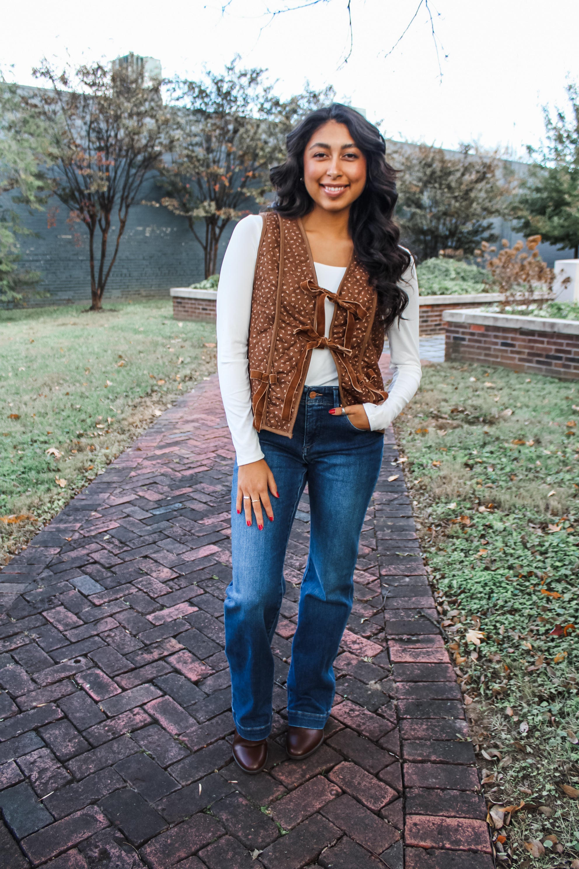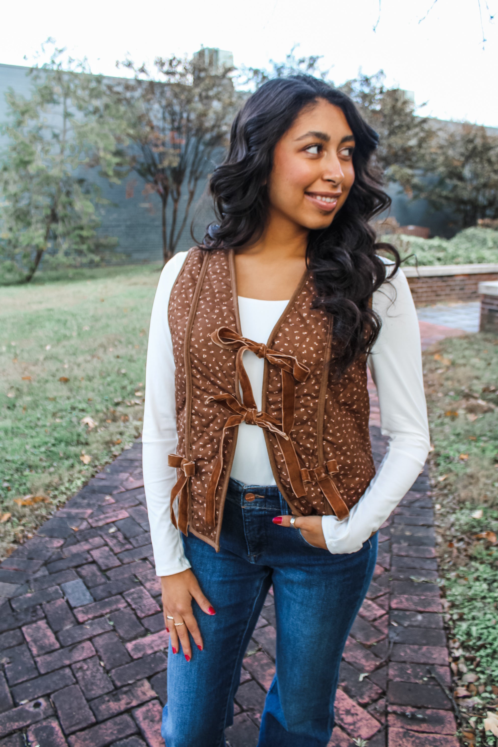 Elevate your wardrobe with effortless layers and cozy charm. Crafted from a quilted fabrication, this sweet vest is a versatile look with many styling possibilities. Featuring an open front with velvet bow tie closure, piping trim detail, soft lining and an easy fit for style and layering.