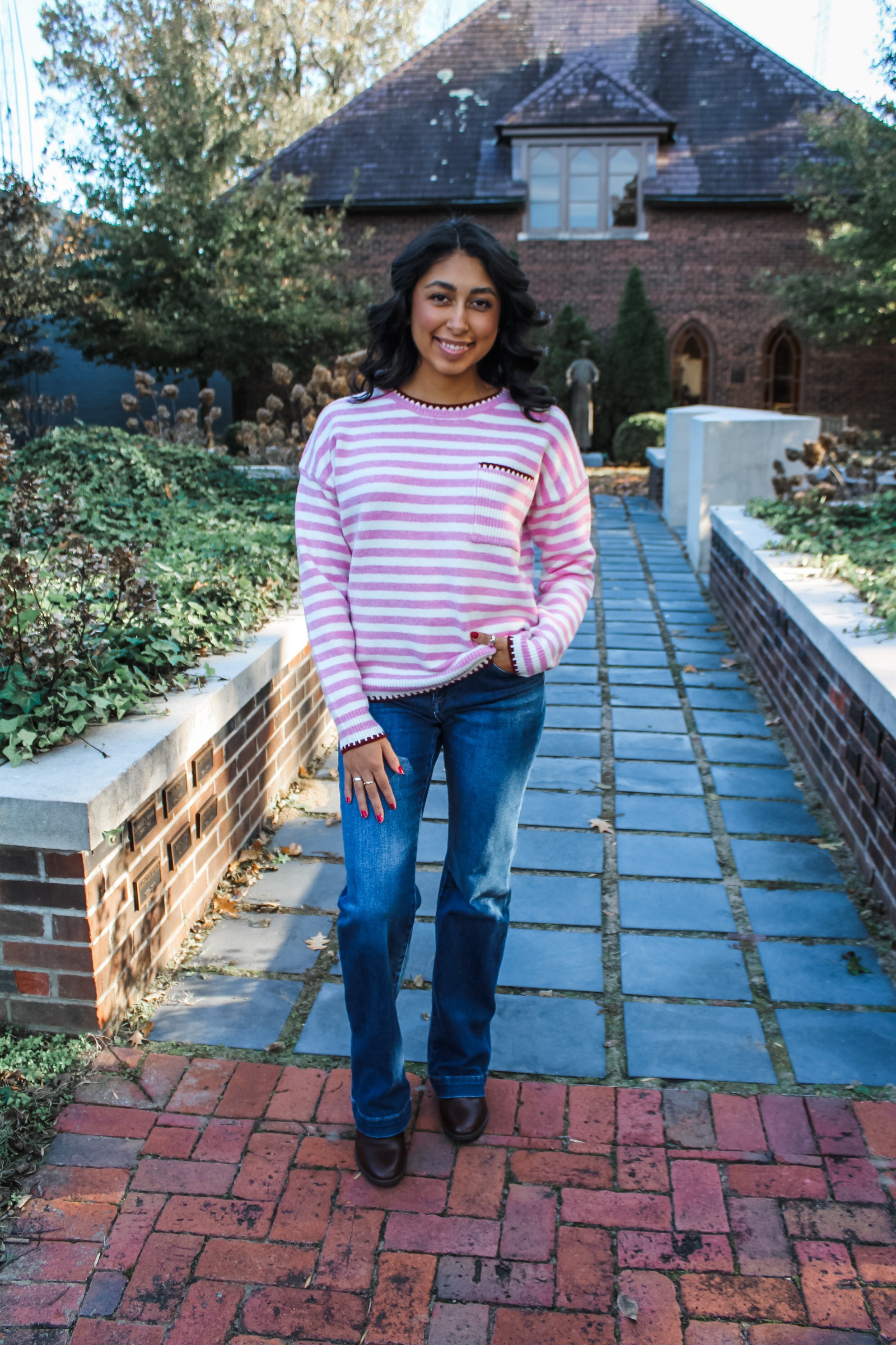 Cute and classic stripes for the holidays and beyond! Crafted from a cozy knit, this sweater features stitched trim finishing and a chest pocket detail for stylish contrast and added dimension. With a relaxed crewneck silhouette, it’s a such a fun and festive look you can dress up or down season after season.