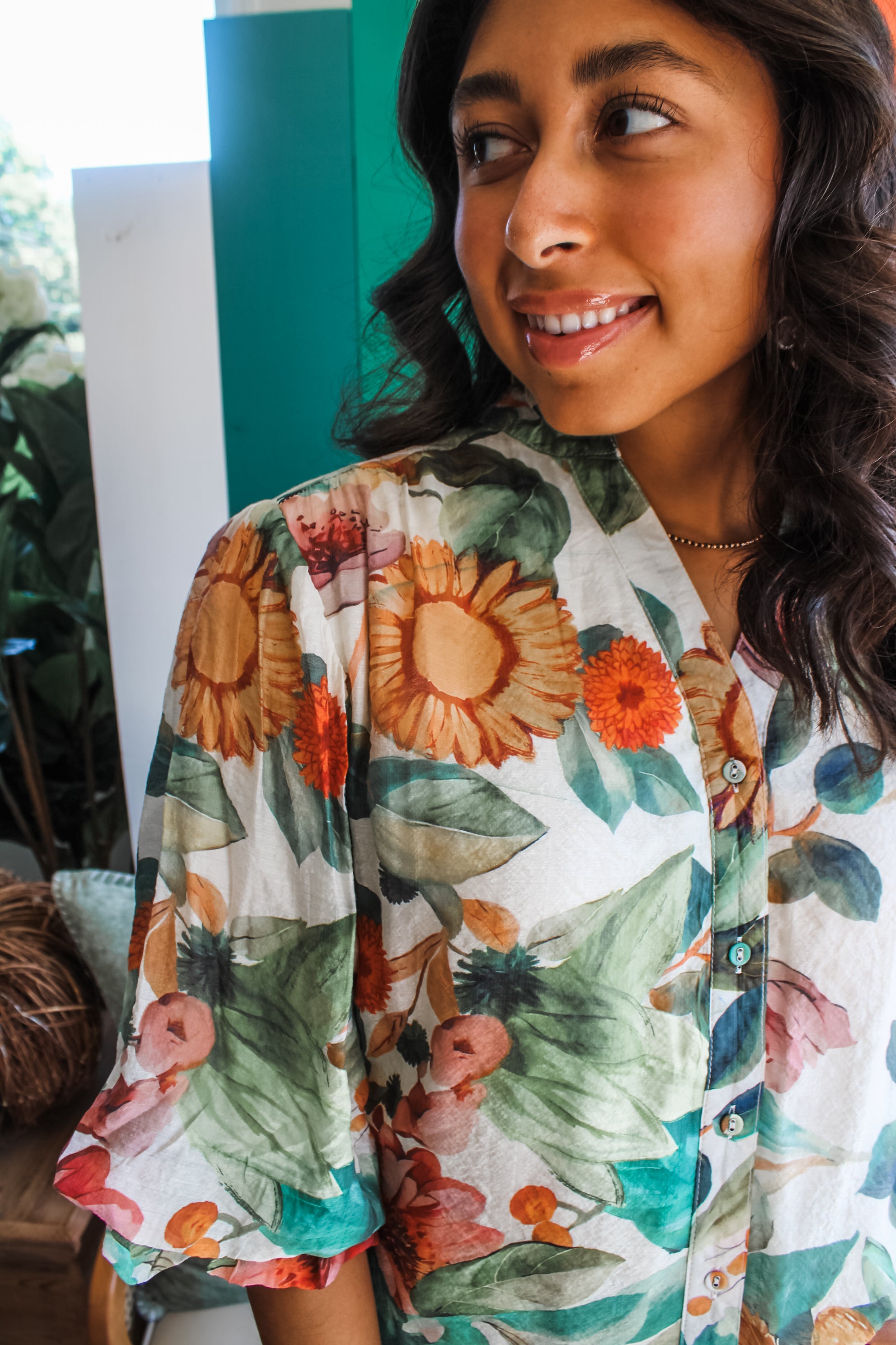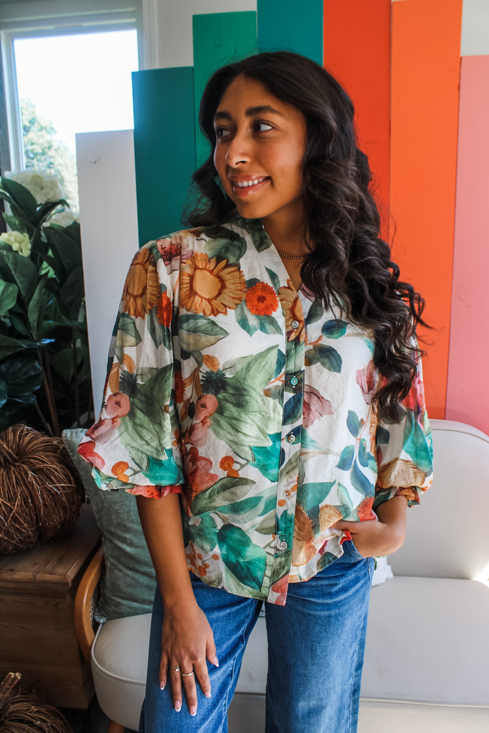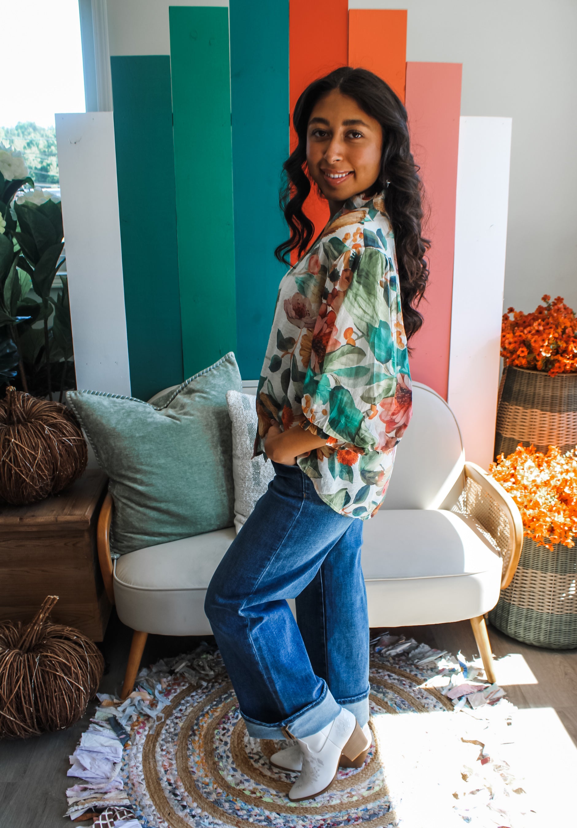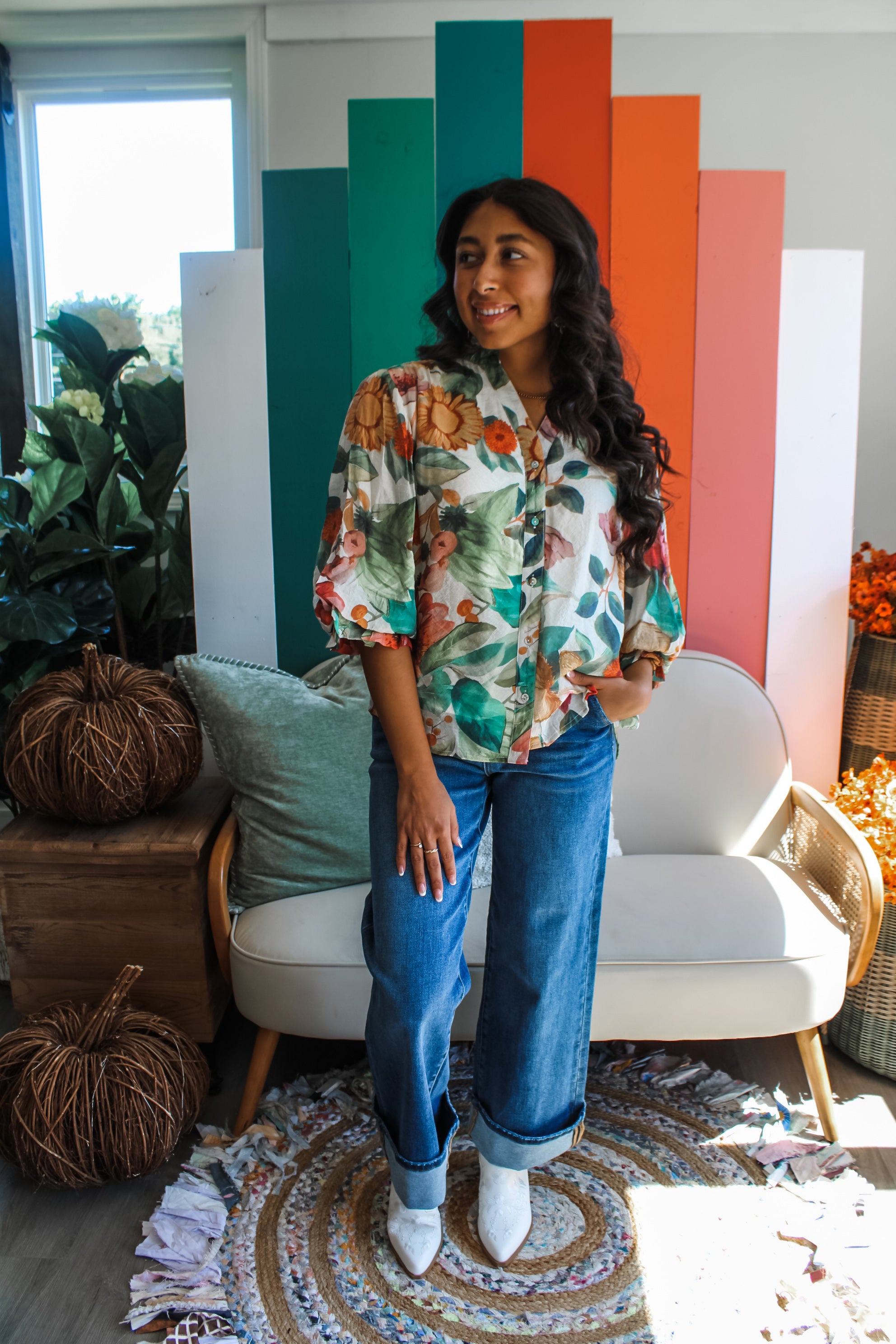 Step into fall with sophisticated florals. This eye-catching blouse can be dressy or casual depending on how you style it. Fabricated in a lightweight woven overlay, with a ruffle trim neckline, button front, puff sleeves and a curved hem.