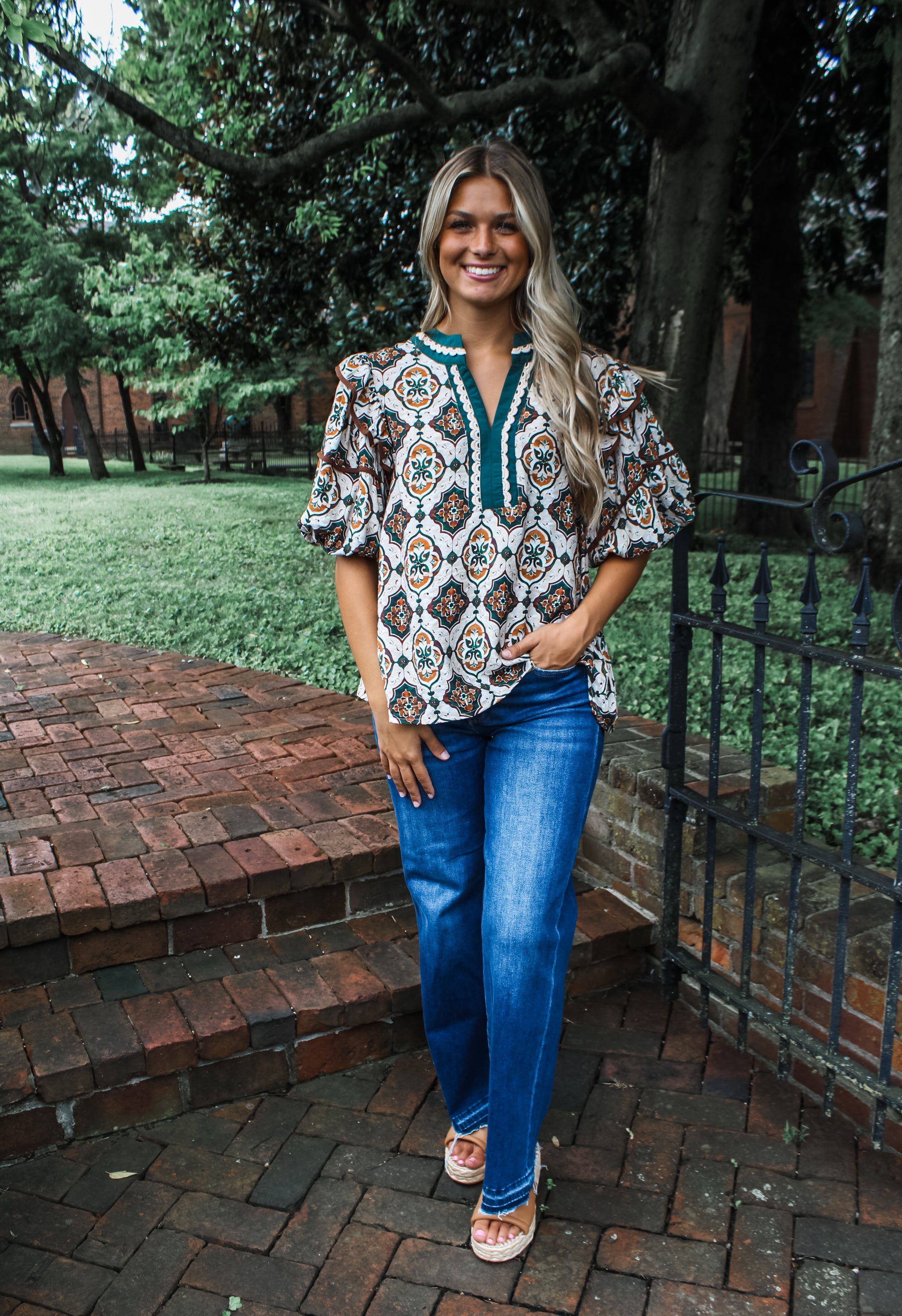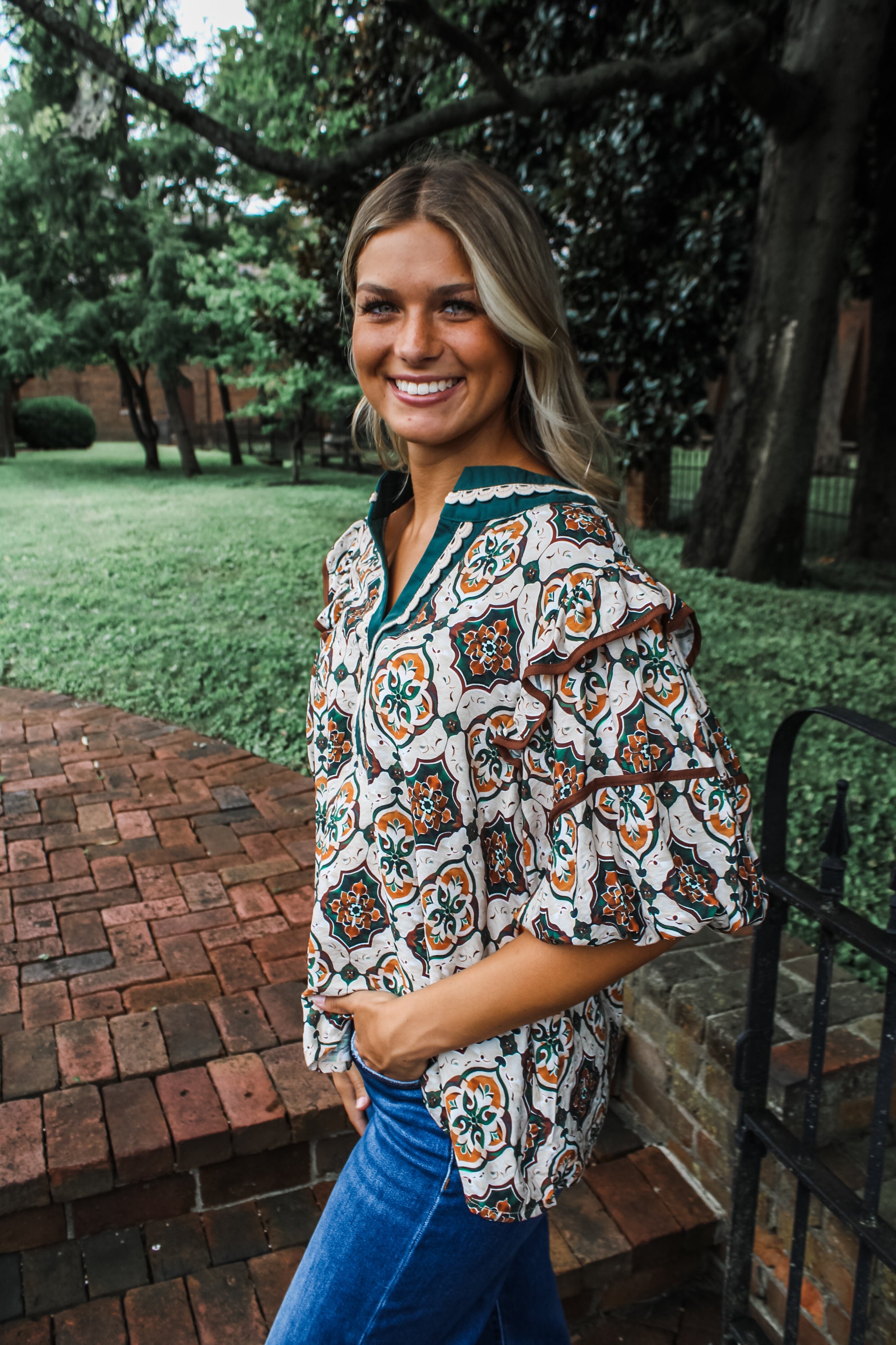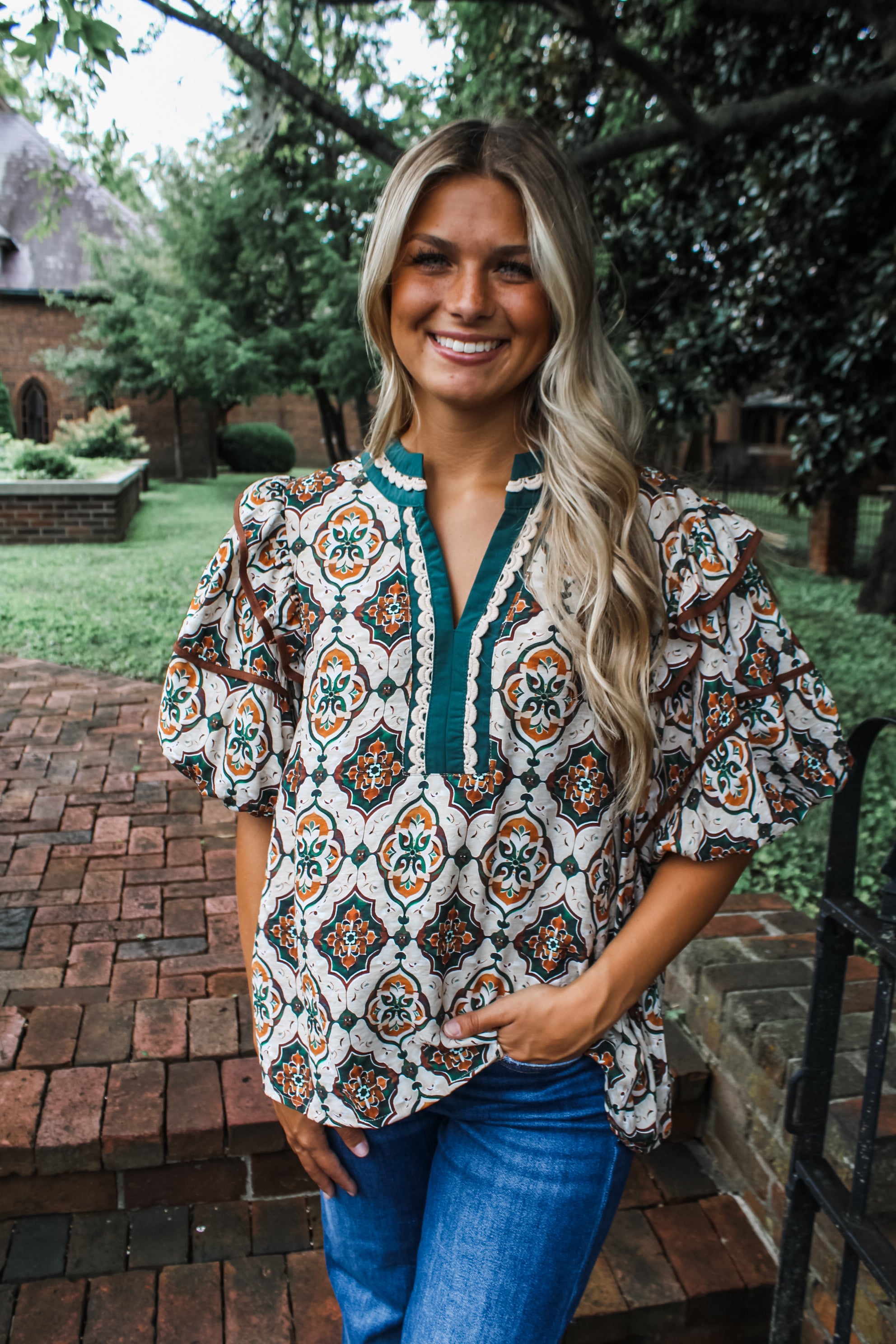 Step into fall with effortless silhouettes and striking prints. Fabricated in a textured woven and featuring a notched neckline, puff sleeves and flowy fit. The contrast trim, piping details and scalloped lace detail add interest and a lot of flair. This eye-catching top can be dressy or casual depending on how you style it.