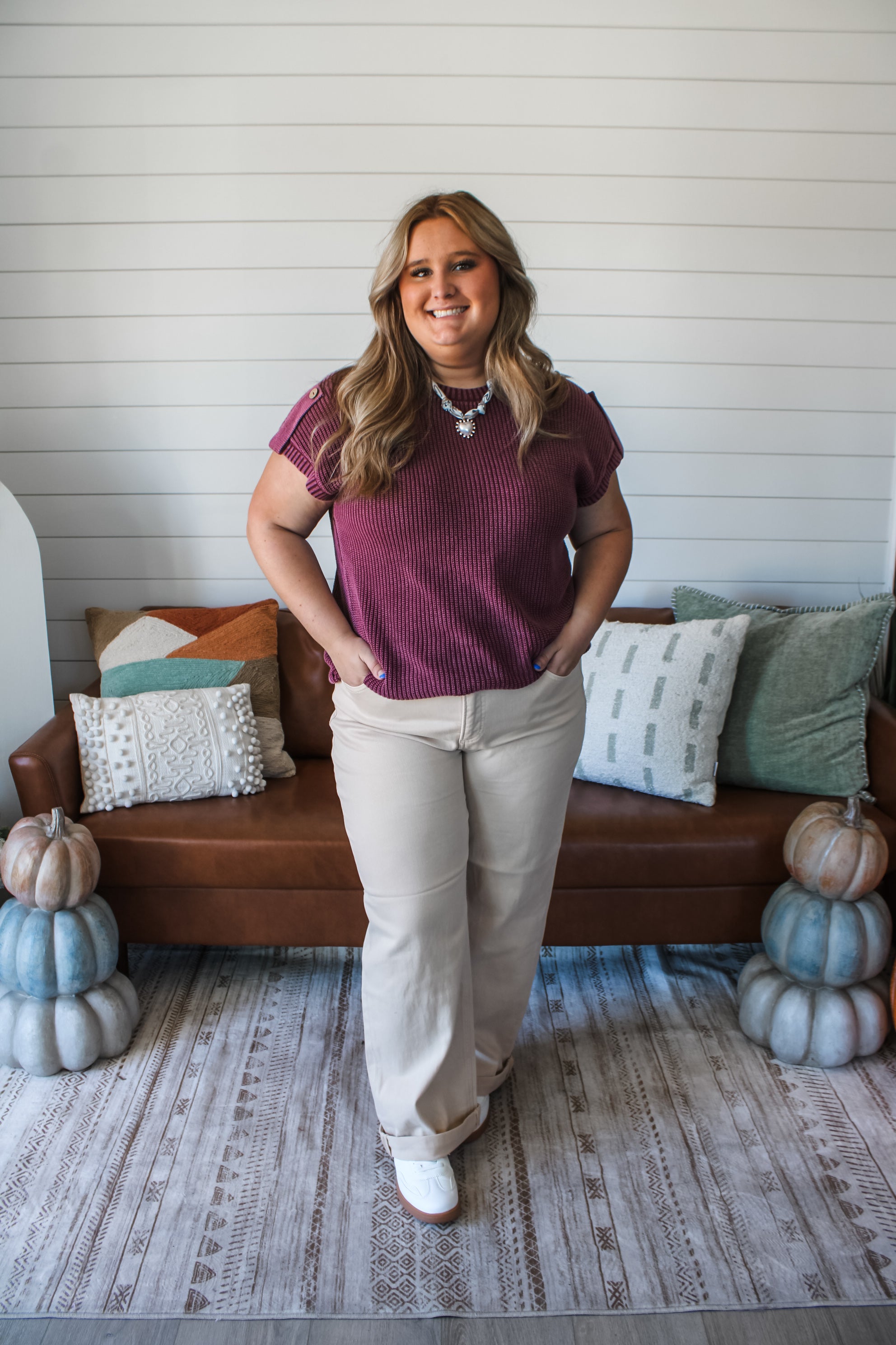 Size + fit: Runs true to size. 1X 14-16, 2X 16-18, 3X 18-20. 100% Cotton. Model is 5’5” and wears 1X.