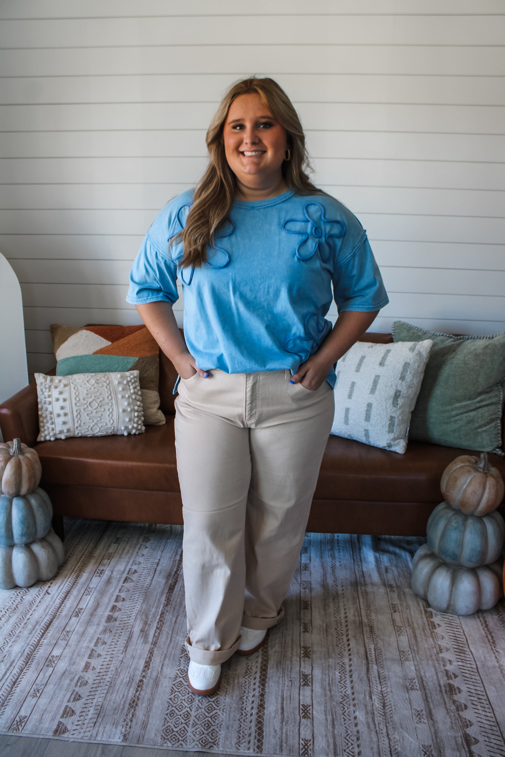 So cute and comfy, this floral top is a one-of-a-kind look for fall and beyond! The mineral washed cotton provides a vintage-inspired vibe, while the piping trim appliqués add interest and dimension. Featured in a loose crewneck silhouette with rolled edge details and a side split hem.