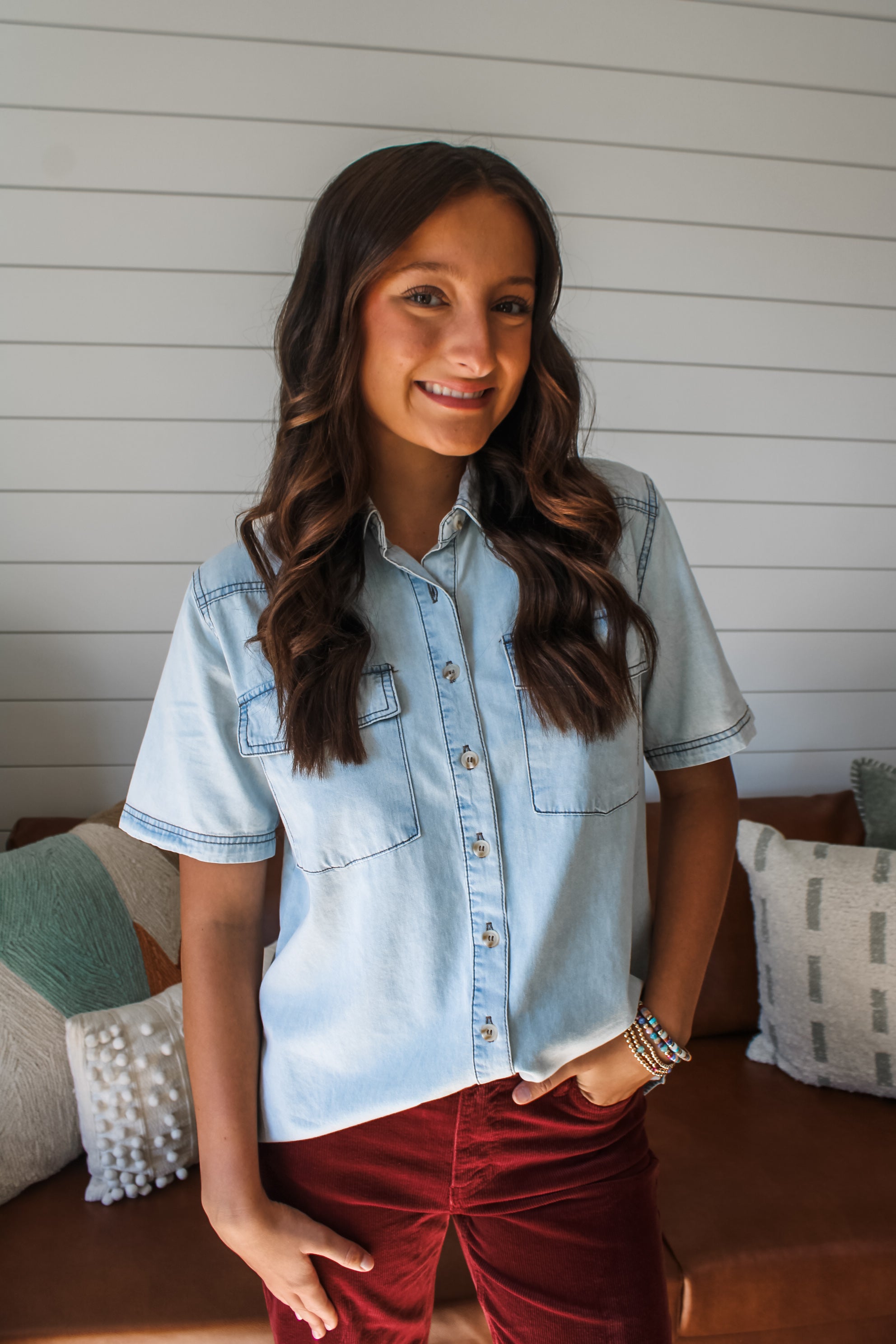 Denim essentials with an edge. The vintage-inspired light wash keeps this shirt timeless, while the relaxed fit gives it a modern silhouette that’s comfortable and perfect for layering. Featuring a collared neckline, stitching details, double chest pockets and a side slit, curved hem.
