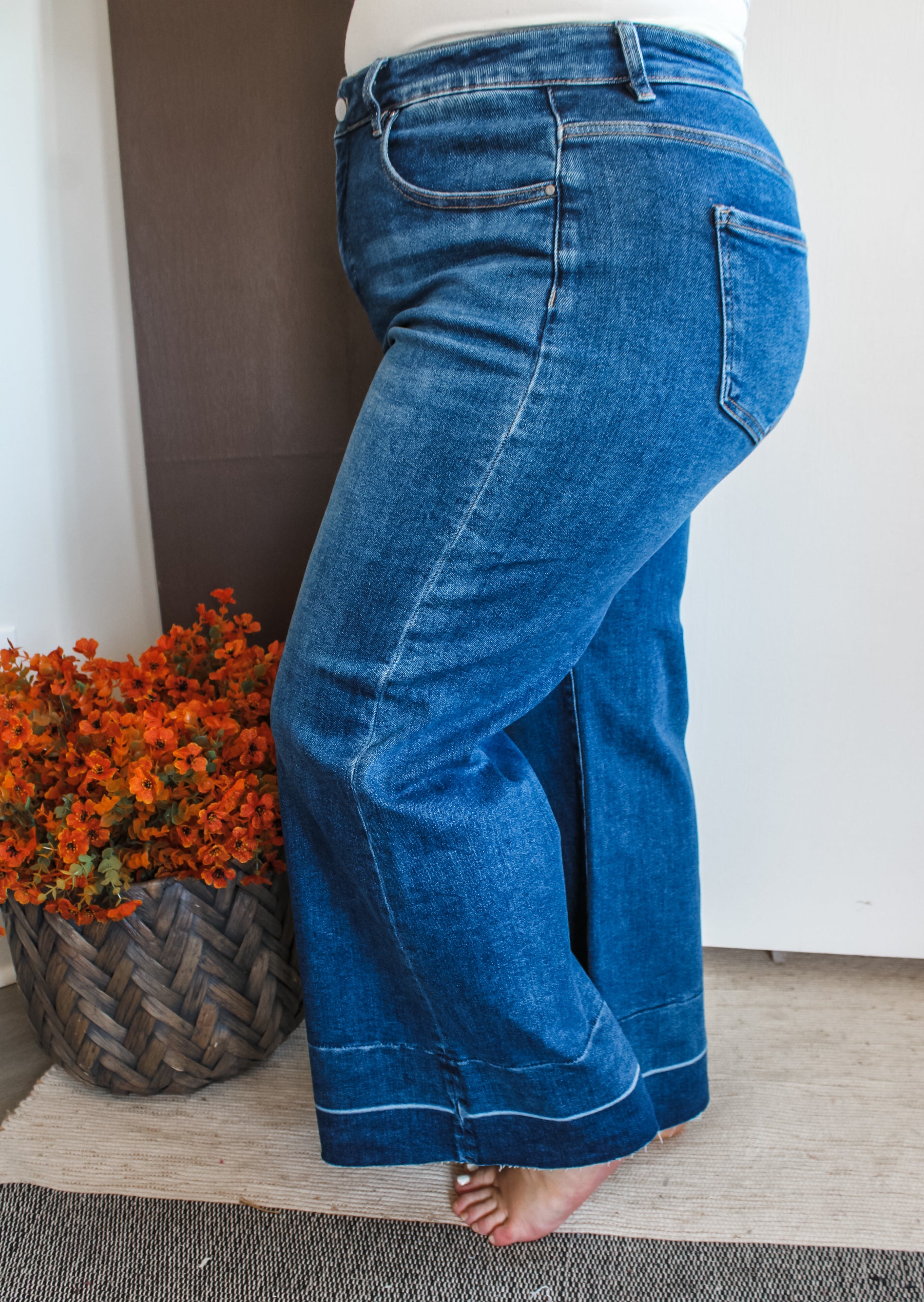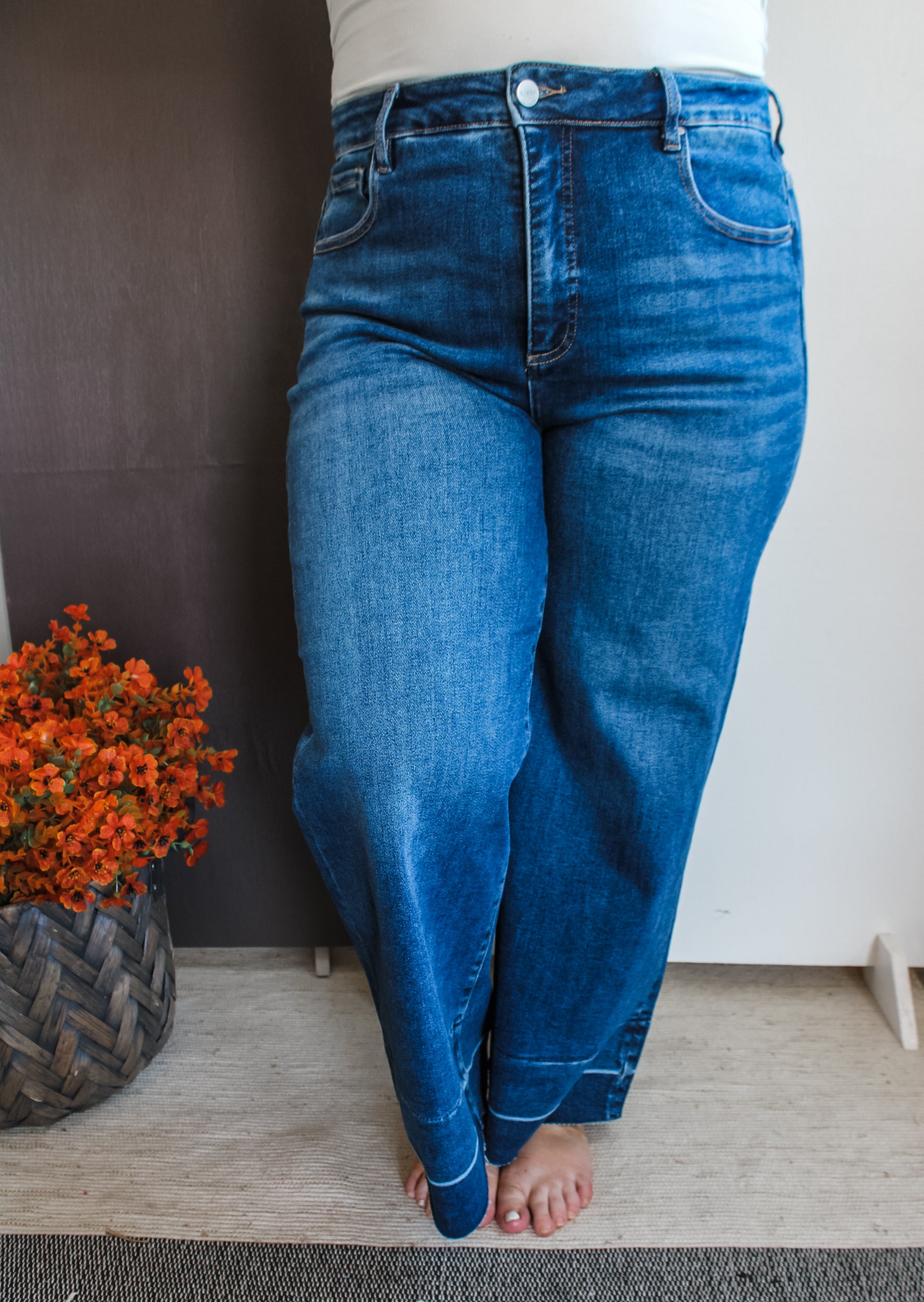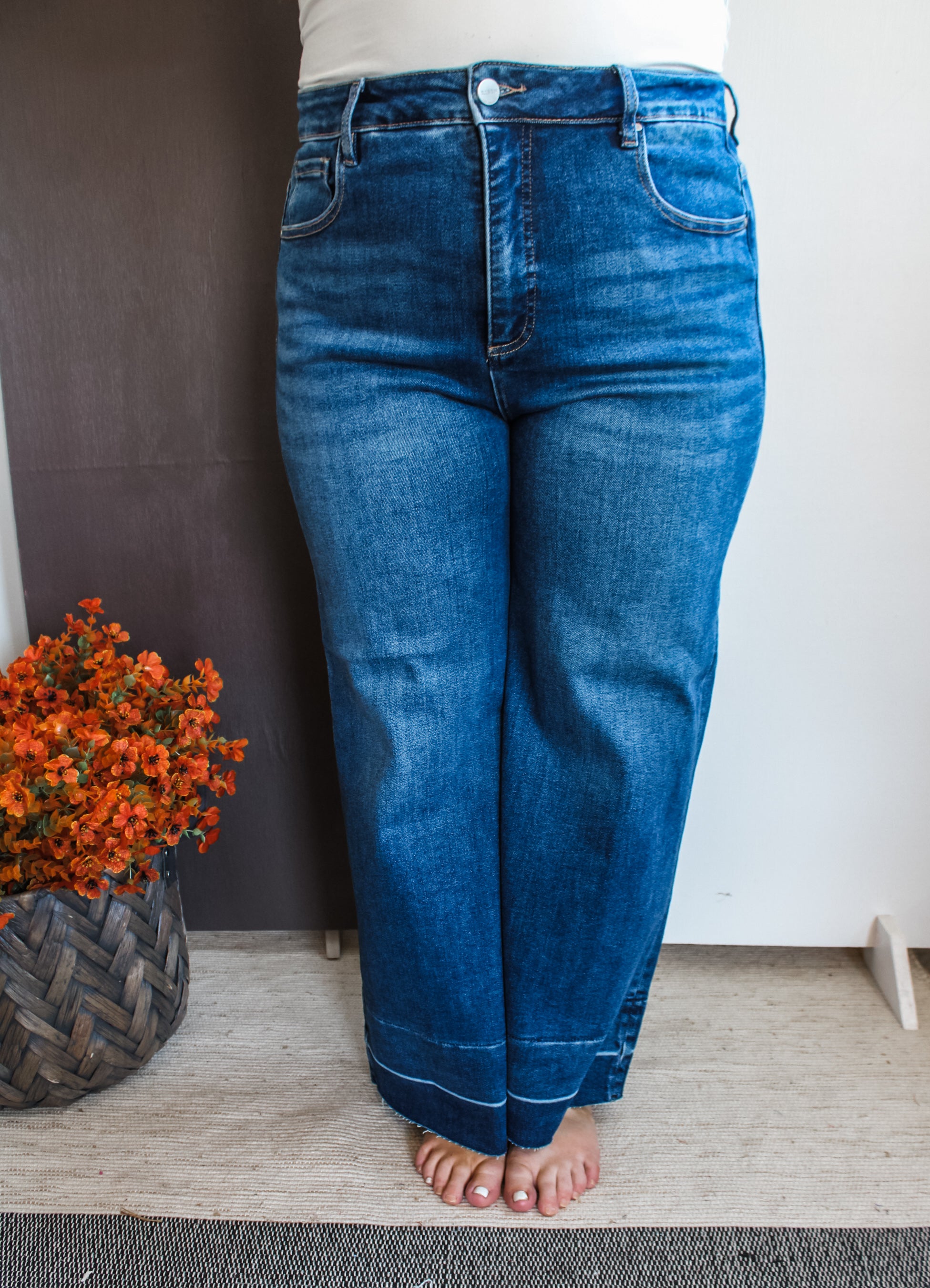 A timeless pair with an edge, our Lori Shadow Hem Jean is featured in a non-rip dark wash fabrication you can easily dress up or down all year long. The high rise, tummy control waistband and wide leg silhouette create a comfortable and flattering fit that hugs your curves. With a classic 5-pocket design, single button front and zip fly closure. 28.5” inseam, Risen. 93% Cotton, 5% Polyester, 2% Spandex. Model is 5’5” and is wearing 1X.