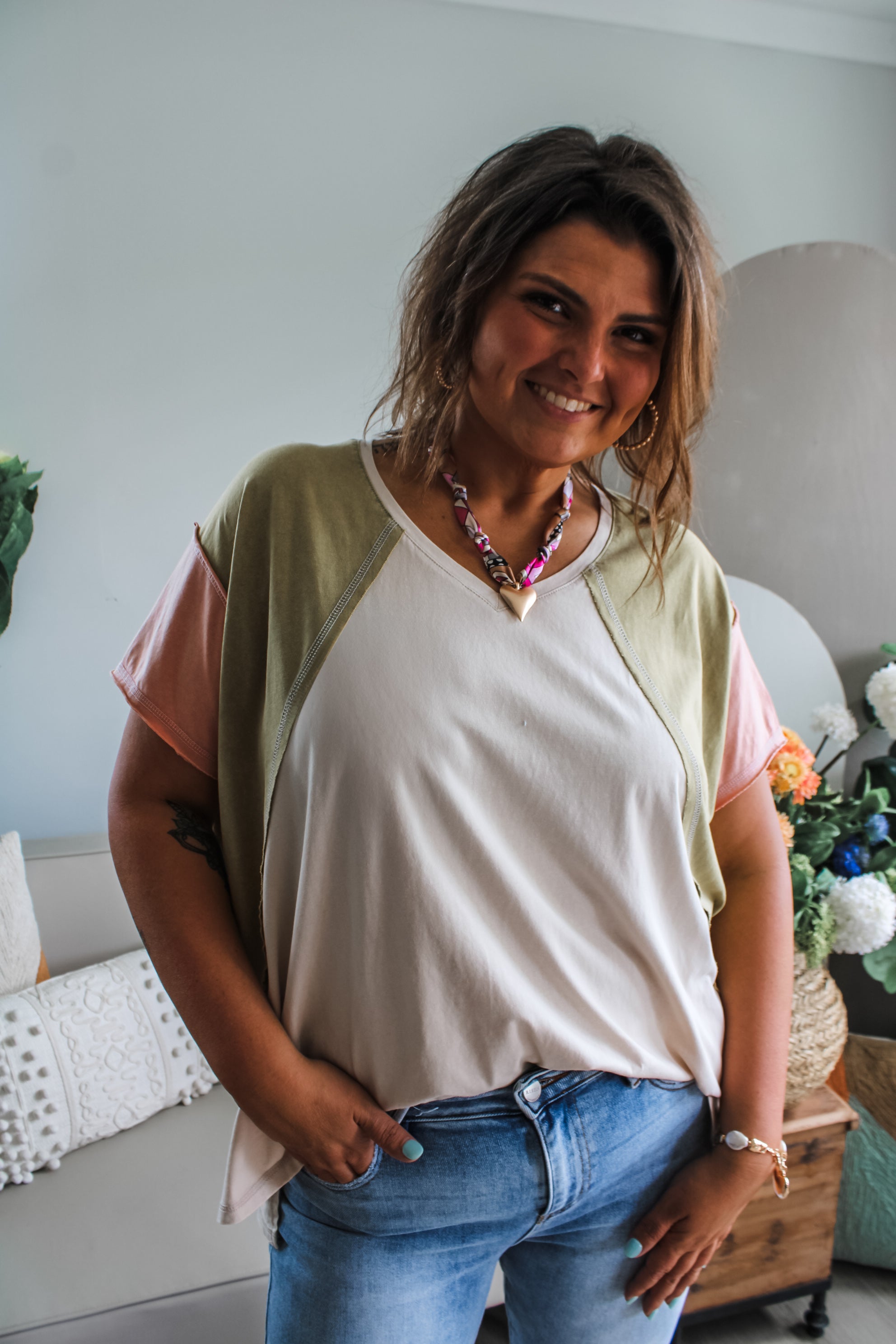 So cute in color block, this top is a playful summer staple! The garment dyed knit hangs comfortably over the body and the loose dolman silhouette gives it an easy fit. Exposed seaming details and the paneled fabrication add detail and interest. With a v neckline and slide slit, high low hem.