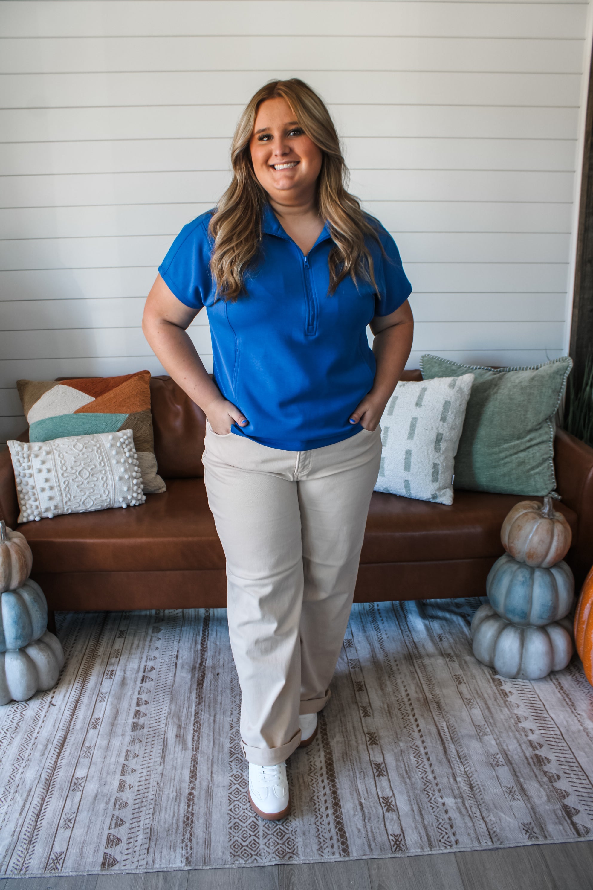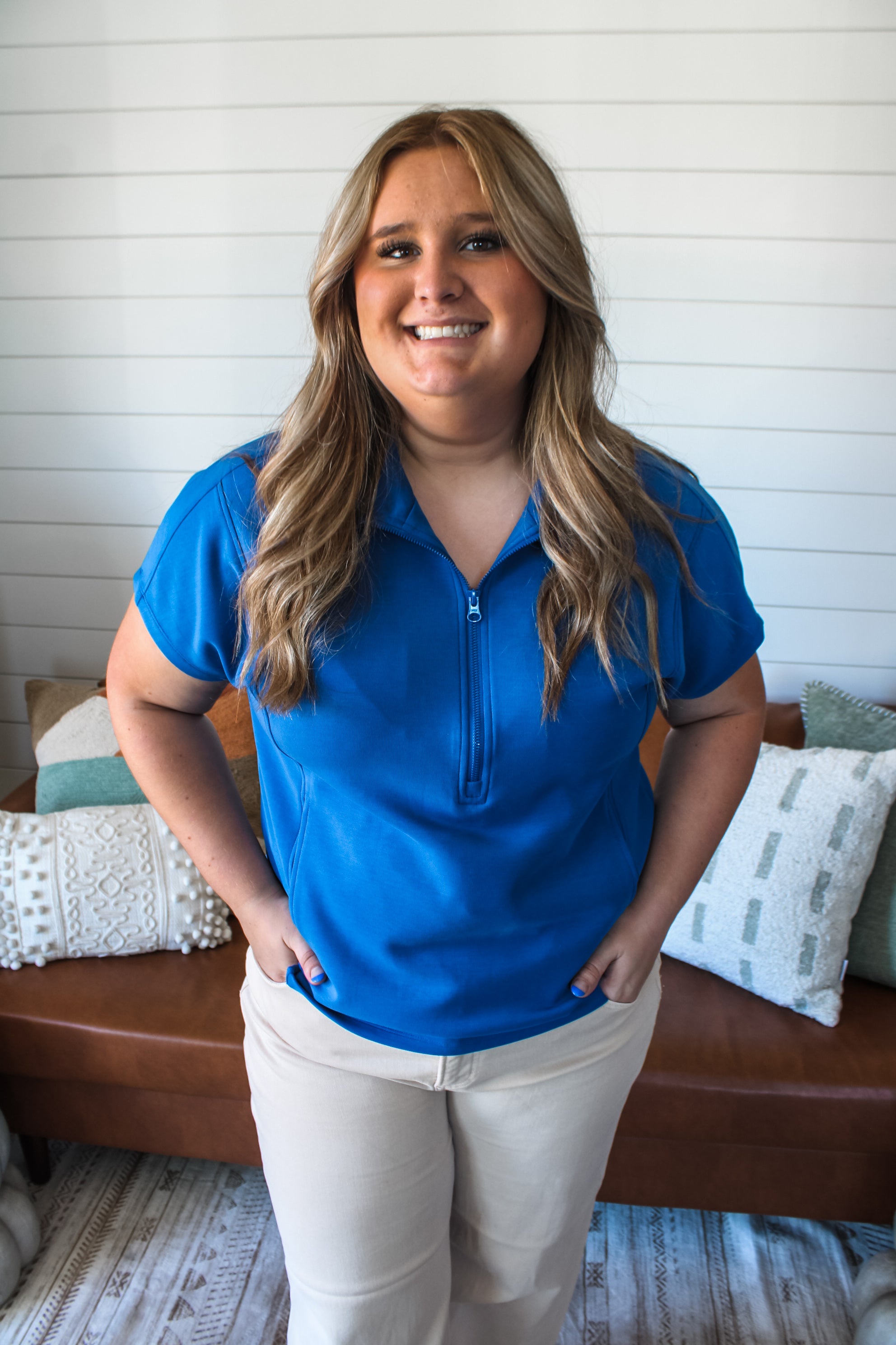 Buttery soft and sleek in a scuba stretch knit fabrication, this top is an easy everyday go-to! It’s a modern essential featuring a retro-inspired half zip neckline, defined seaming, kangaroo pocket and a relaxed fit.