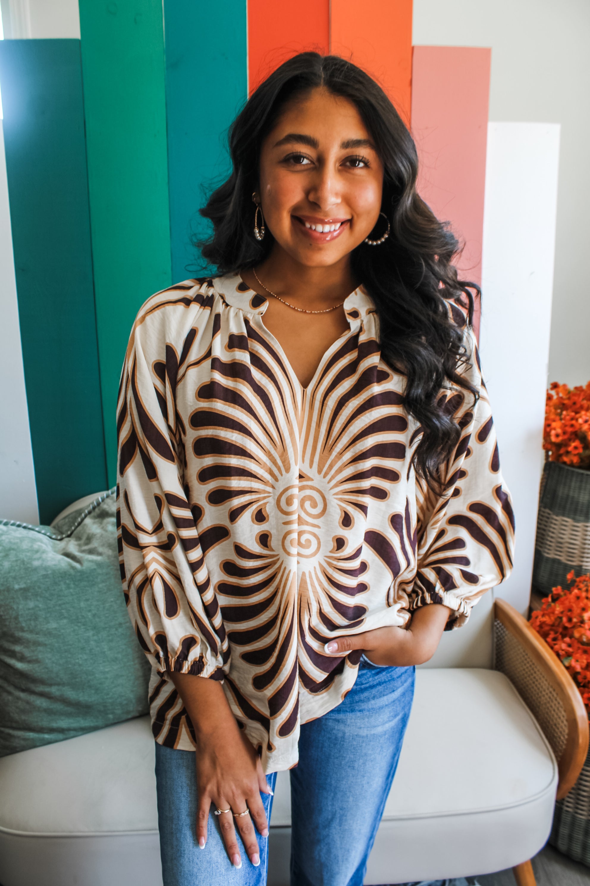 Think specialty prints and sophisticated pieces for a stylish wardrobe. This woven blouse is an eye-catching look whether you’re going out of town, attending a work event or celebrating fall occasions. Featured in a bold yet elegant print with a notched neckline, raglan sleeves and a flowy silhouette.