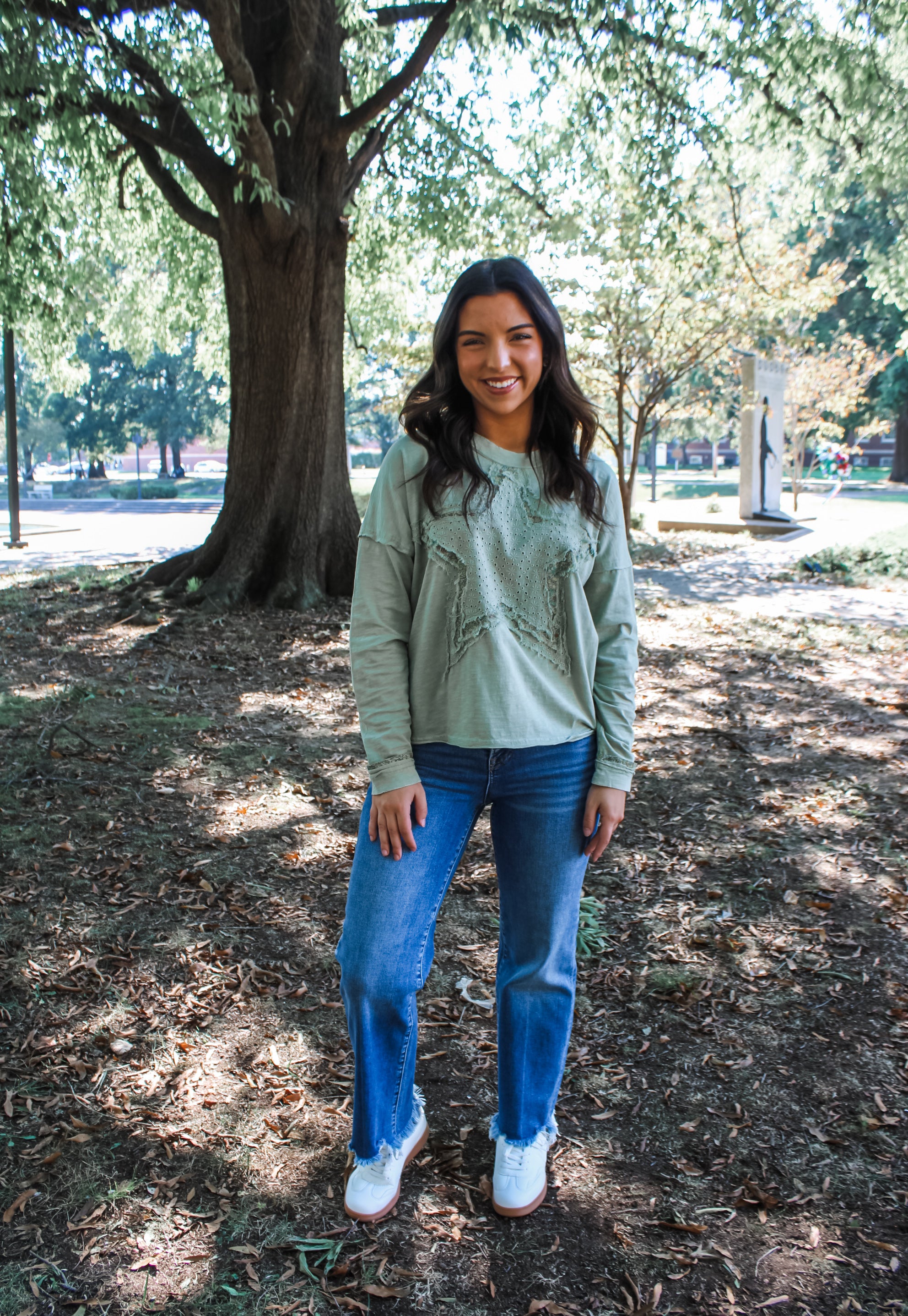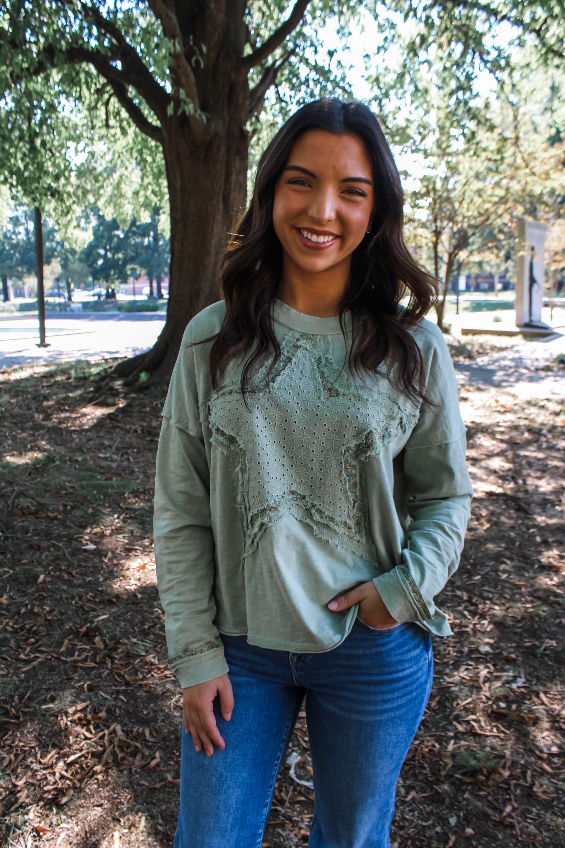 Have a starstruck style! This patchwork top is a pretty and playful look for everyday adventures and weekend outings! The layered stars design and eyelet lace panels are such eye-catching details, and the slub cotton knit gives it a breezy and comfortable feel. With a crewneck, rolled edge details and a relaxed silhouette.
