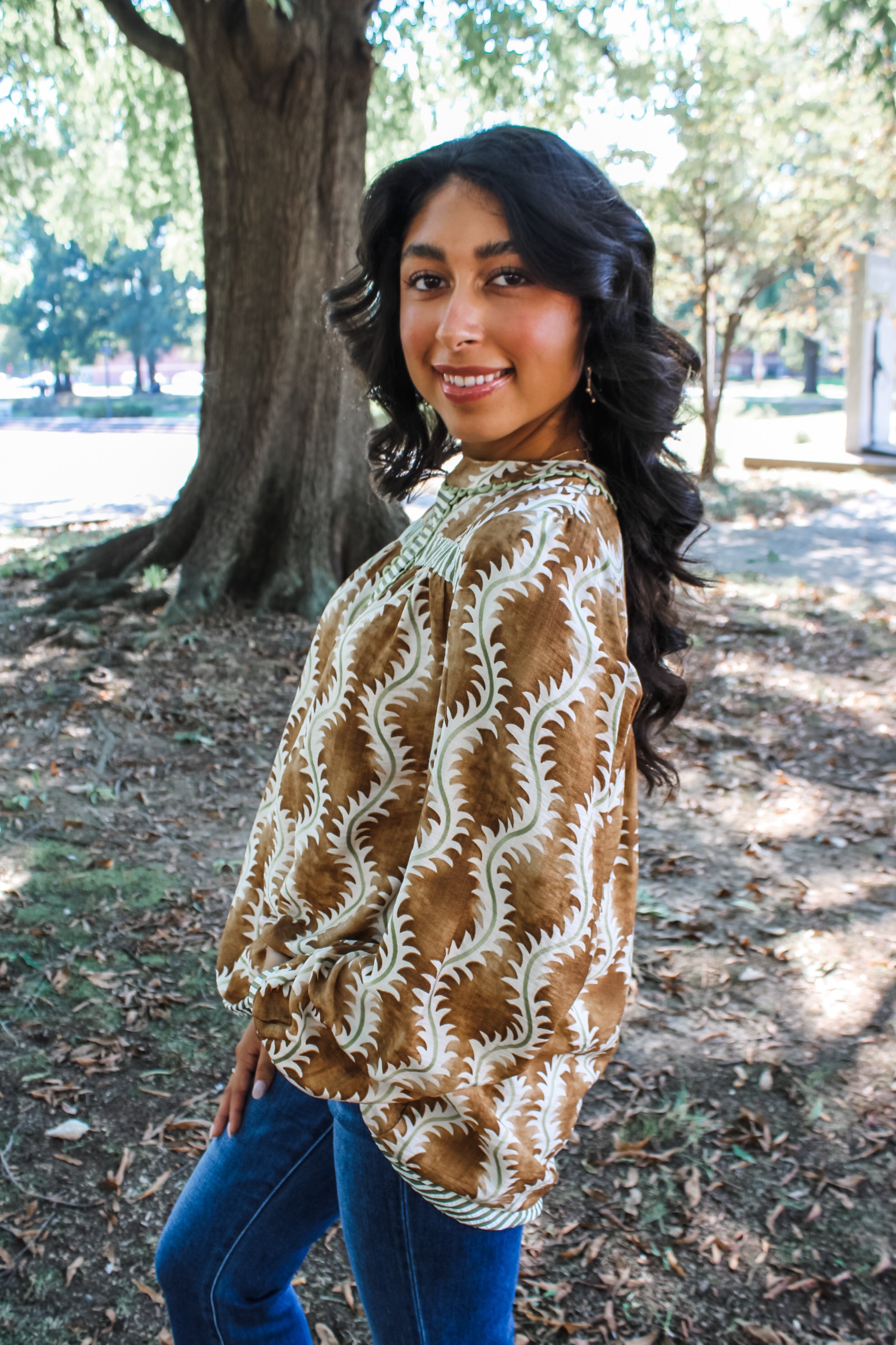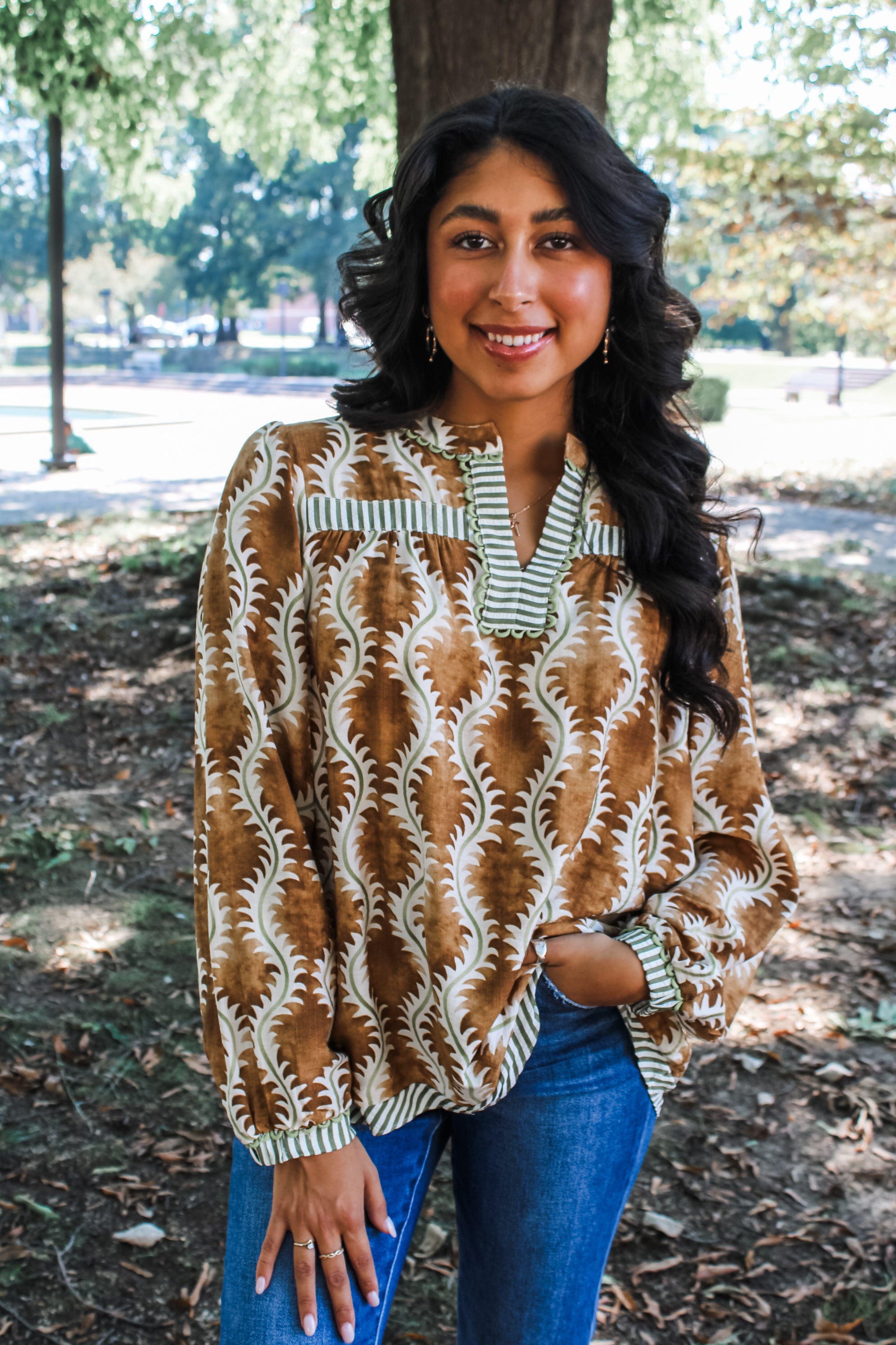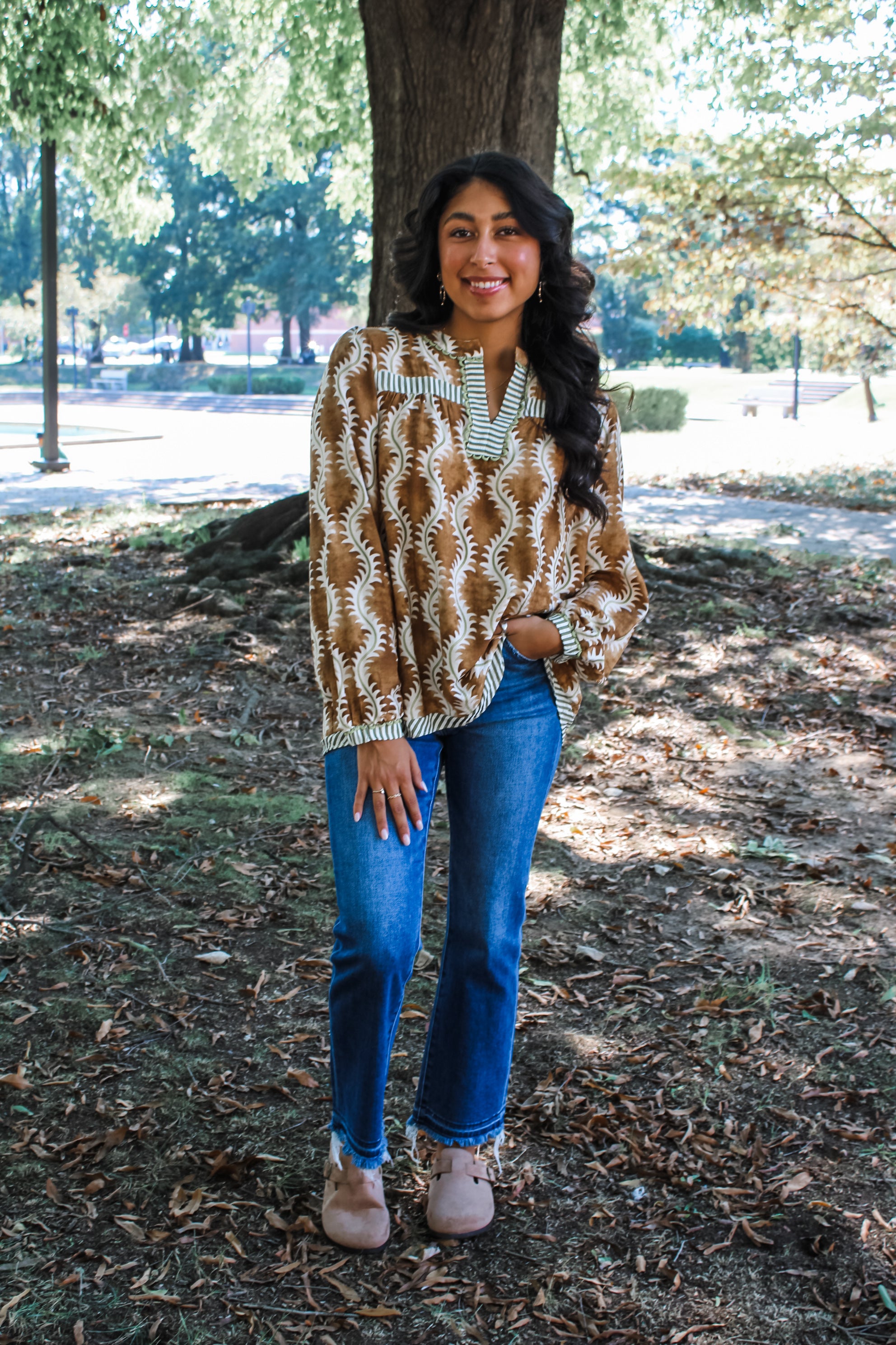 Step into fall with sophisticated prints. This eye-catching top can be dressy or casual depending on how you style it. The striped contrast and lace trim detailing takes it up a style notch, while the flowy silhouette keeps it feminine and flattering. Featuring a split v-neckline, puff sleeves and a contrast trim hem.