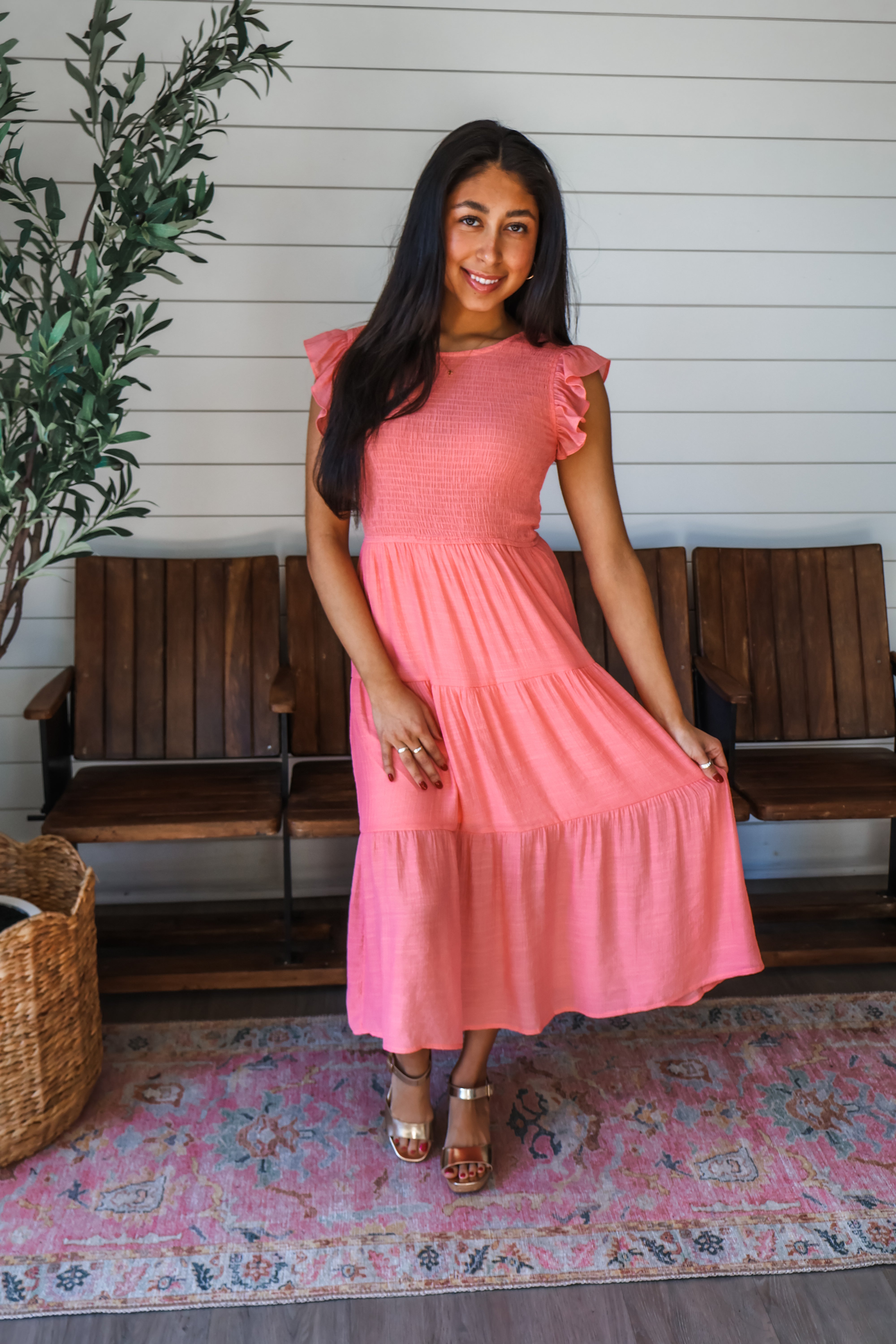 Flattering and feminine, this midi dress is an effortlessly elevated style whether you’re attending springtime events, taking a stroll downtown, or packing for a girls trip. Crafted from a lightweight textured woven for a breezy and comfortable feel, it features a smocked bodice that hugs your curves and flows down into a tiered ruffle skirt. With a crew neckline, flutter sleeves and a back button closure for easy on/off.