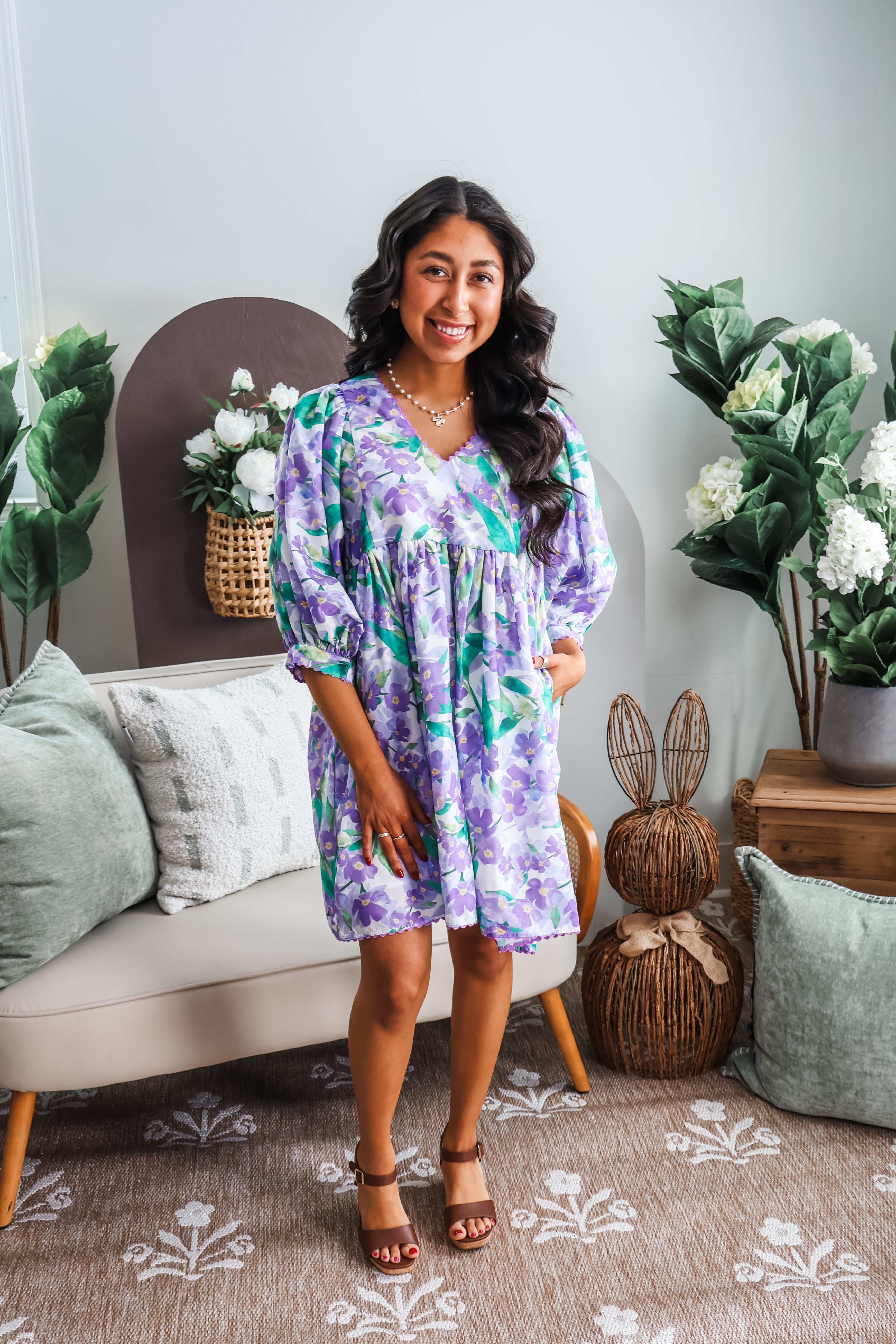Step into spring with statement-making florals! This printed dress perfectly encapsulates spring with its lavender tones and breezy babydoll silhouette. Crafted from a lightweight woven fabrication, it features ric rac lace trim details, a v-neckline, billowy puff sleeves, oh-so-essential side pockets and a ruffle hem.