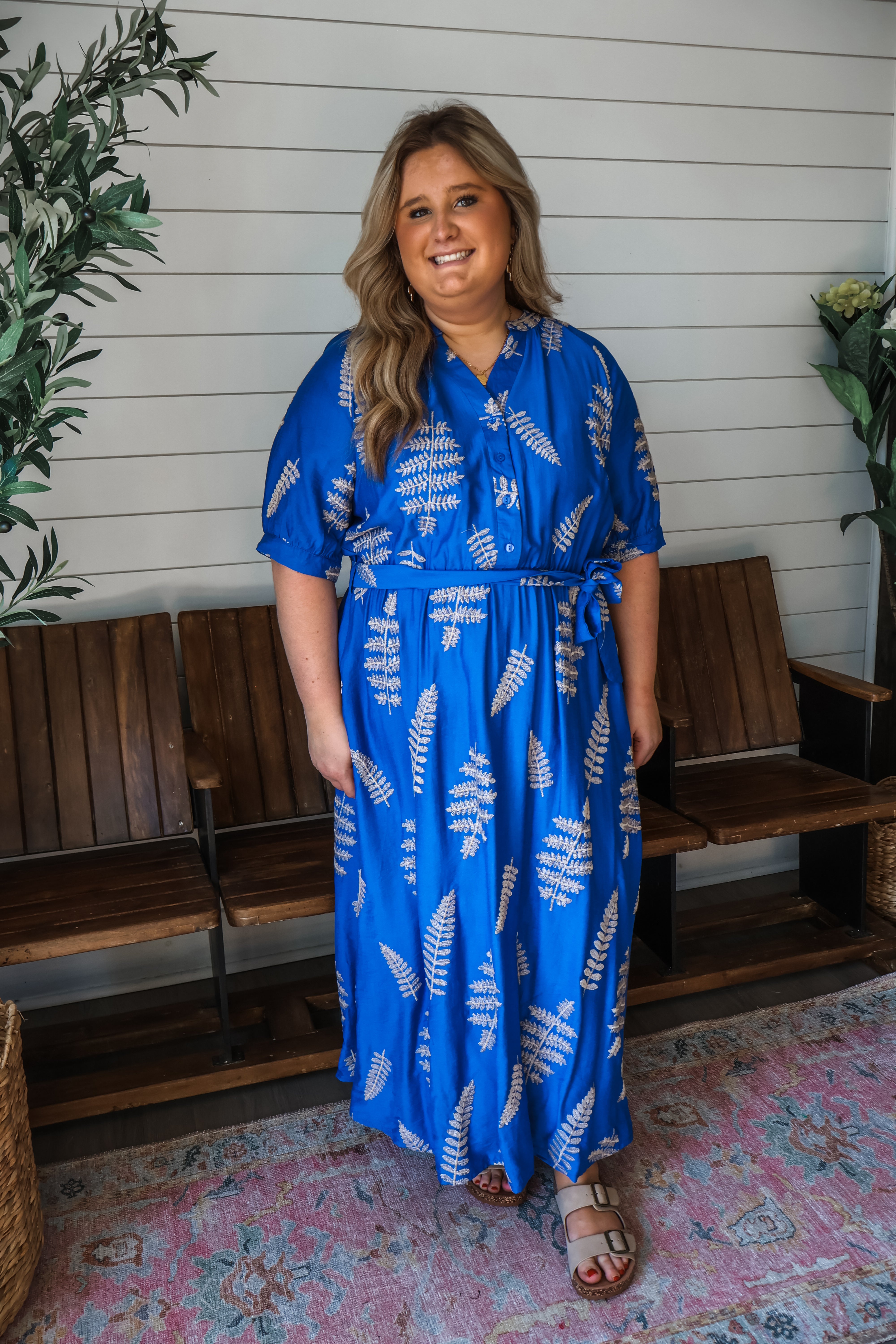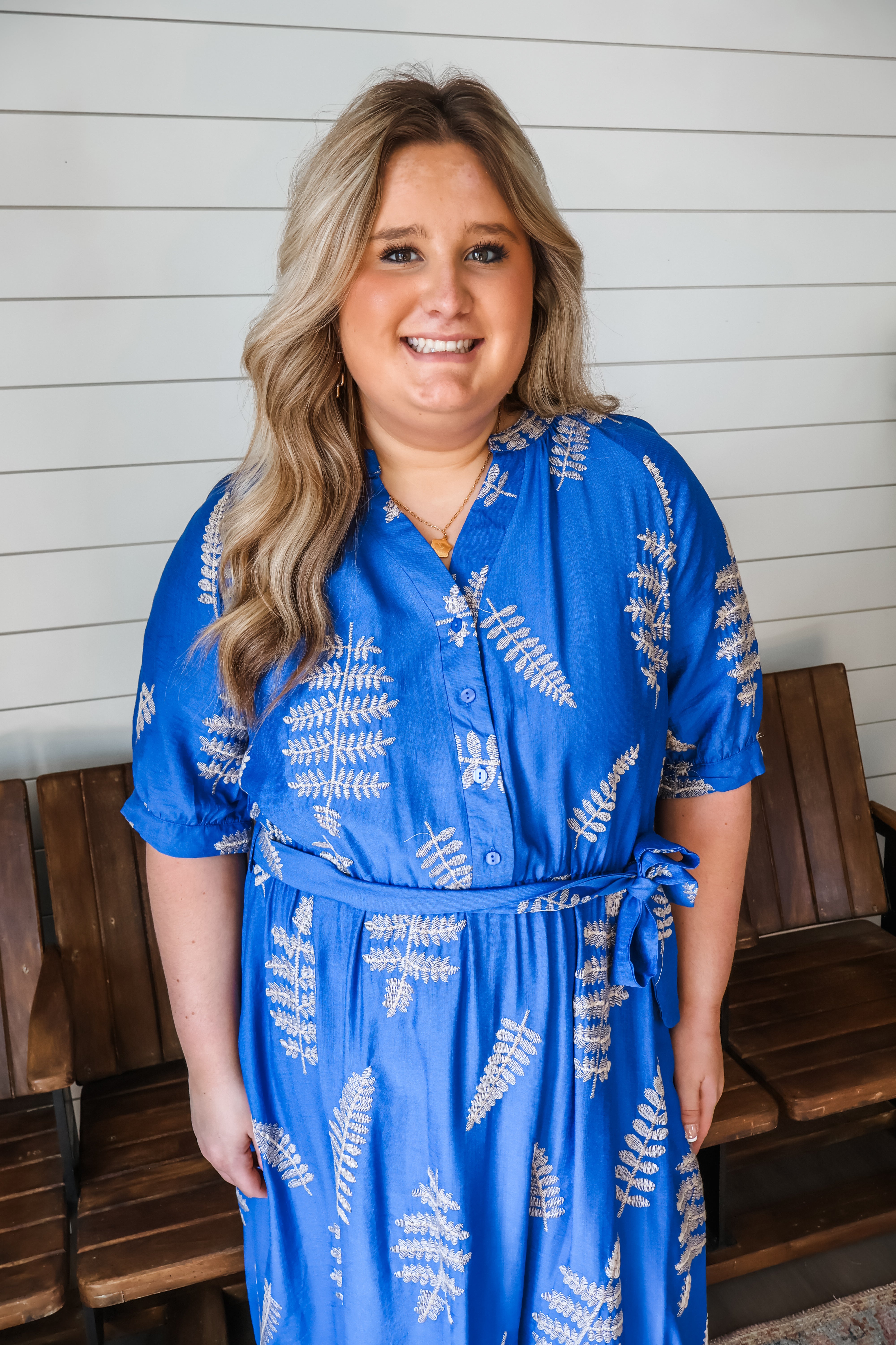 Step into spring with effortless sophistication. This statement-maker boasts botanical-inspired embroidery that contrasts so beautifully against the textured fabrication. Featuring a button front bodice with a split neckline, single button cuff sleeves, a matching sash belt and flowy hem. With an a-line silhouette for a flattering yet comfortable fit, this is a chic look that truly stands out.