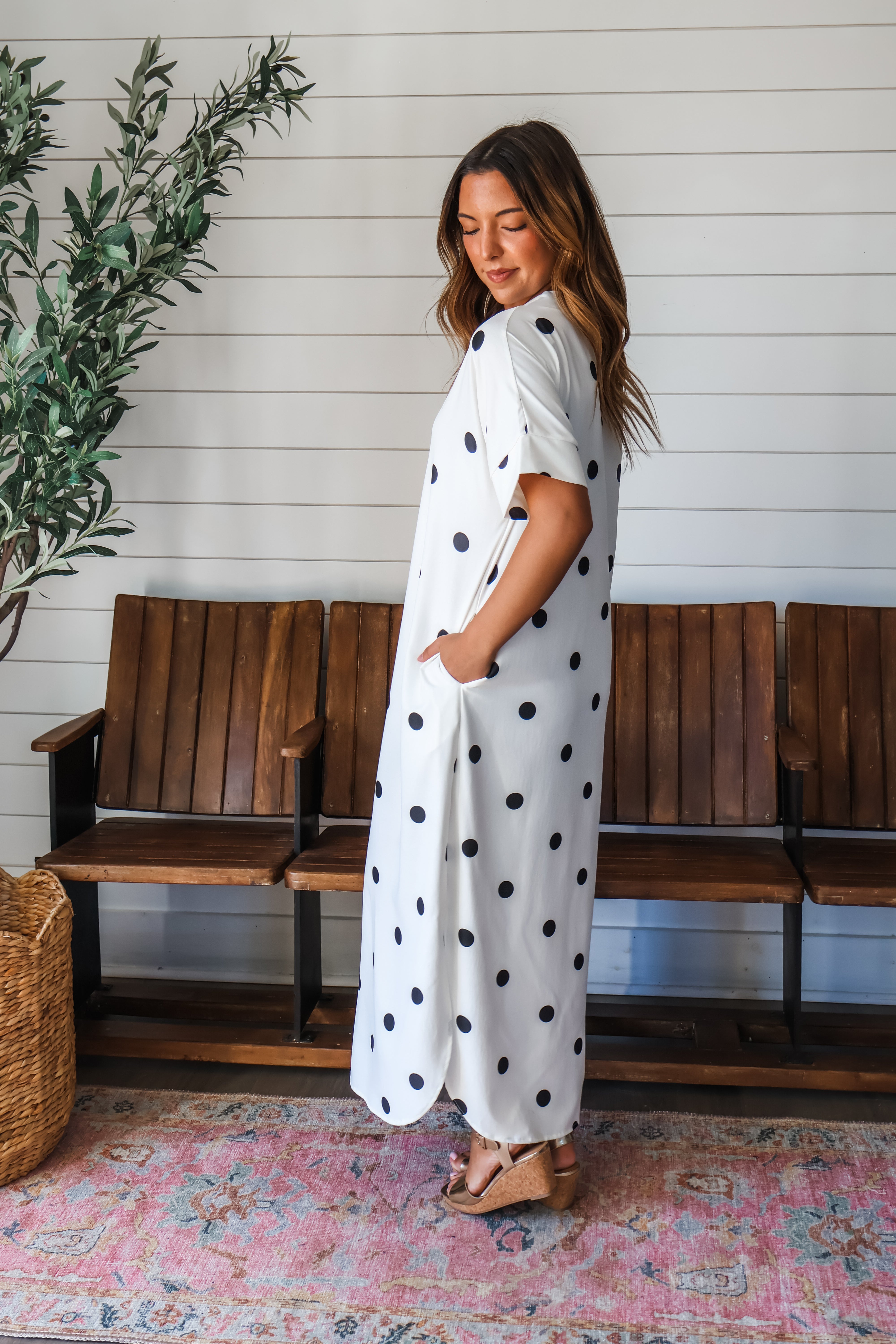 Step up your style in this new polka dot dress. MIDI length. Runs tts. Model is wearing the small and is 5”5. Small 0-4 medium 6-8 large 10-12. 100% polyester
