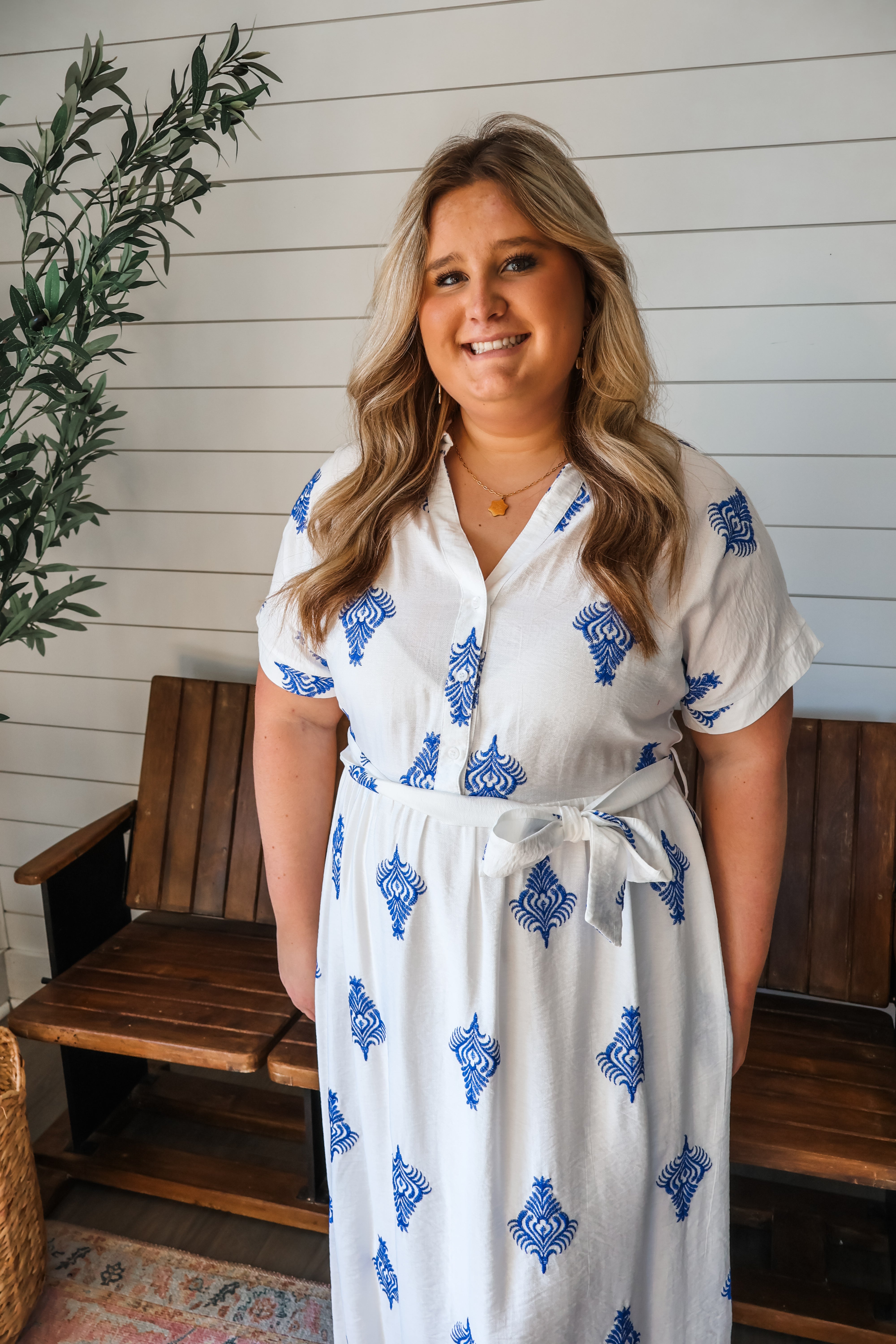 Step into spring with elegant details and effortless silhouettes. This sophisticated dress boasts a botanical-inspired embroidery that stands out beautifully against the textured fabrication. Featuring a button front bodice with a collared neckline, dolman sleeves and a matching sash belt. With an a-line silhouette for a flattering yet comfortable fit, this is a chic look that truly stands out.