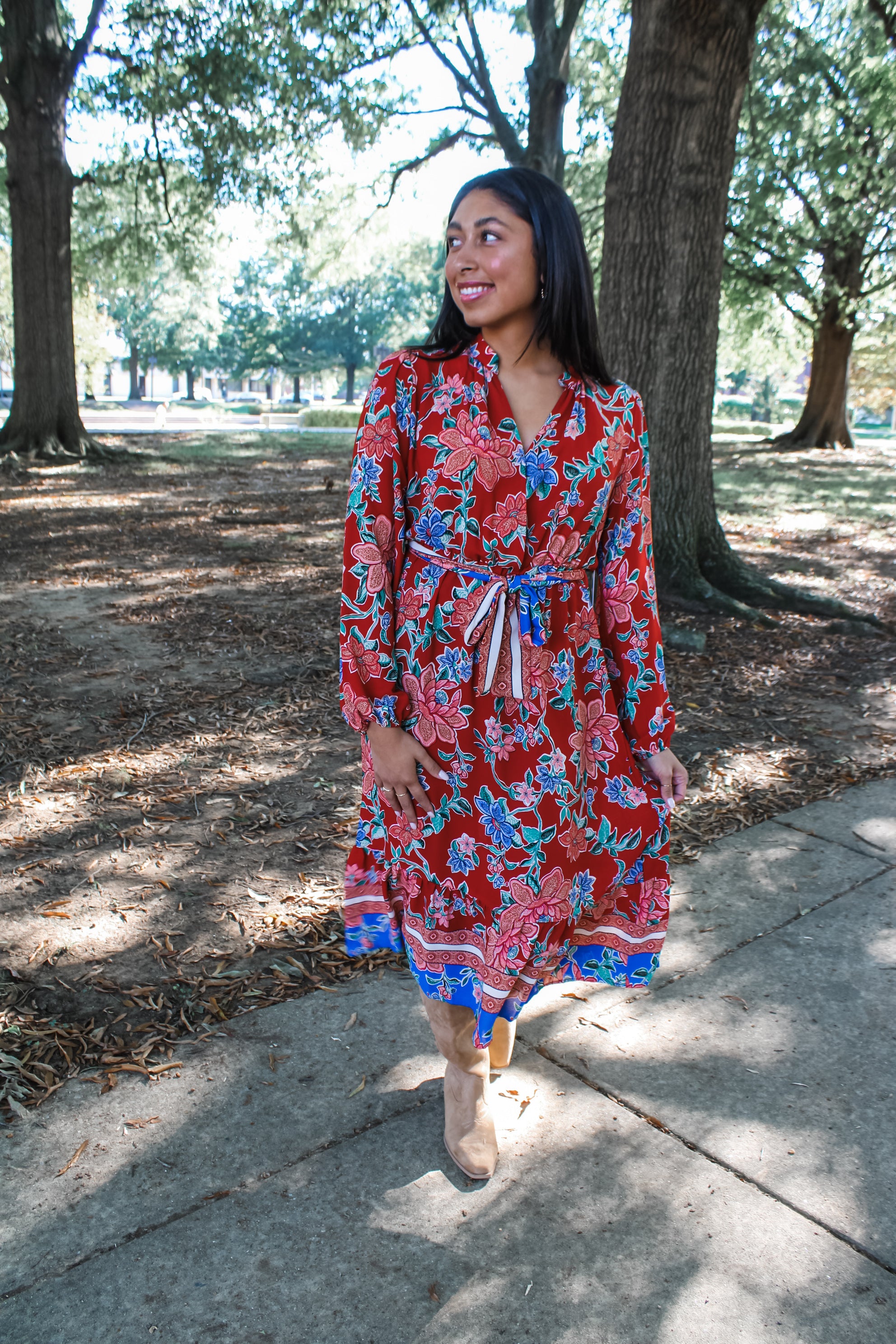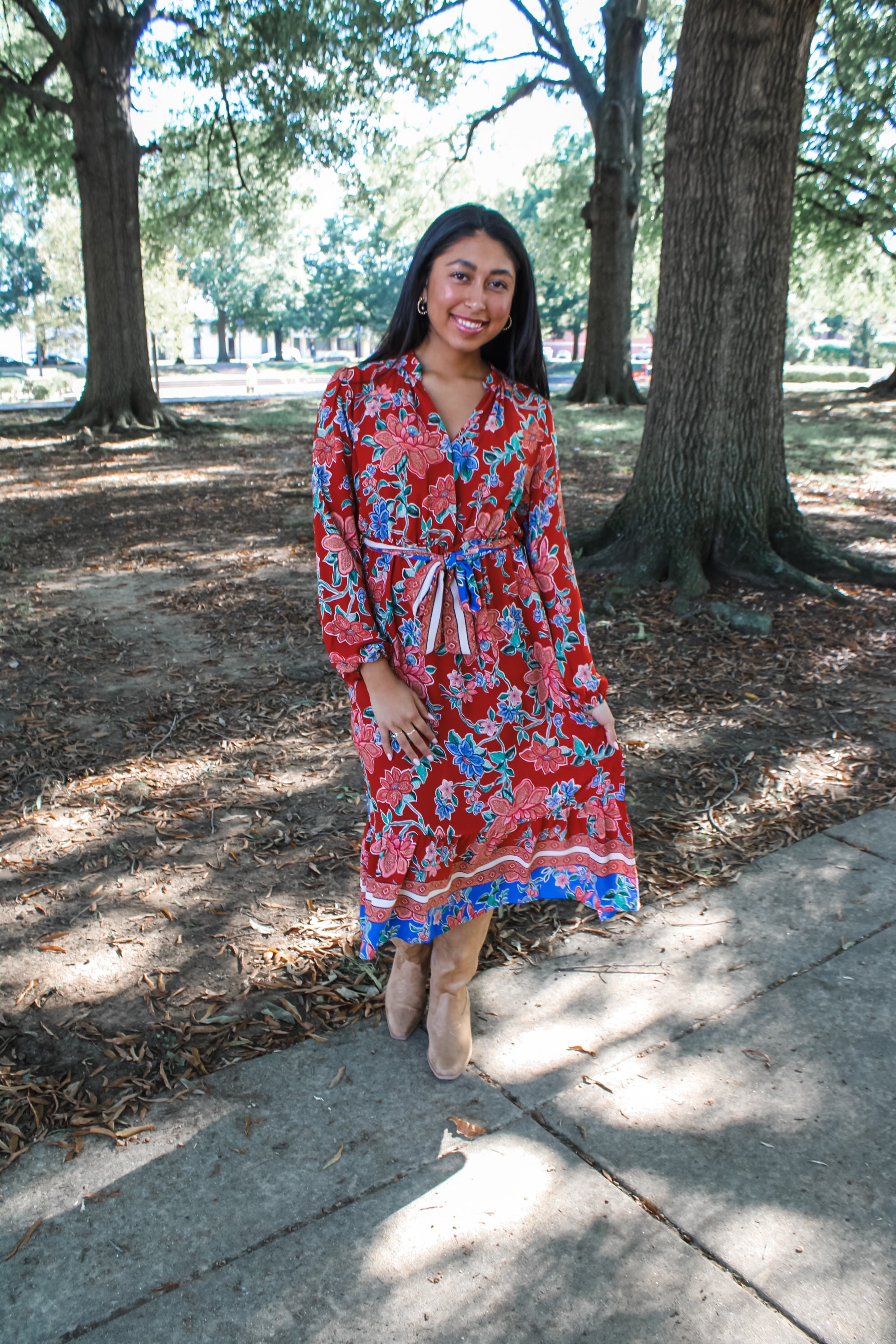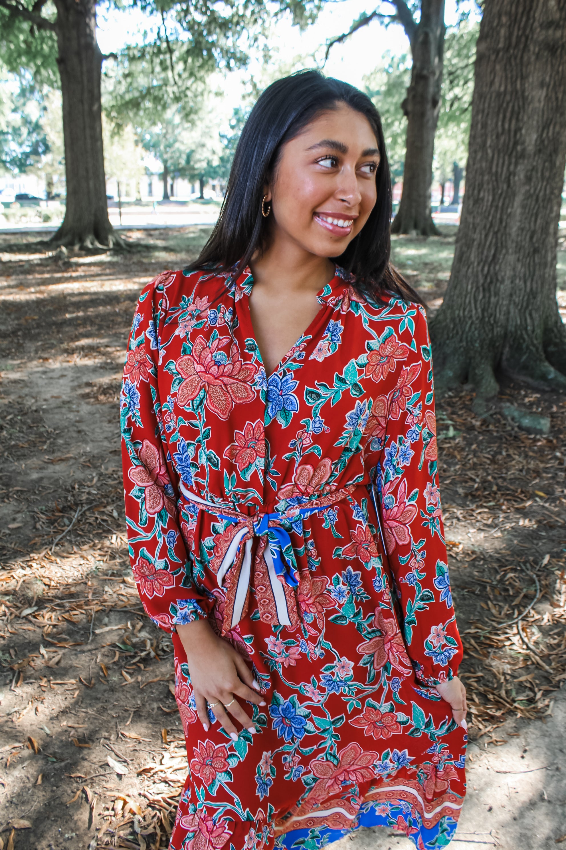 Step into the season with a printed midi that evokes ease and elegance. This striking red floral is a one-and-done look you can dress up or down all year long. Featuring a snap front bodice, balloon sleeves and a ruffle trim hem. With a classic a-line silhouette and matching sash belt for a comfortable yet so-flattering fit.