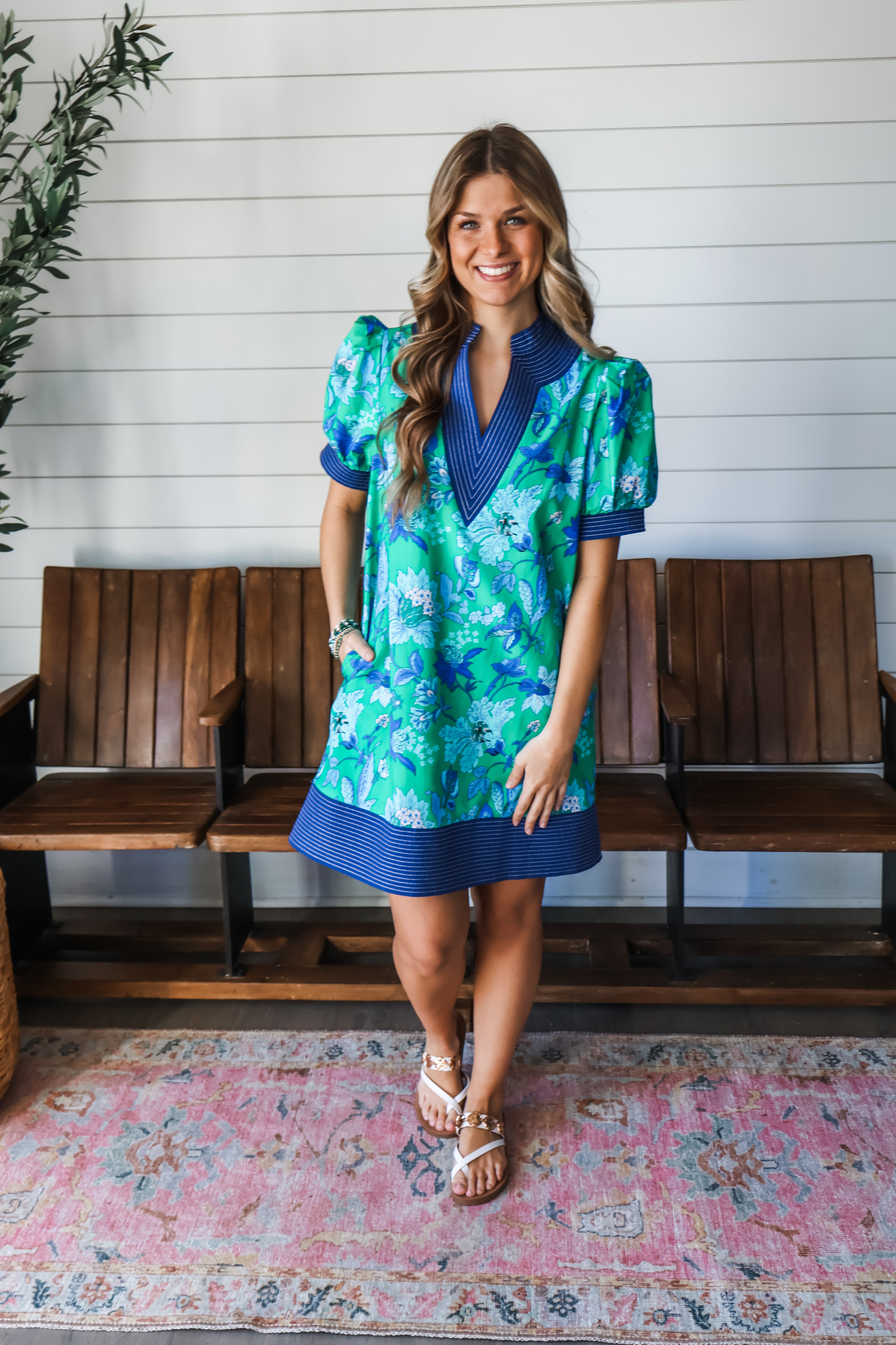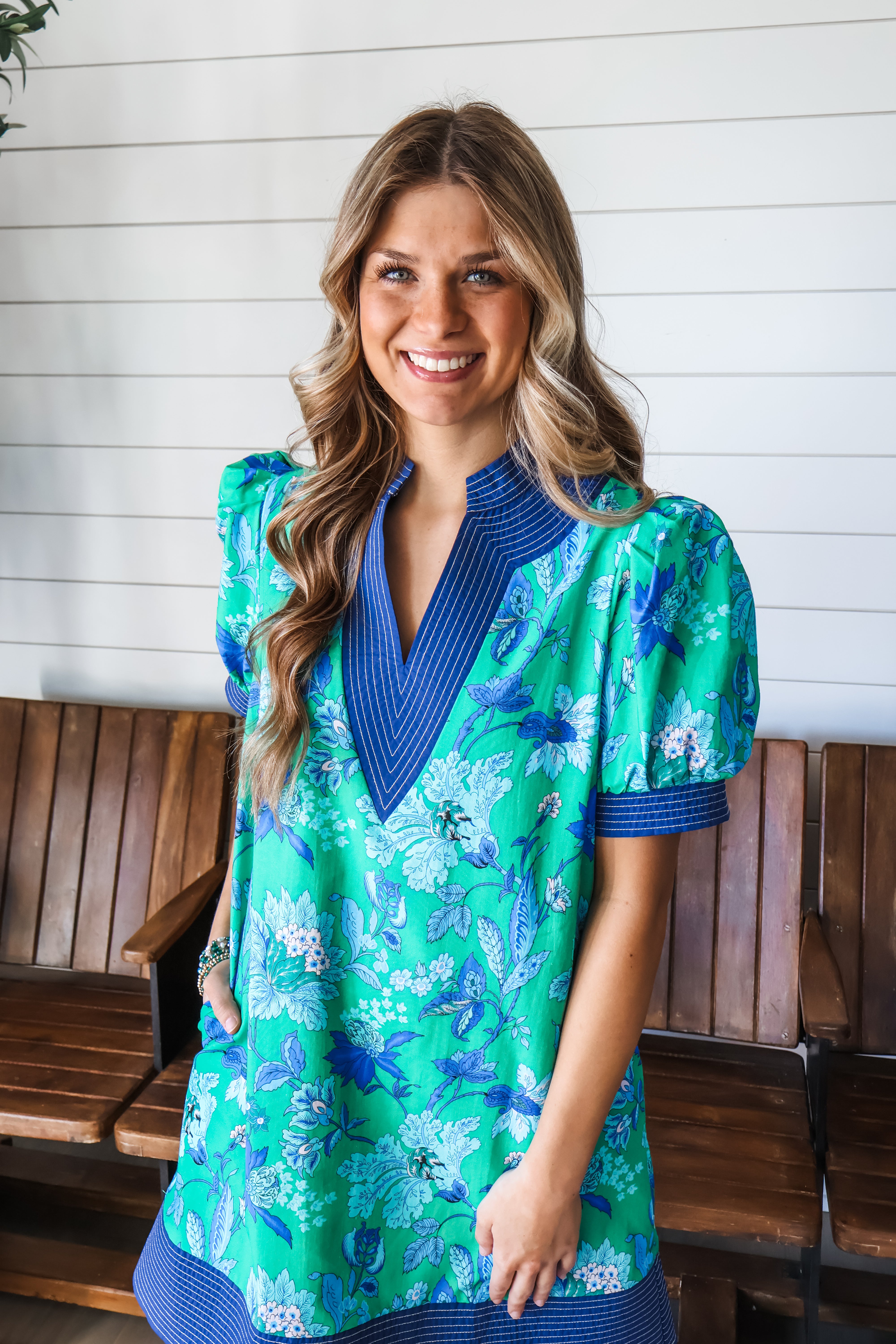 A spring style in full bloom, this floral shift dress will make a statement wherever you go! Crafted from a textured cotton fabrication, it features a split neckline, puff sleeves and oh-so-essential side pockets. The color trim design and stitching details add contrast and interest, while the simple silhouette provides an easy fit that flatters all. It’s an eye-catching and elegant look that’s perfect for garden parties and springtime gatherings.