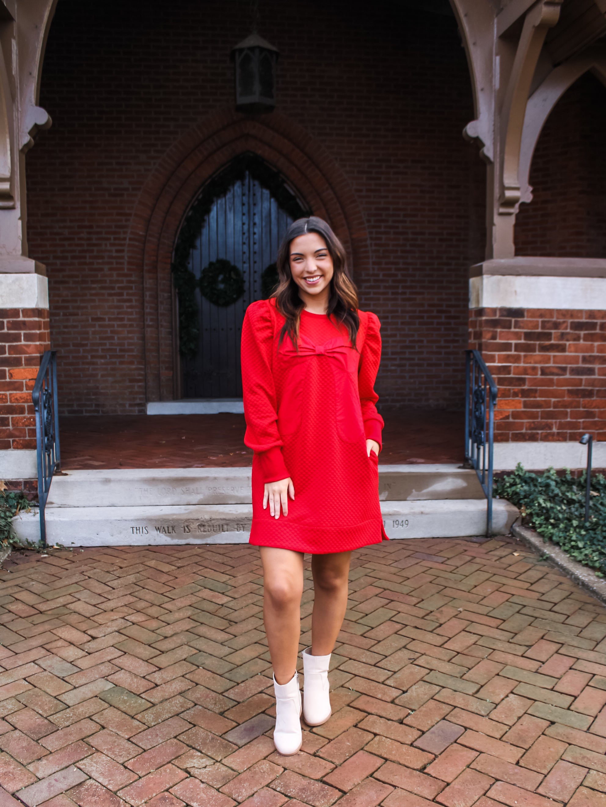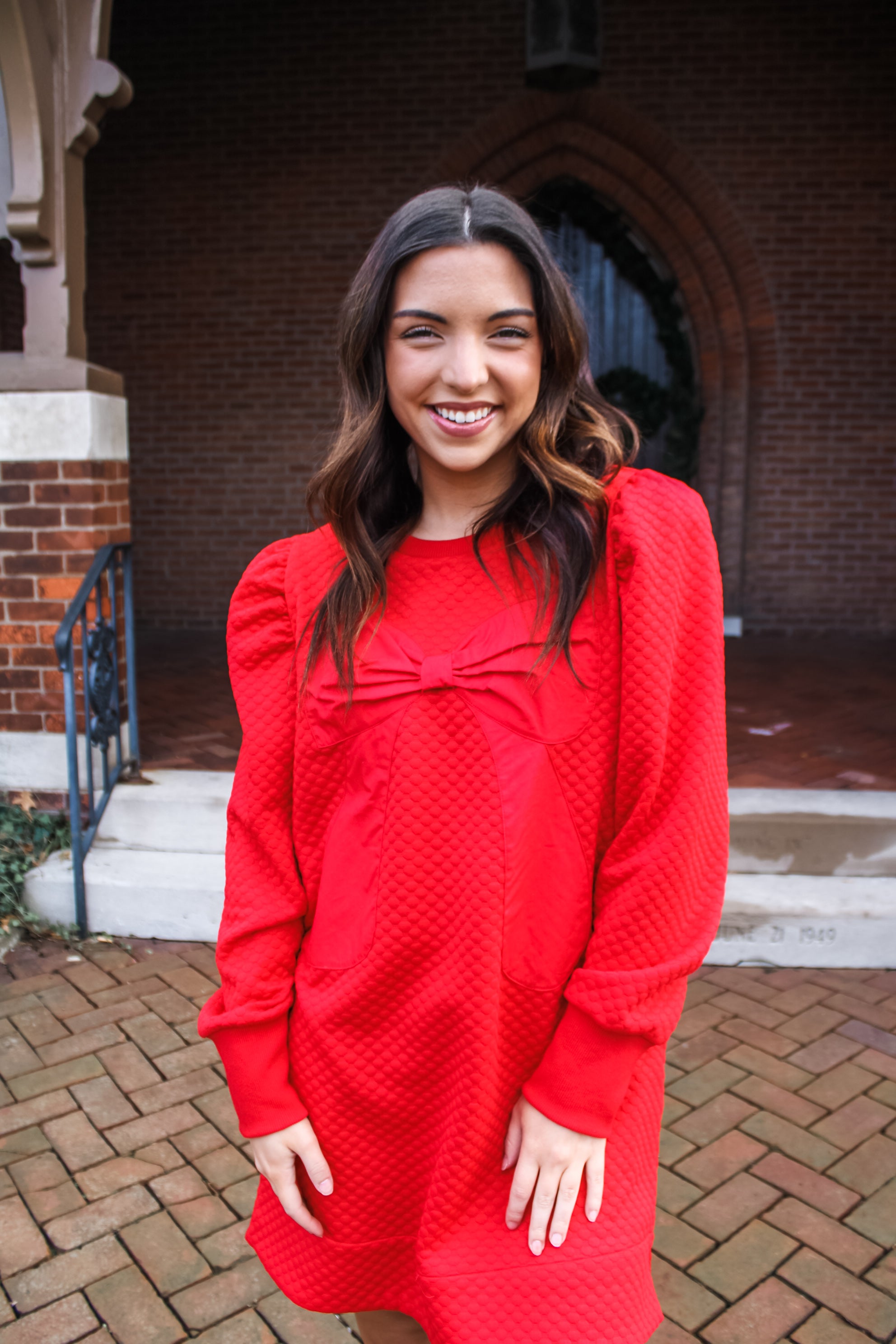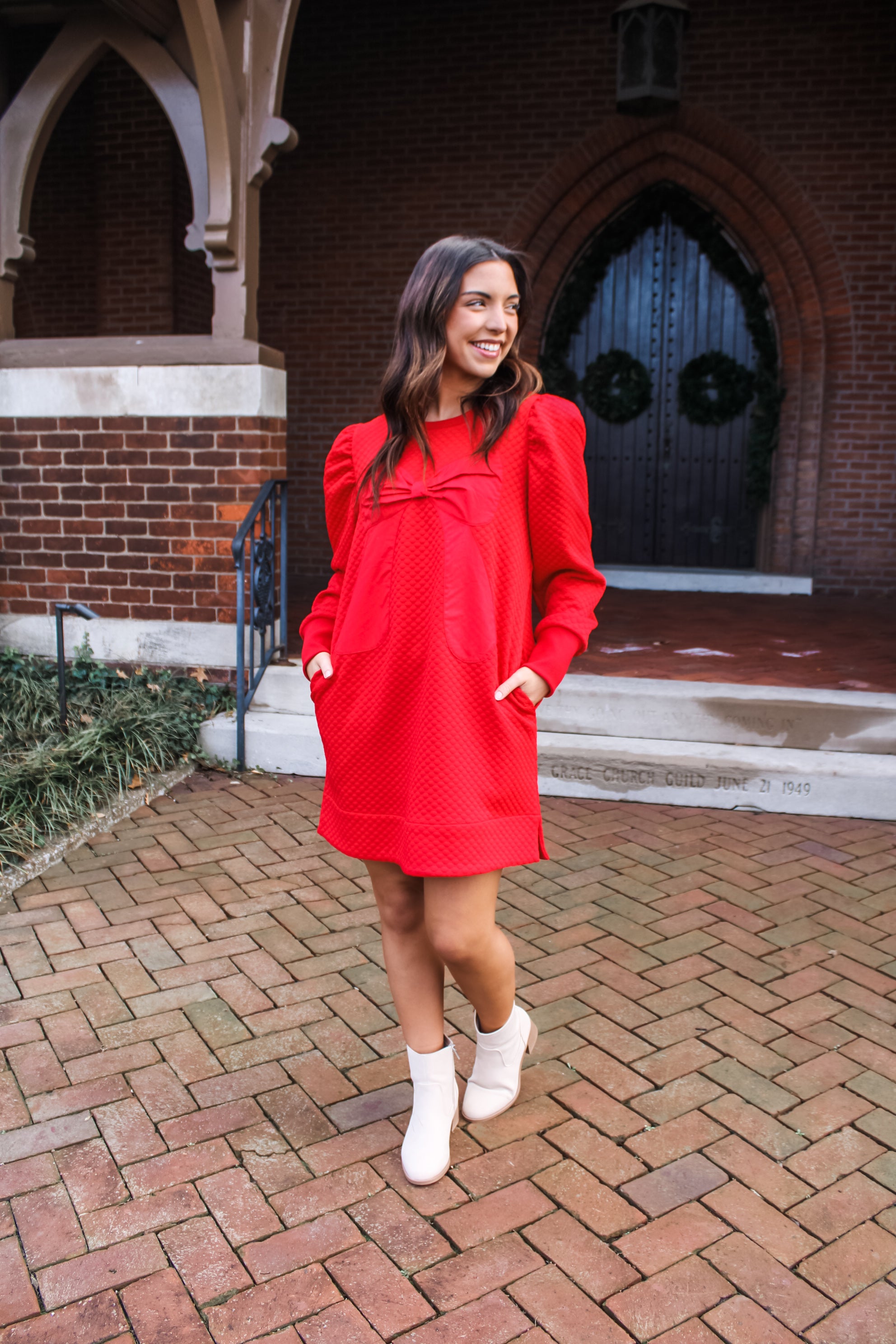 Updated classics for a stylish season. This striking red dress gets a playful update with a woven bow that contrasts beautifully against the textured knit fabrication. Featuring a crew neckline, puff sleeves, oh-so-essential side pockets and rib finishing. With a simple a-line silhouette for a comfortable and flattering fit.